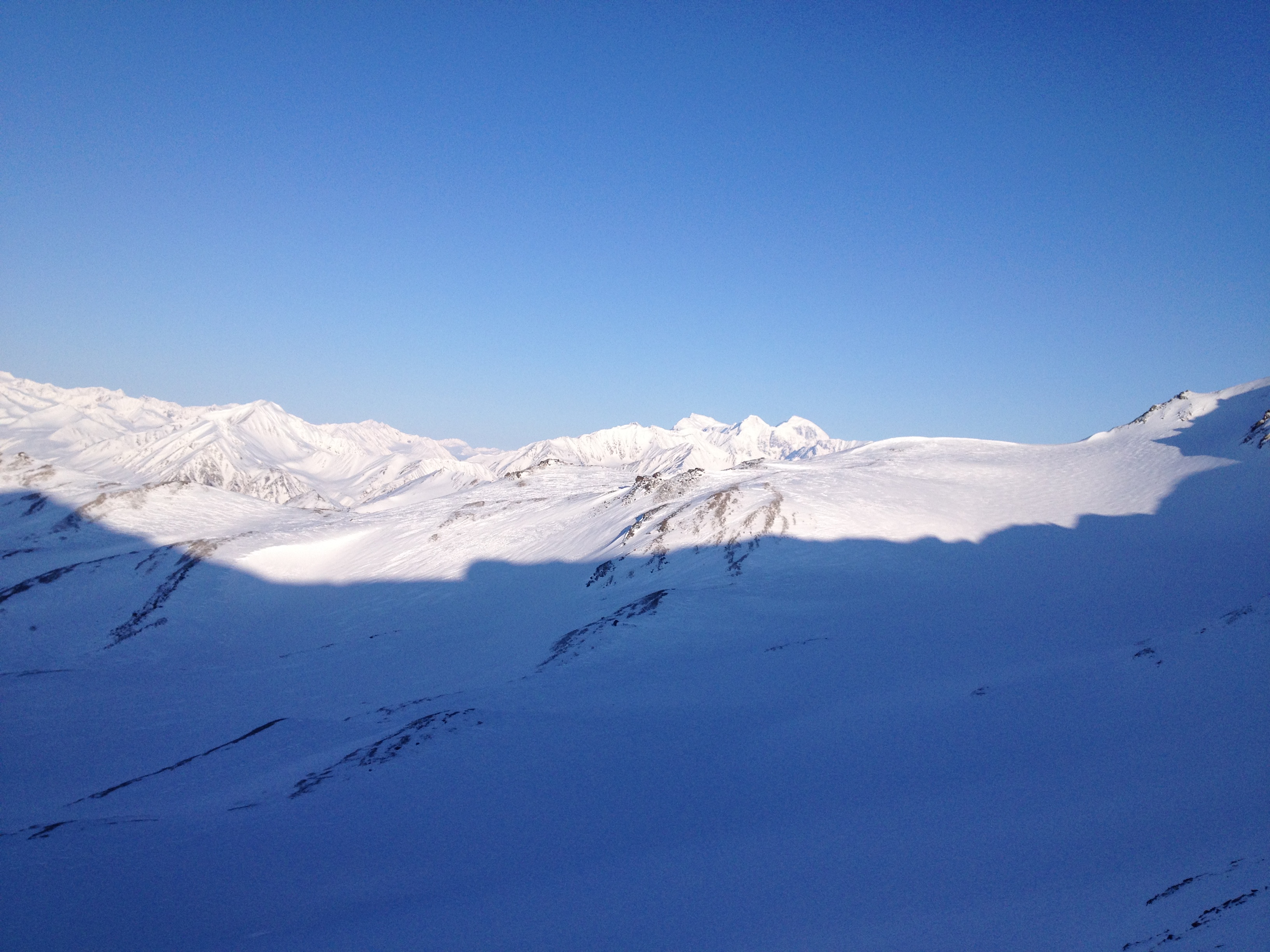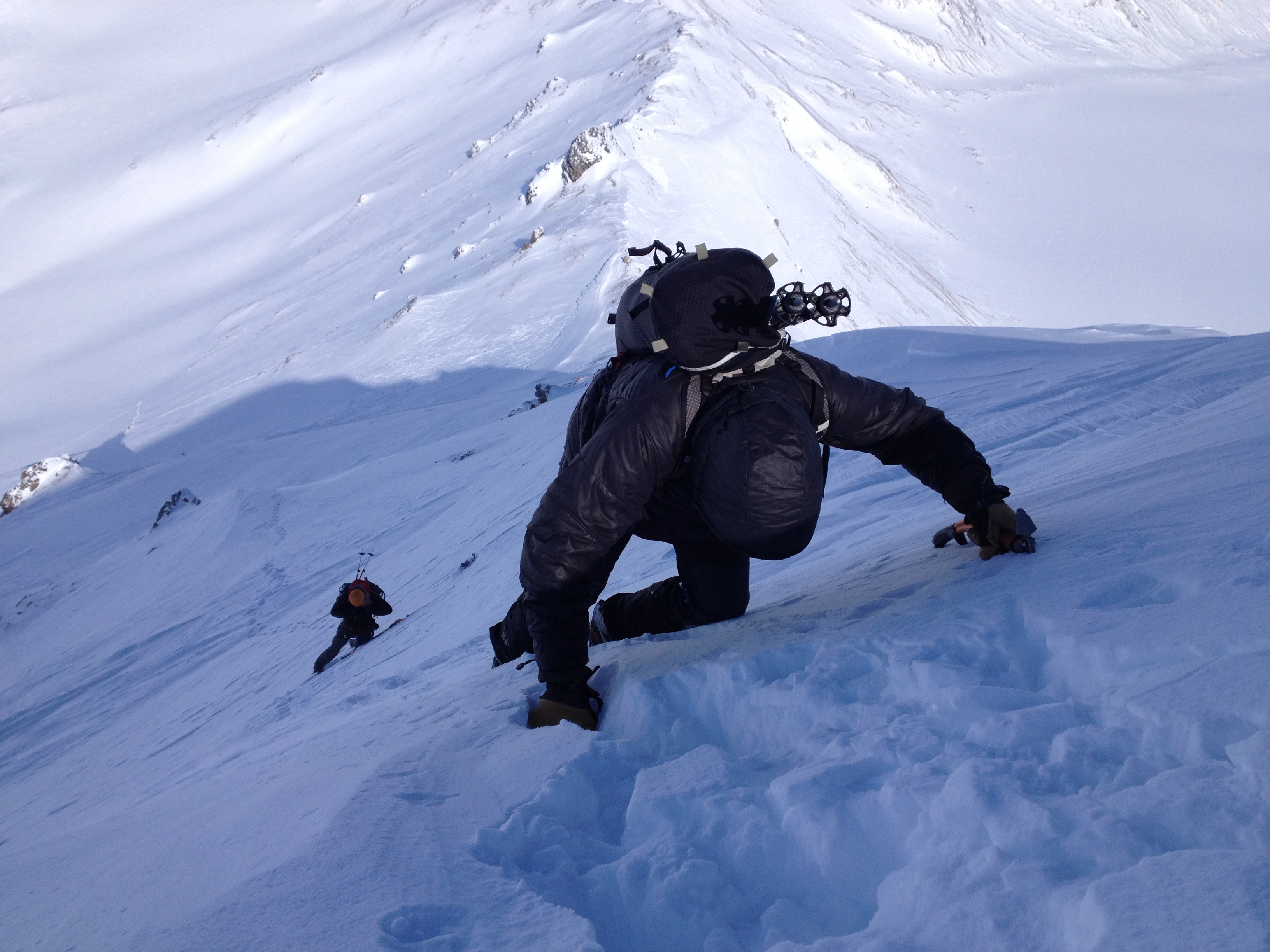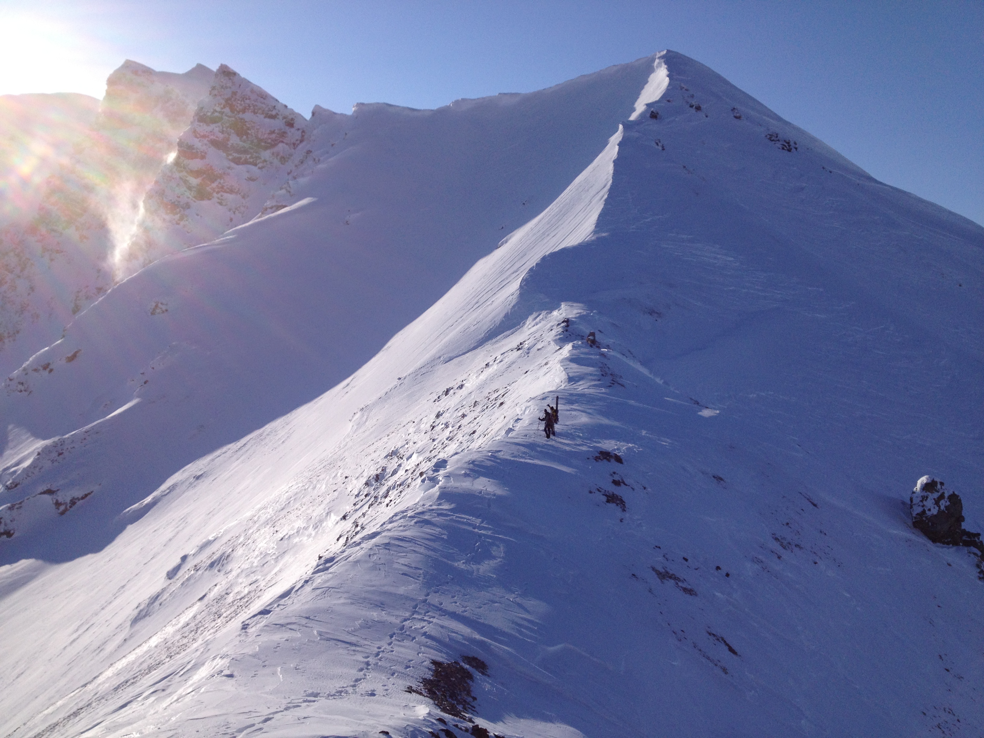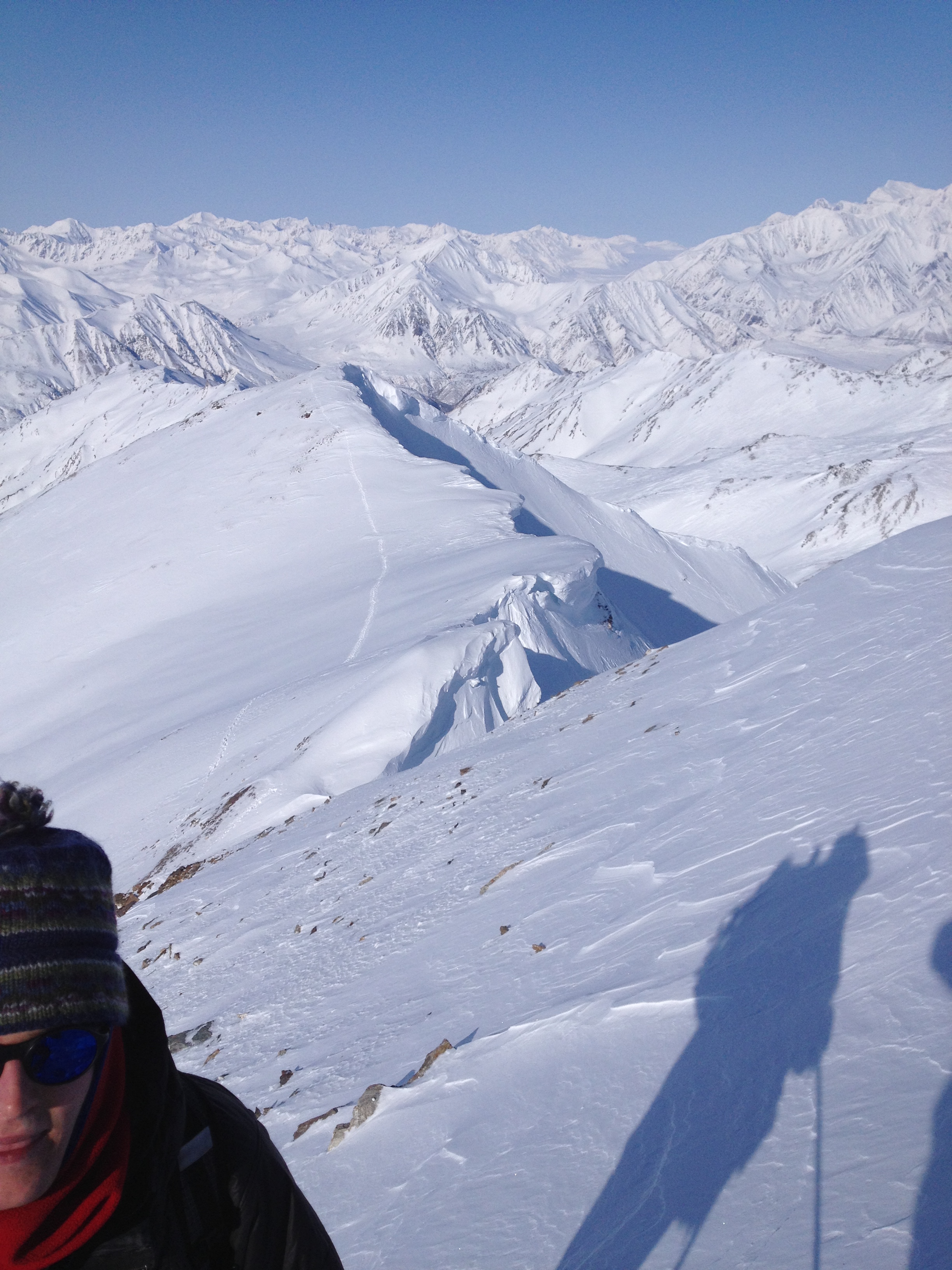 We eat some dry Kodiak Cakes, head up the headwall and top out, decide it’s gonna be too sunny to do our route so we decide to do the west ridge instead.  Jeff Benowitz told us to start at 2am and chided us later (“You should have known the sun would hit the face”).  Jeff also cautioned against bringing beacons, which seemed like a good idea at the time (“Well, if you get in an avalanche on the north face, you’ll just fall a few thousand feet and die anyway”).  Jeff also claims to never use a beacon.