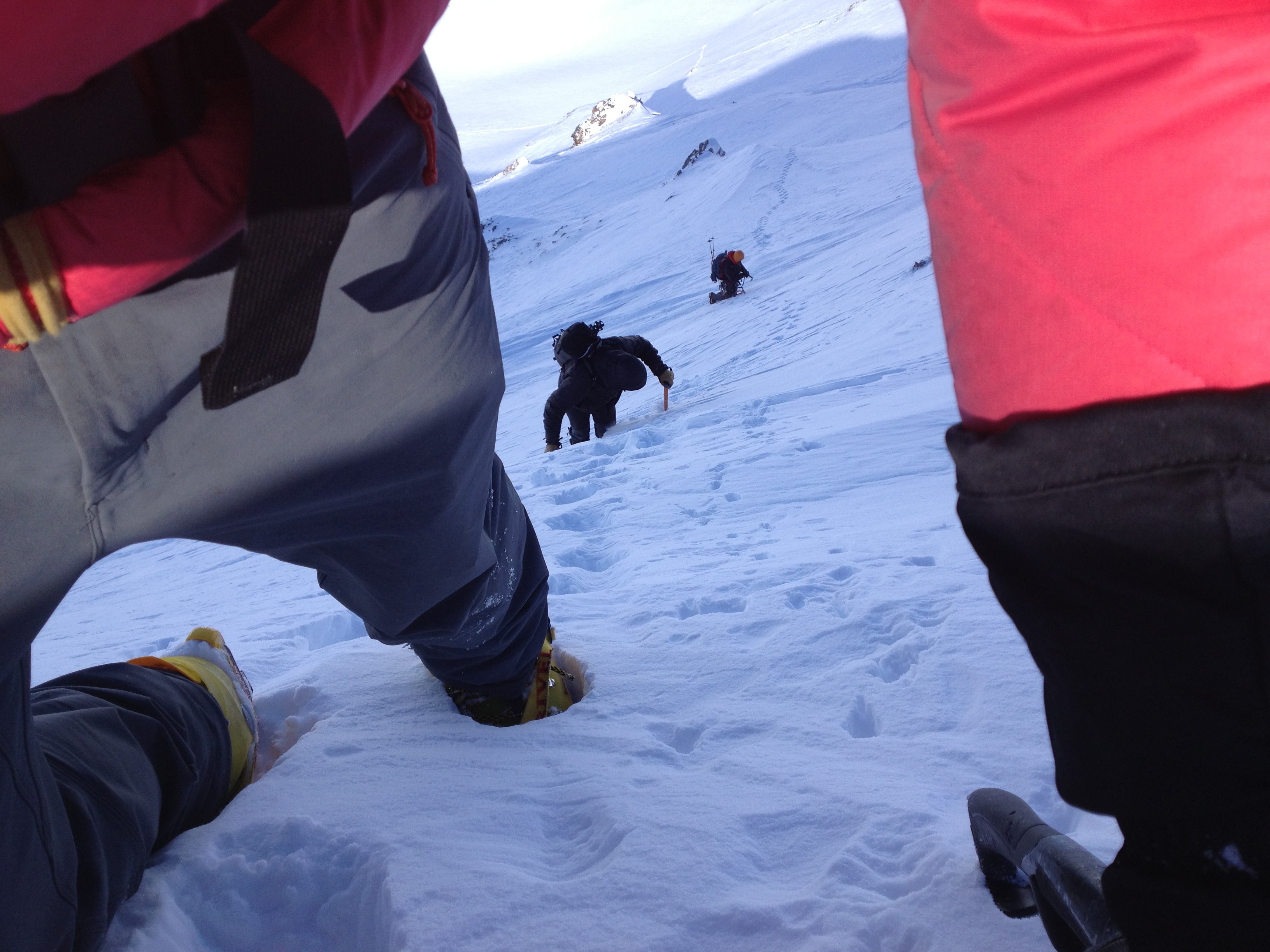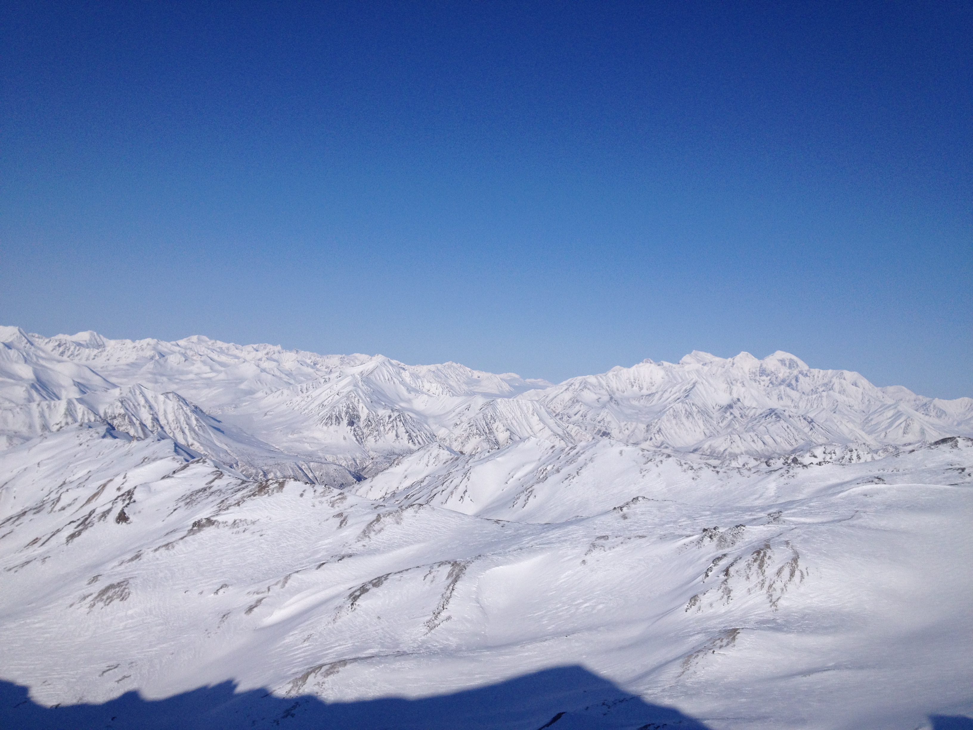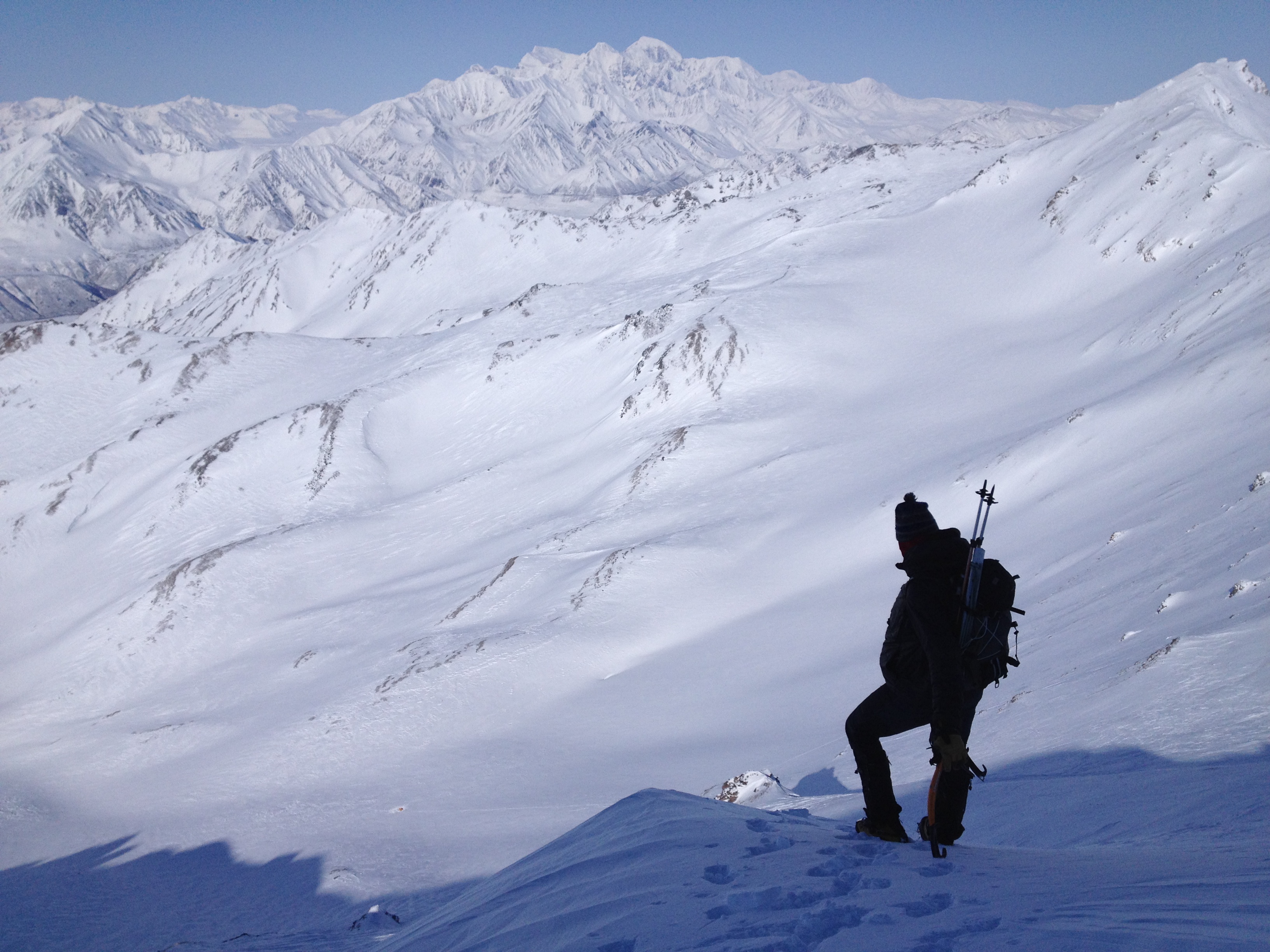 We eat some dry Kodiak Cakes, head up the headwall and top out, decide it’s gonna be too sunny to do our route so we decide to do the west ridge instead.  Jeff Benowitz told us to start at 2am and chided us later (“You should have known the sun would hit the face”).  Jeff also cautioned against bringing beacons, which seemed like a good idea at the time (“Well, if you get in an avalanche on the north face, you’ll just fall a few thousand feet and die anyway”).  Jeff also claims to never use a beacon.