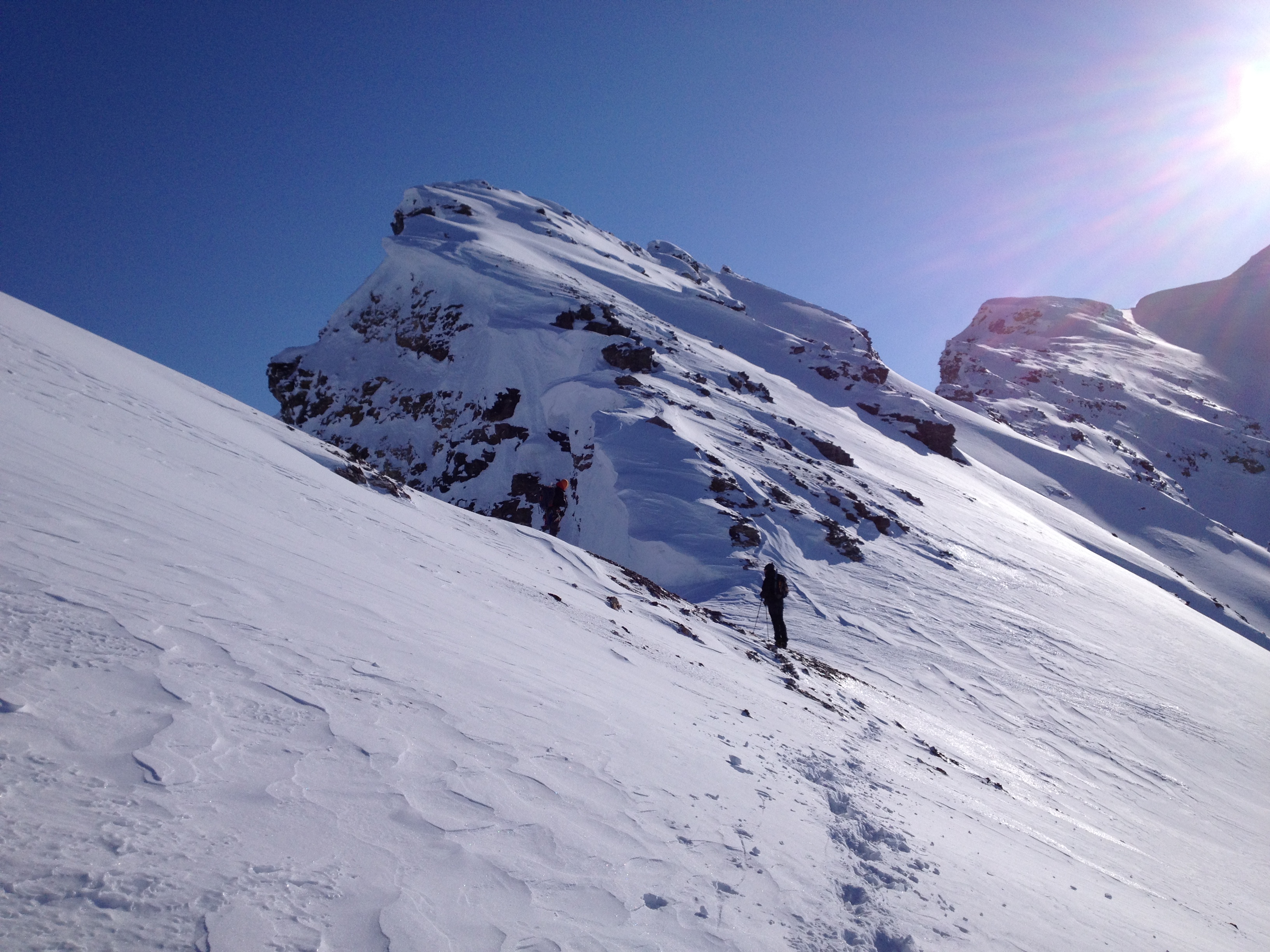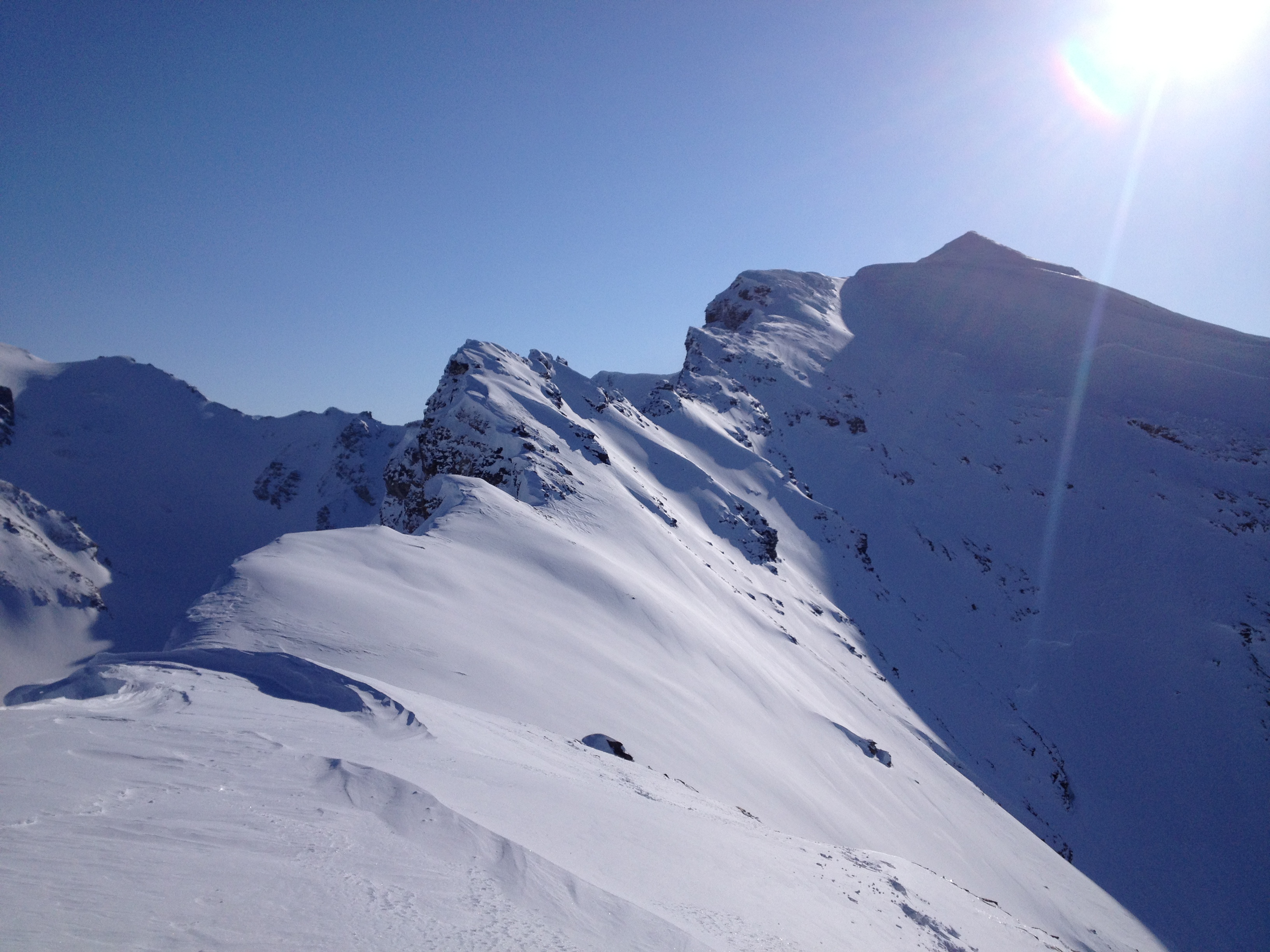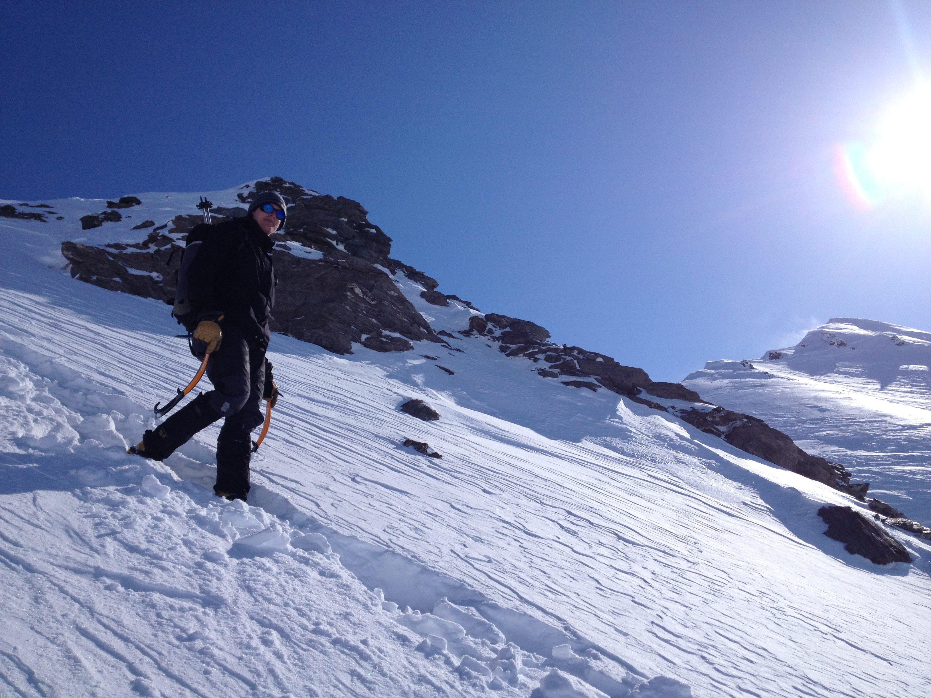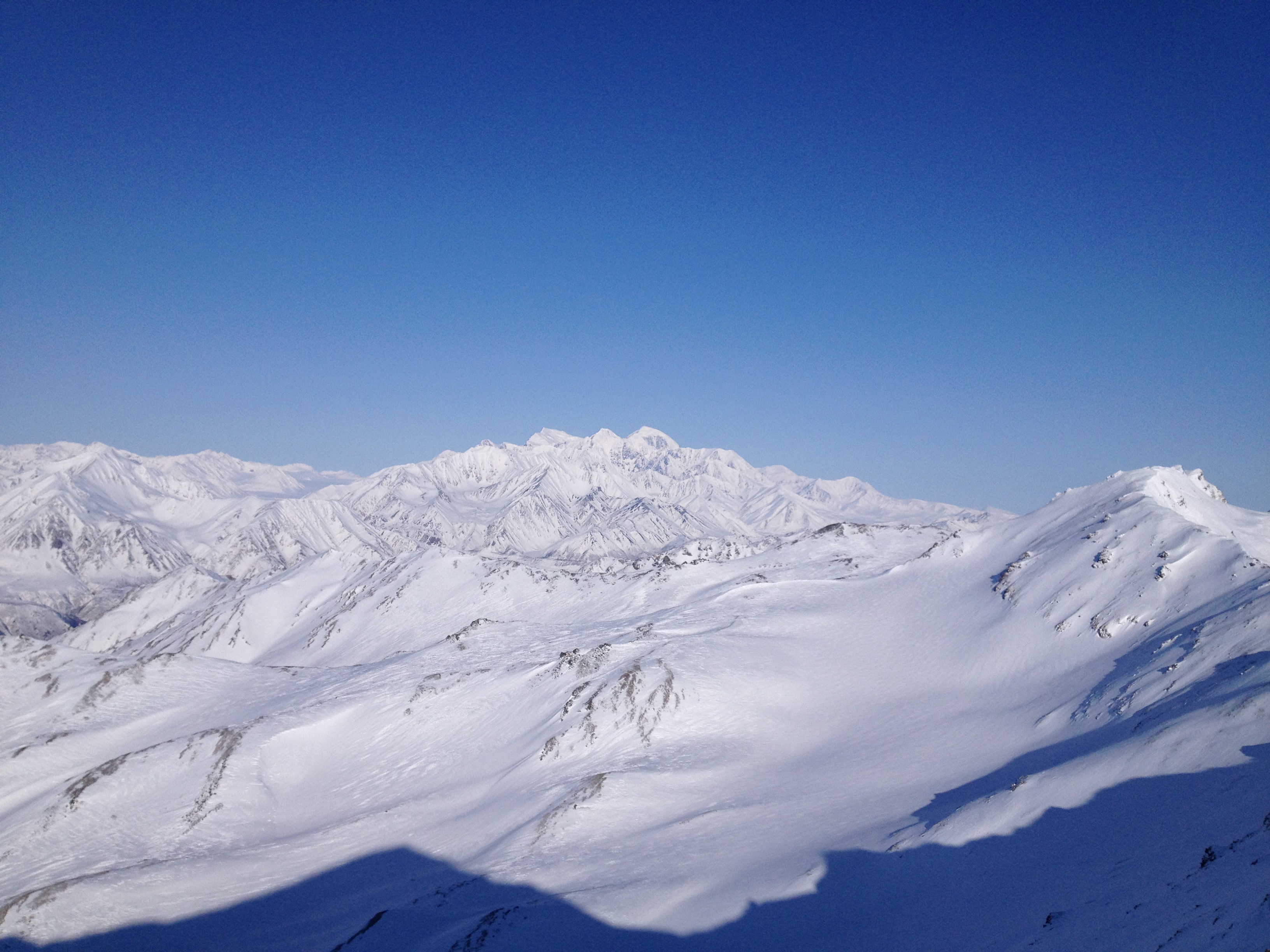 We eat some dry Kodiak Cakes, head up the headwall and top out, decide it’s gonna be too sunny to do our route so we decide to do the west ridge instead.  Jeff Benowitz told us to start at 2am and chided us later (“You should have known the sun would hit the face”).  Jeff also cautioned against bringing beacons, which seemed like a good idea at the time (“Well, if you get in an avalanche on the north face, you’ll just fall a few thousand feet and die anyway”).  Jeff also claims to never use a beacon.