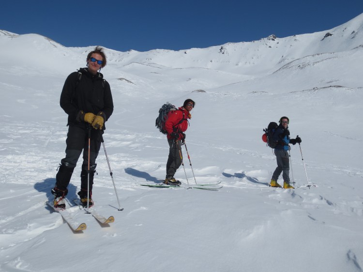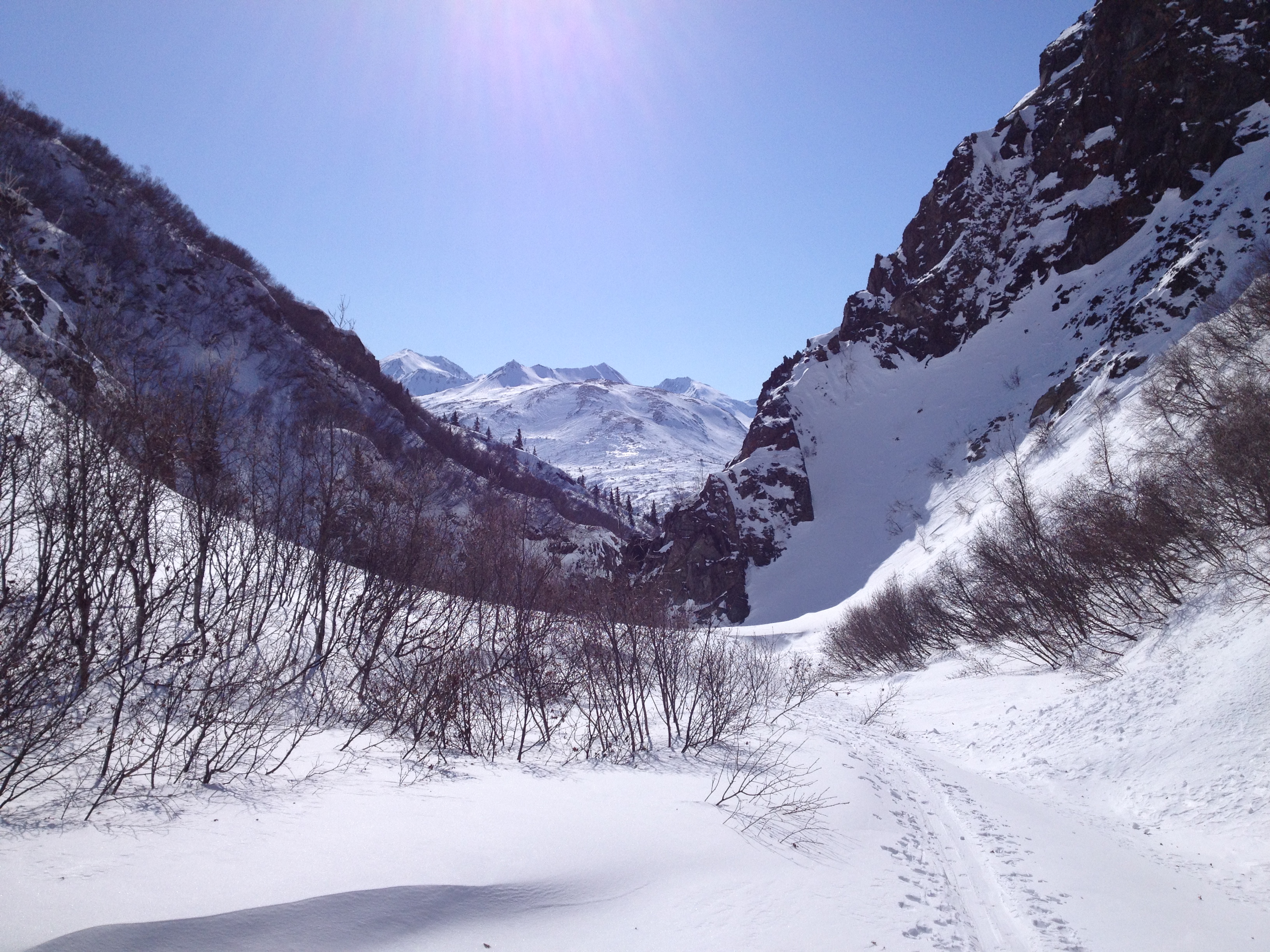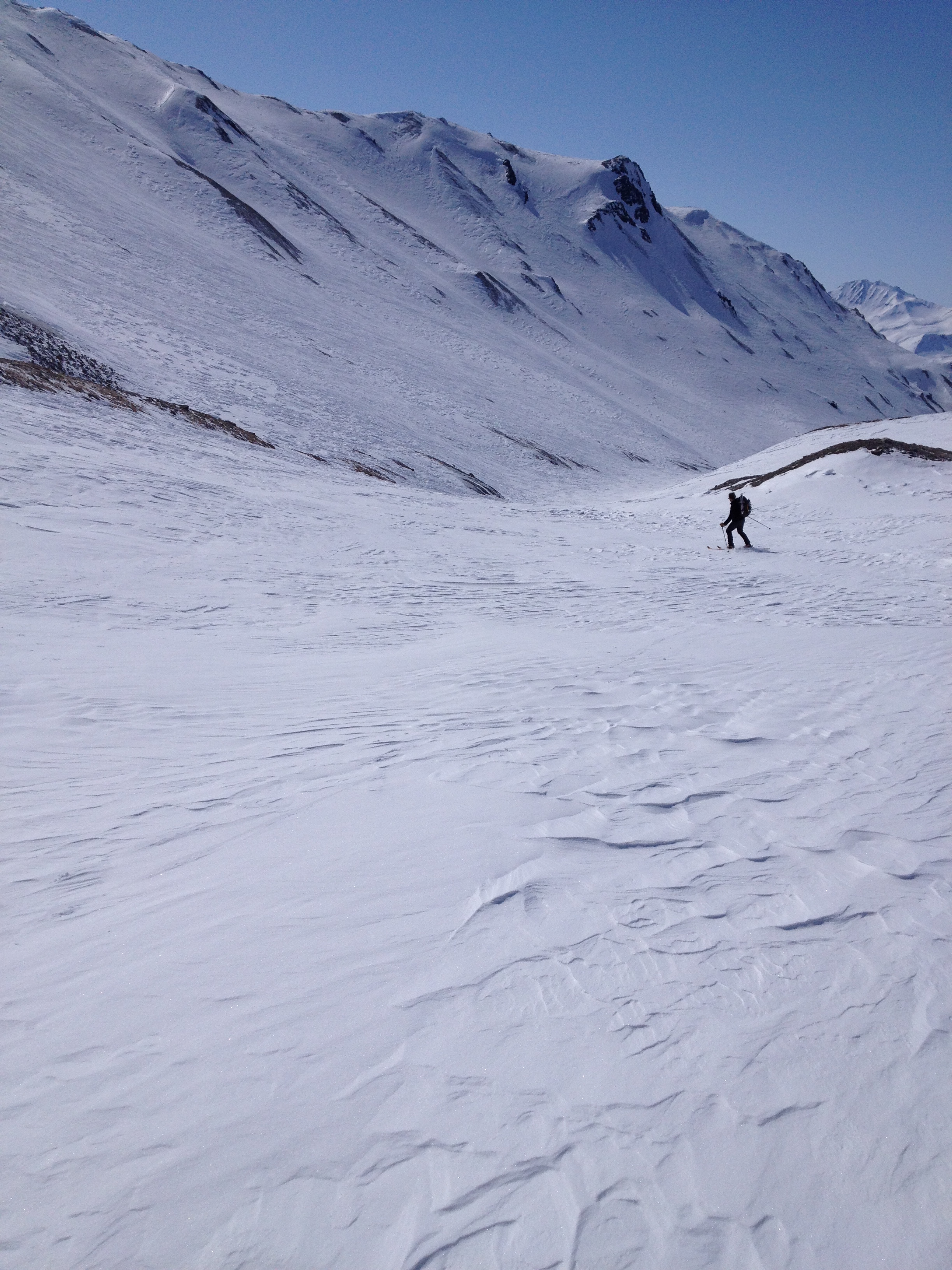 We started to notice the rocks down the creek were moving. I thought it was just me being hungover and sleep-deprived, I think Galen did too, but when Grant made note of it we realized it was probably the Alpine Club on their own Item peak trip (at the time I was president of the club). We watched a pretty sizable group ski up and we decide to meet up with them (not that we had a choice, we were going down the valley). We ski down in awesome conditions, our mountaineering skis don’t work well in powder. In the spring, the sun bakes the snow into compact ice and freezes overnight.  Around noon the snow gets sunsoaked and turns wonderful, like butter taken out of the fridge and left to sit; a frozen core with a soft surface.