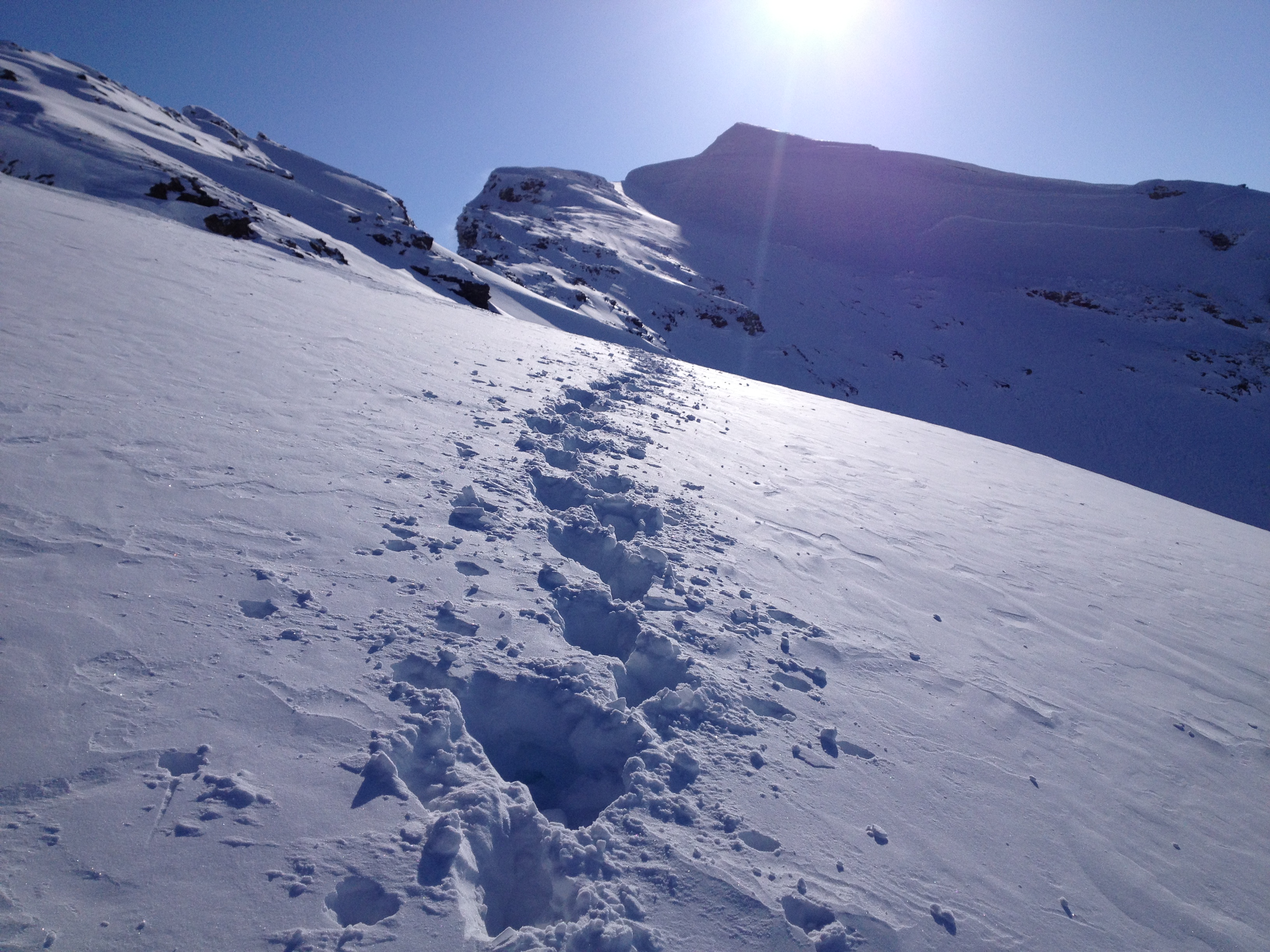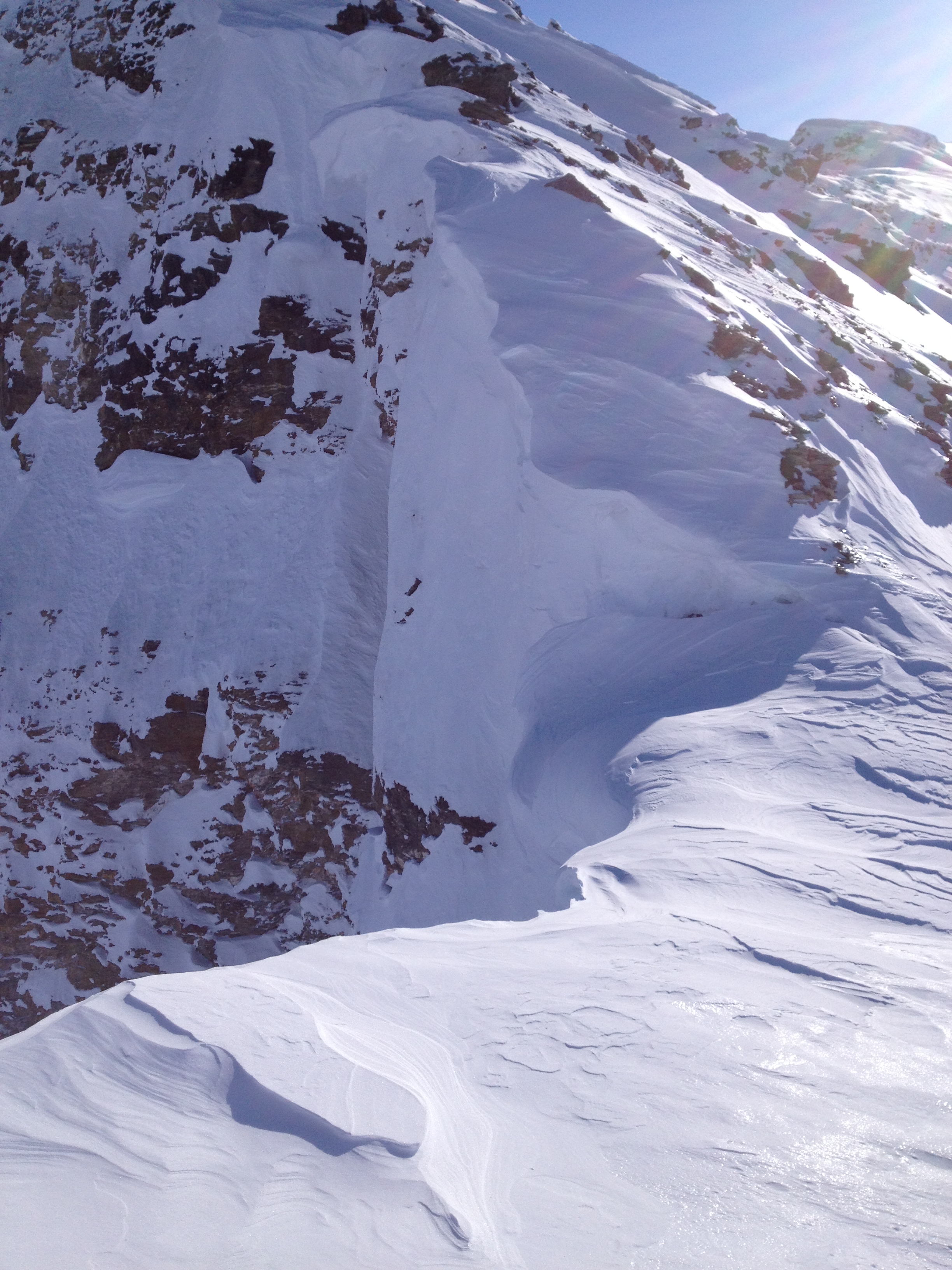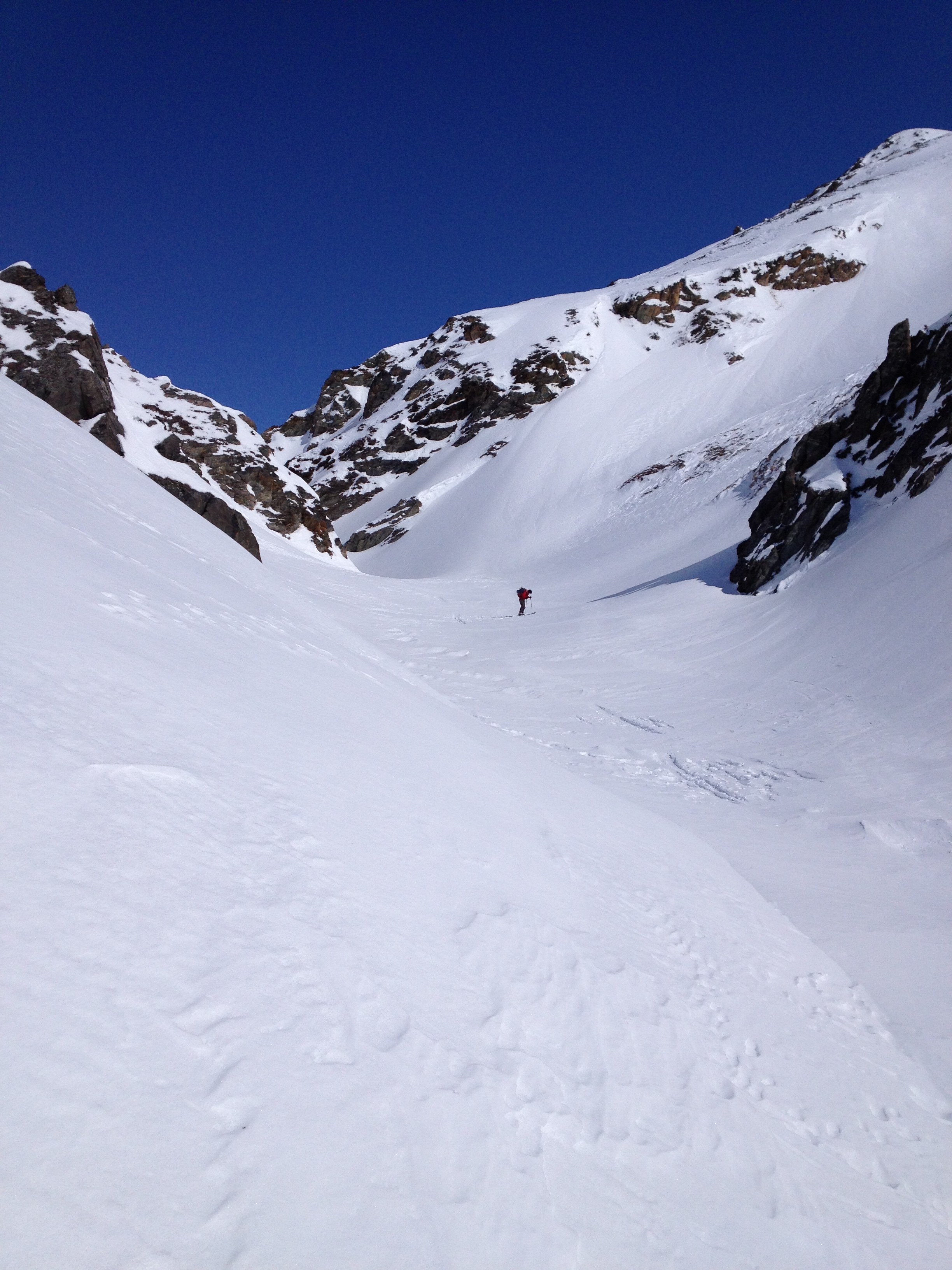 As I catch up to the boys, they tell me Galen set off a sizable avalanche!  I was in disbelief because I didn’t hear anything, then look downward to the maw of the Trim’s Glacier and see it had jumped the bergshrund at the head of the valley.