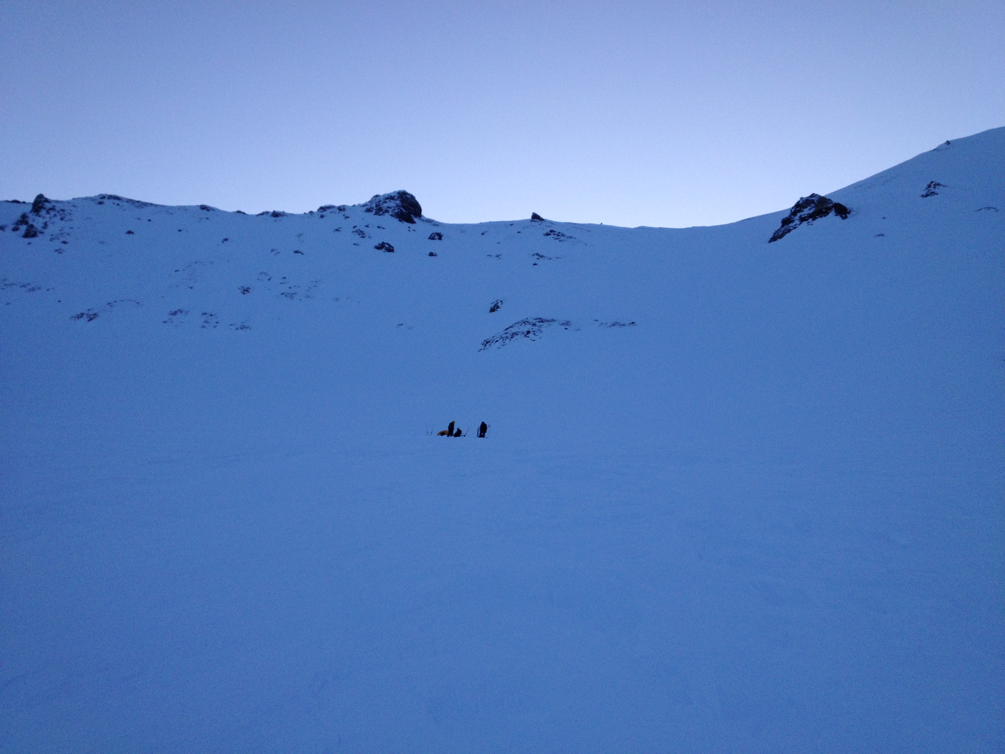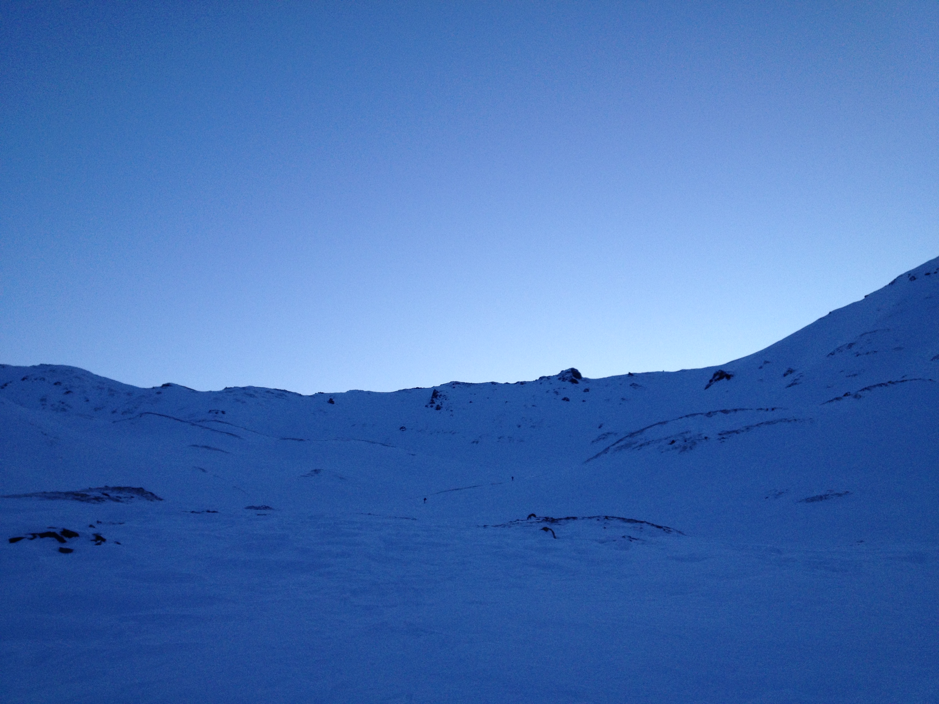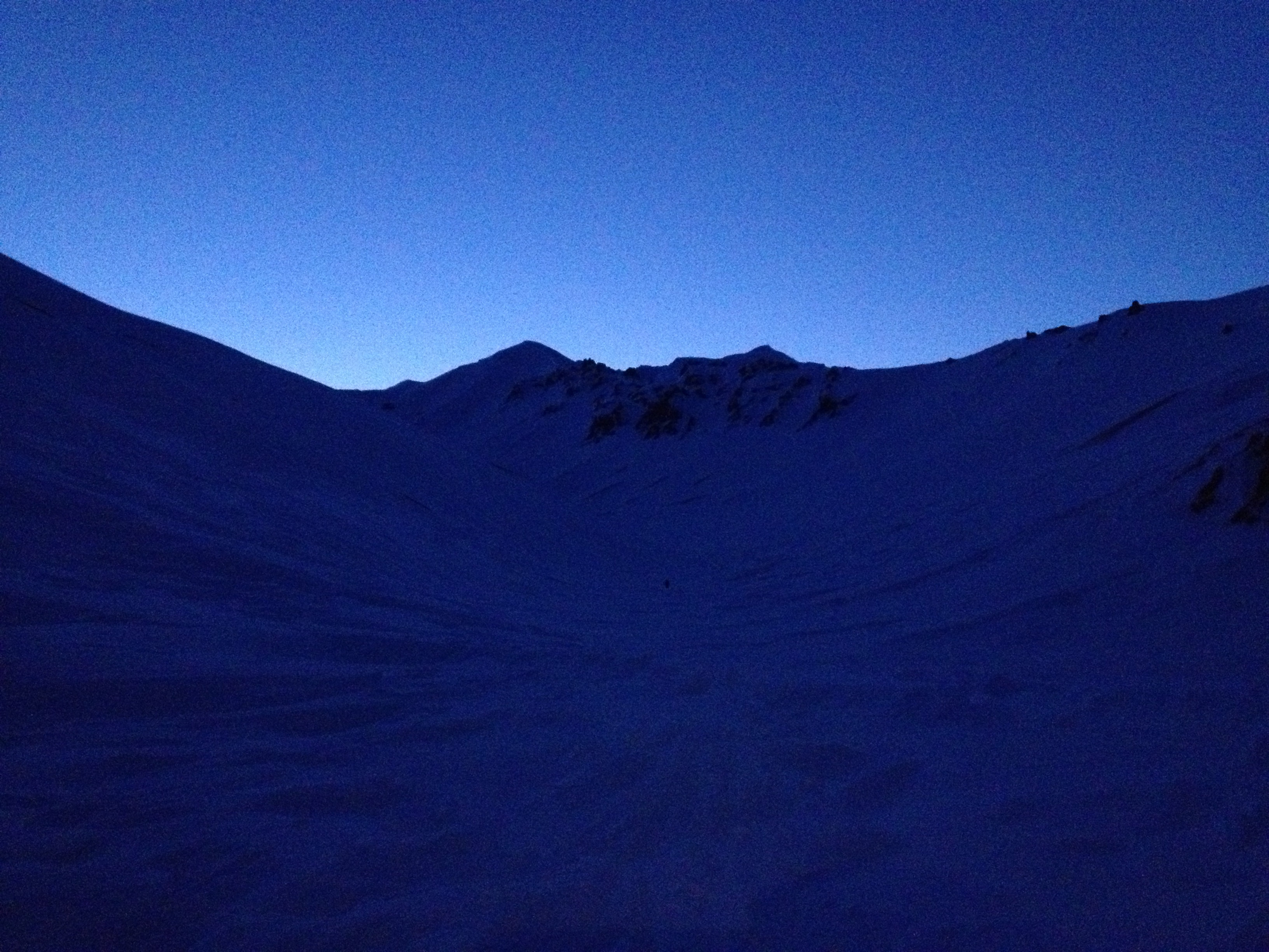 We ski up the creek in the dark, make it to the base of the headwall and wake/hang with the guys camping there (Brian and Seth, they’re headed to Silvertip).