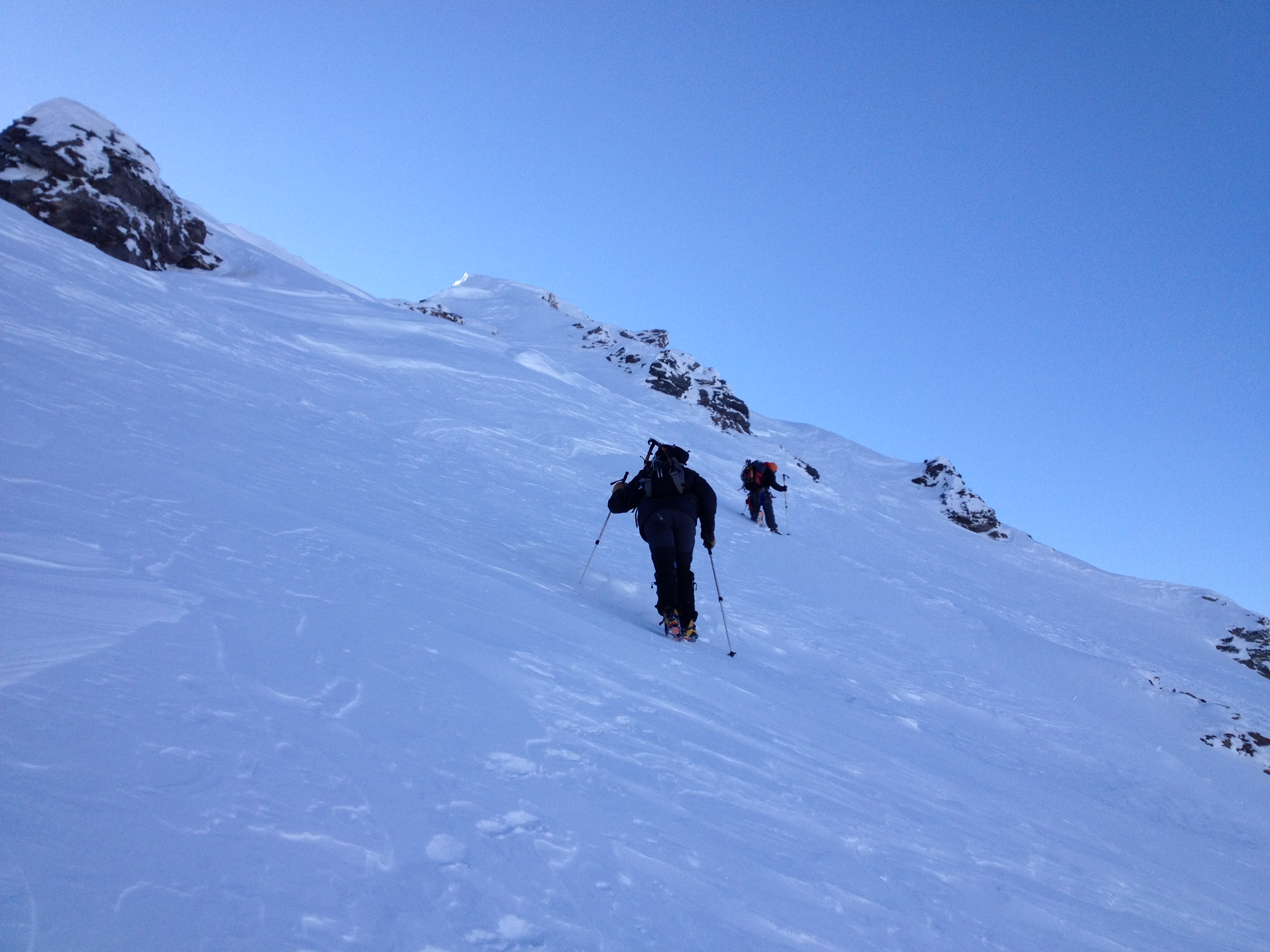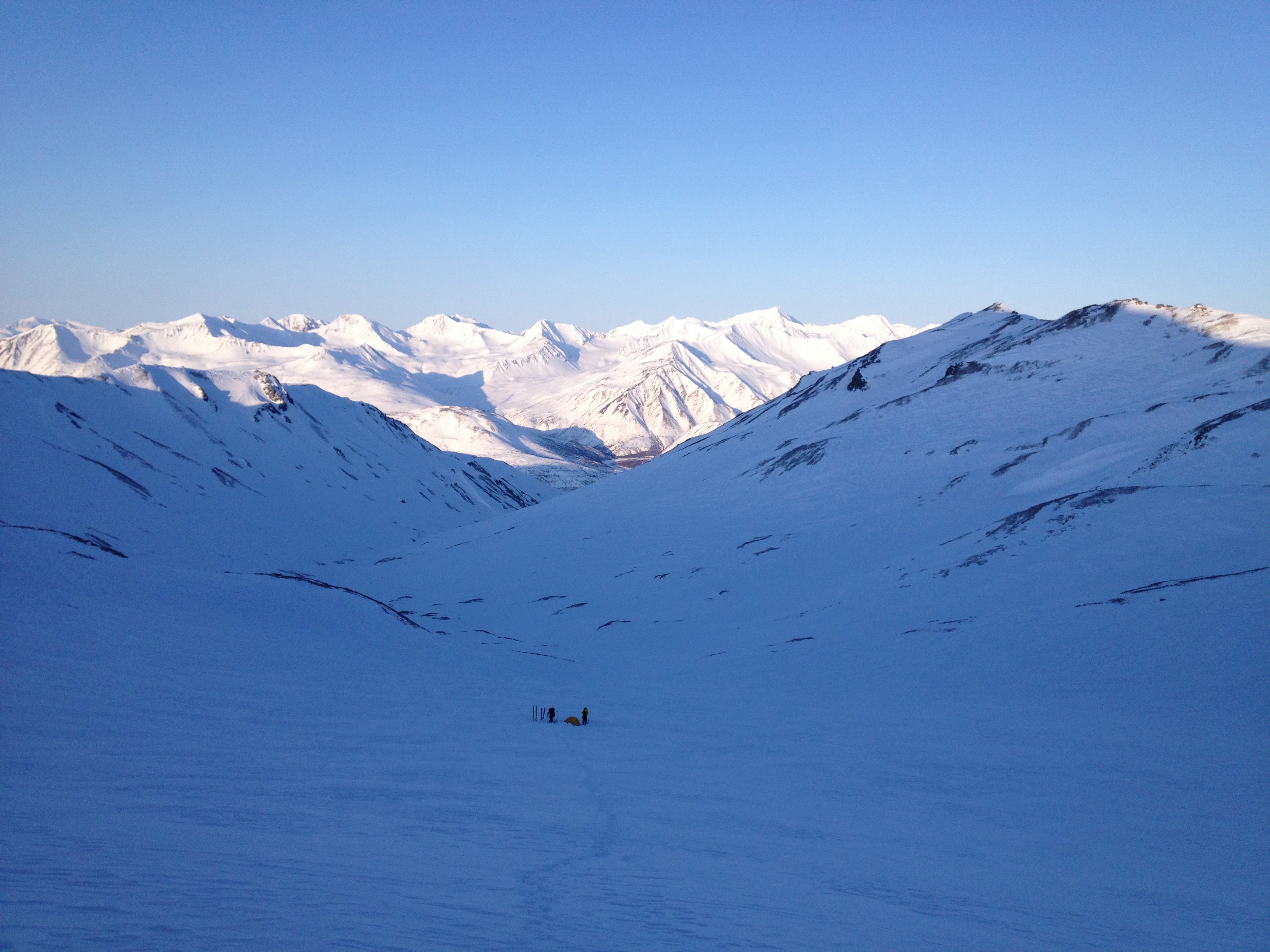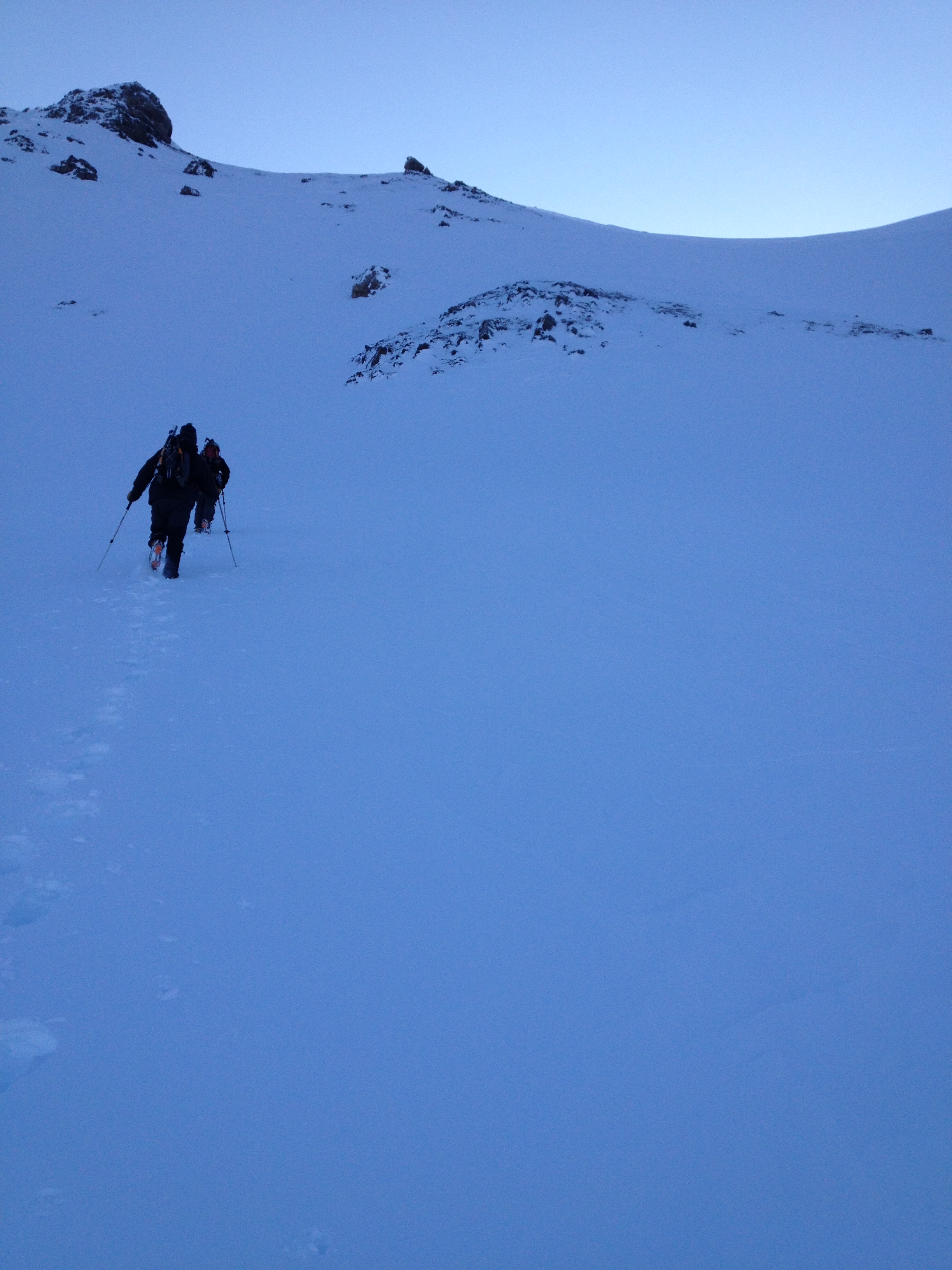 We ski up the creek in the dark, make it to the base of the headwall and wake/hang with the guys camping there (Brian and Seth, they’re headed to Silvertip).