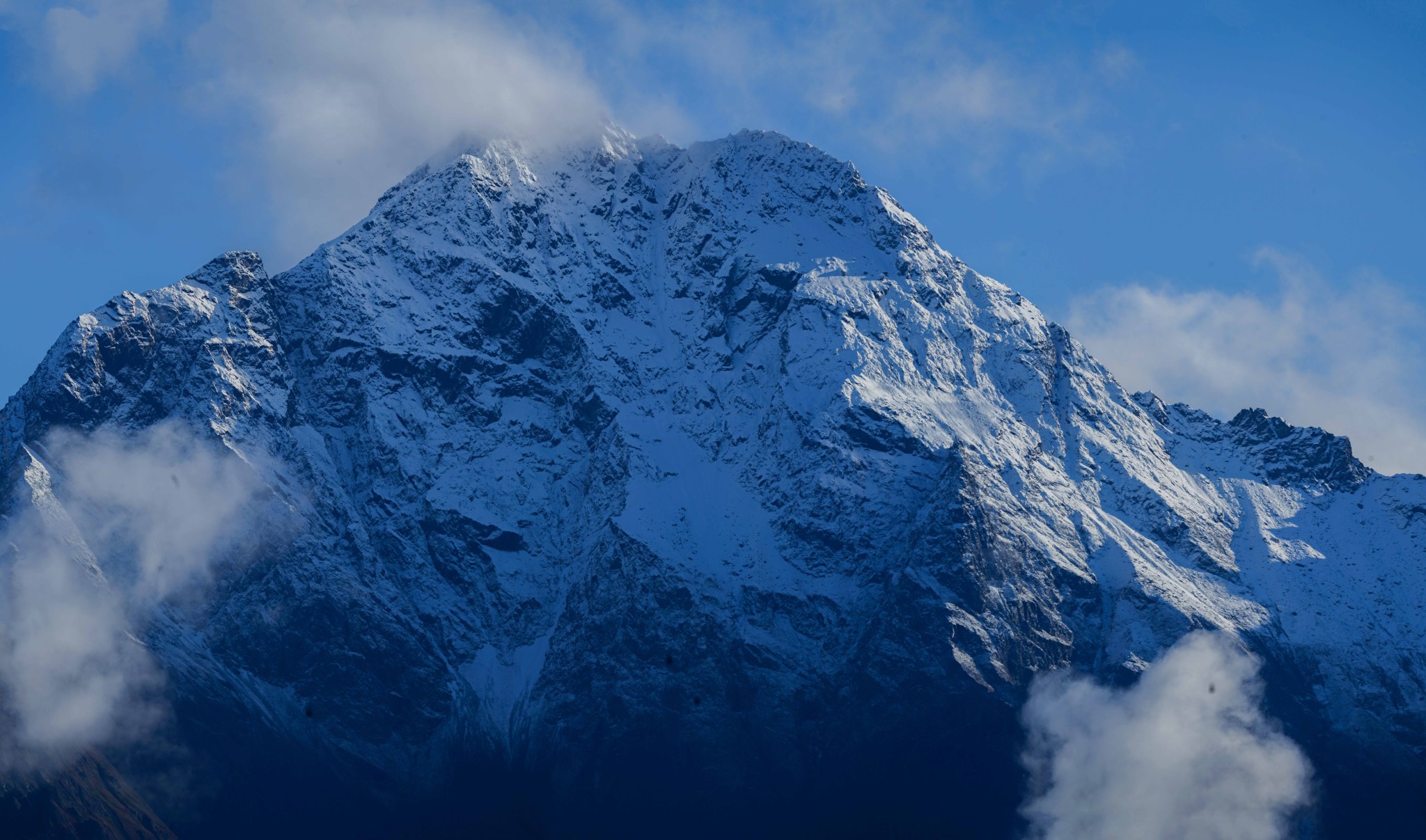 After the constriction, we entered the Upper Bowl of the north face and tried to find the slabbiest snow to crampon-crunch up. We did post-hole for a while before finding the optimum path.