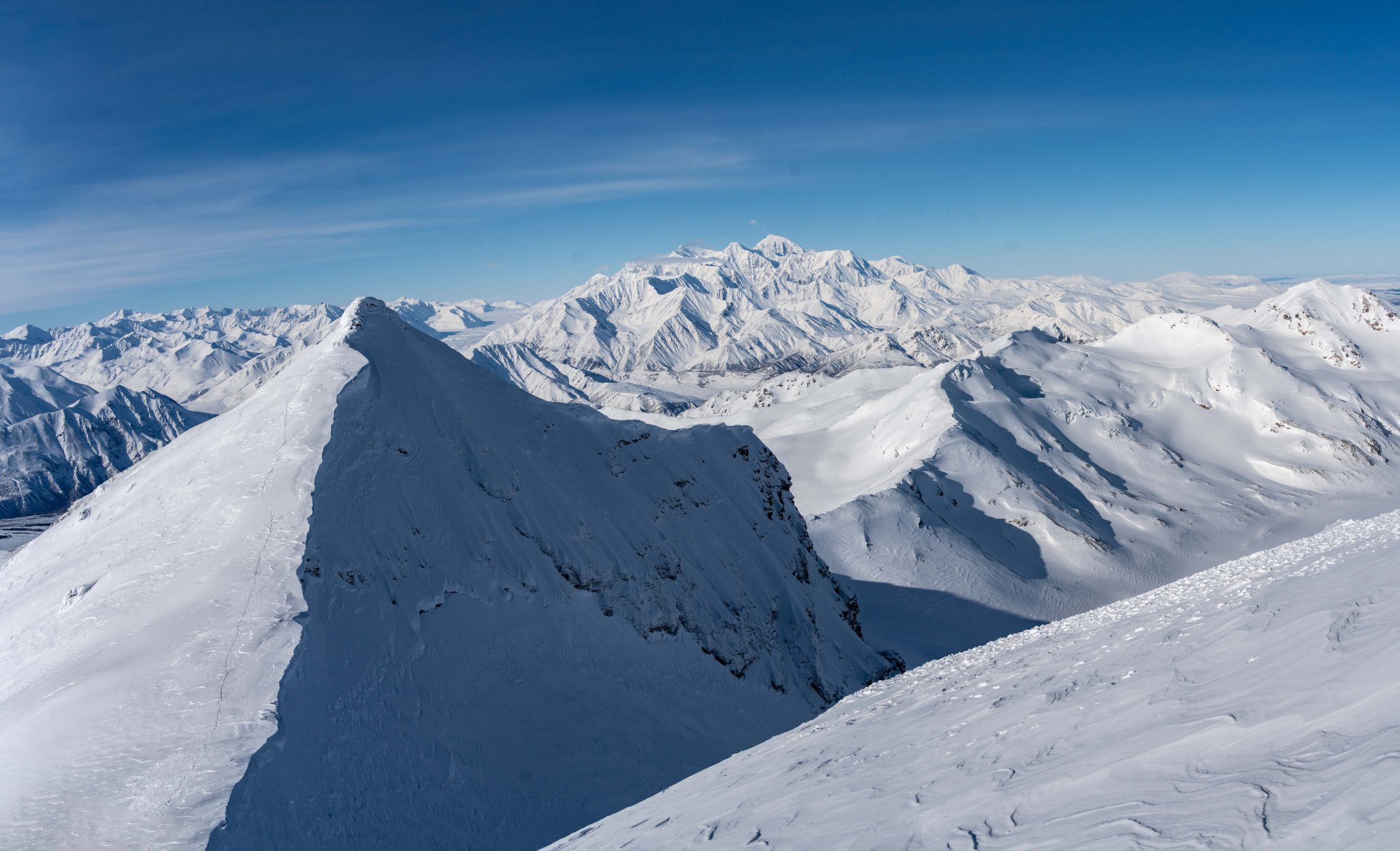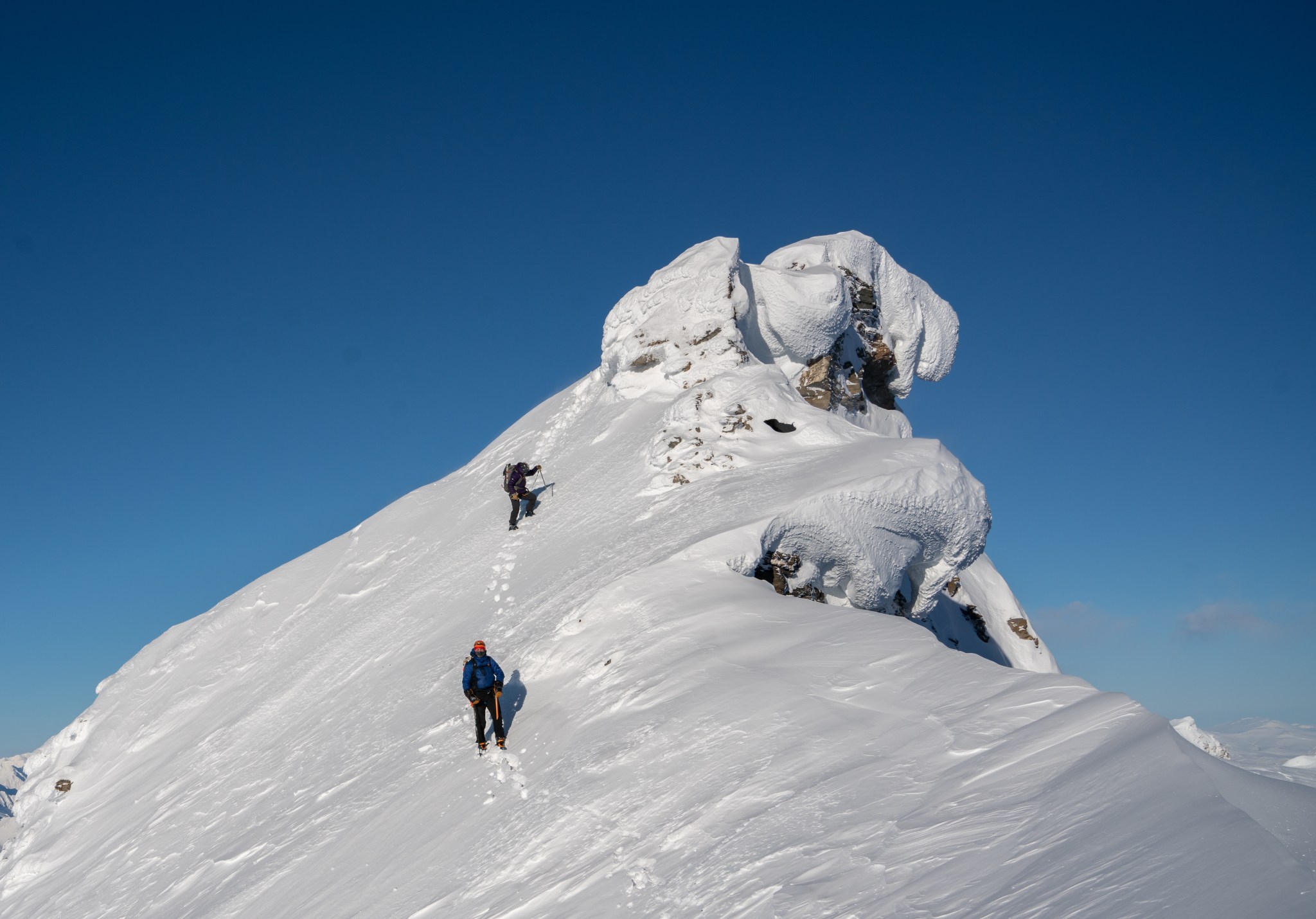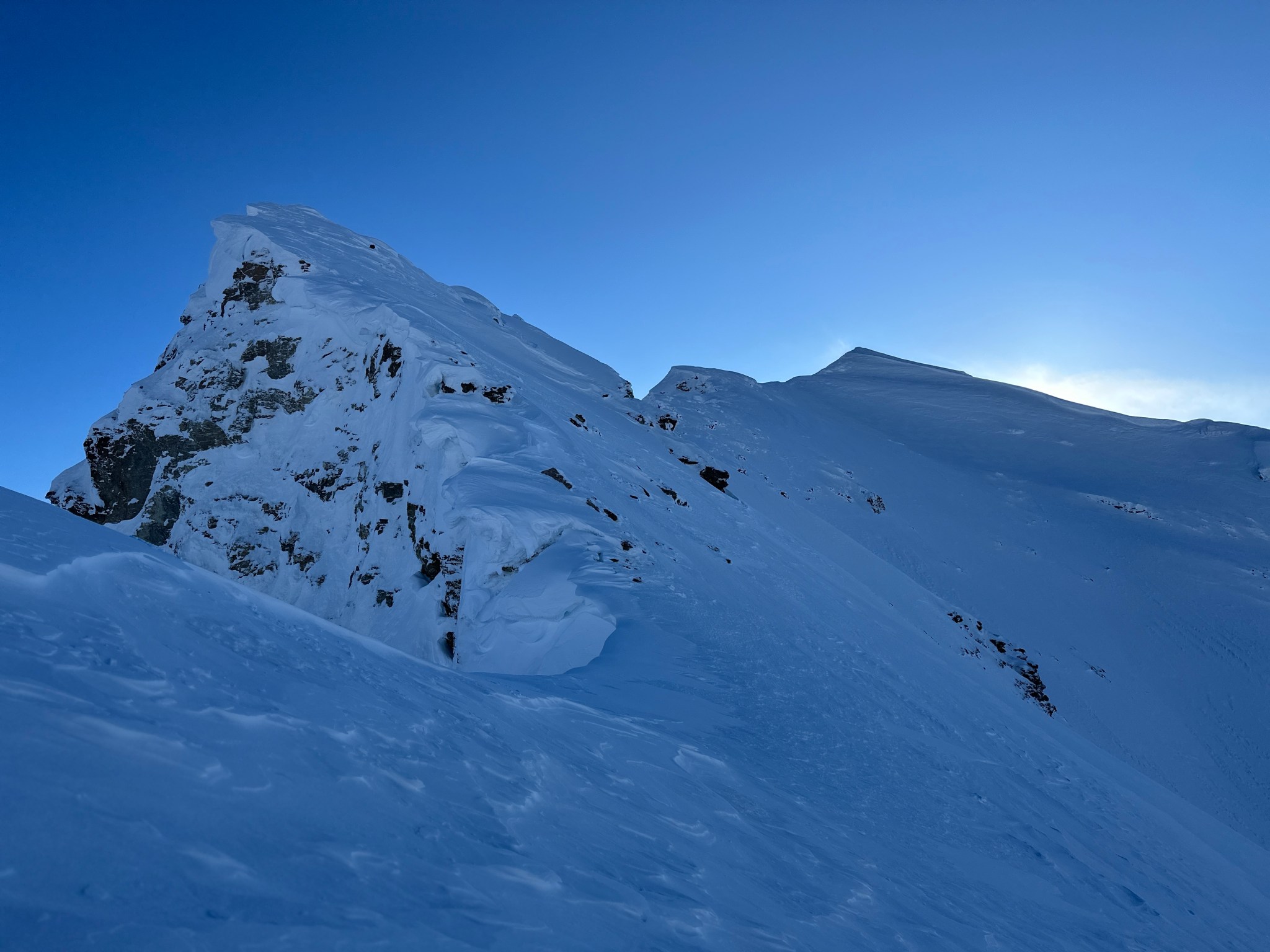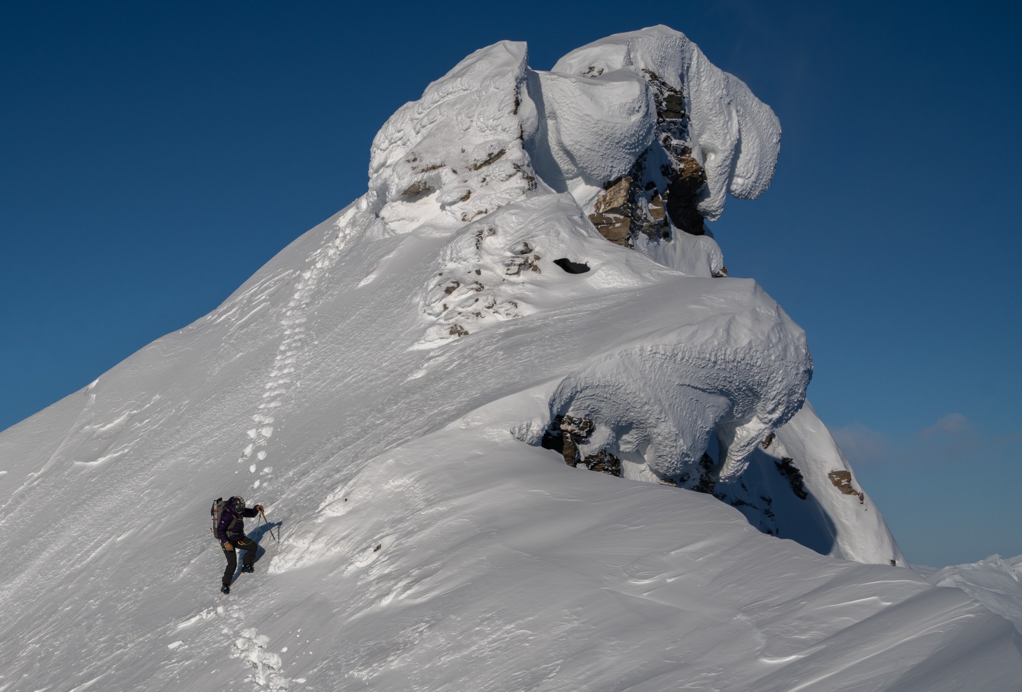Last time I was on this ridge 10 years ago my party set off a sizable avalanche while crossing the middle of the first major slope (which was probably pretty stupid), so this time I led us high up the ridge and connected various rocks where the wind had formed safe little wells that could not avalanche. The snow was occasionally slabby, but nothing that concerned me. Staying high on the ridge and moving between rocks calmed fears of releasing the entire slope of snow and plummeting a thousandish feet down onto a glacier. This continued until we reached the lower slopes of the rimed-covered false summit. We could finally see the true summit, still half a ridge away. It was quite cold so I didn’t take nearly as many photos as I would have liked, a prospect I had to force myself to accept. I still took photos until my fingers numbed.