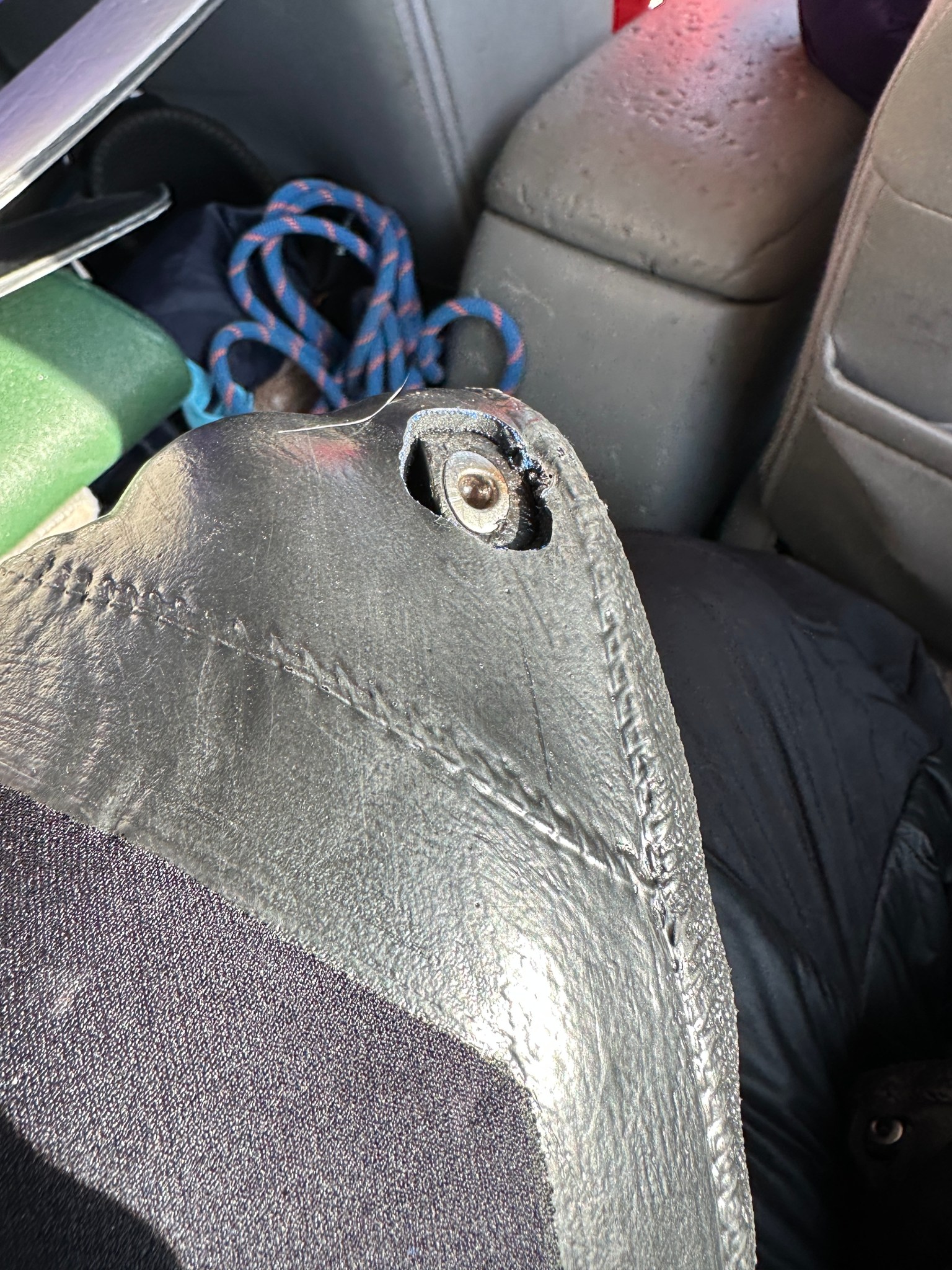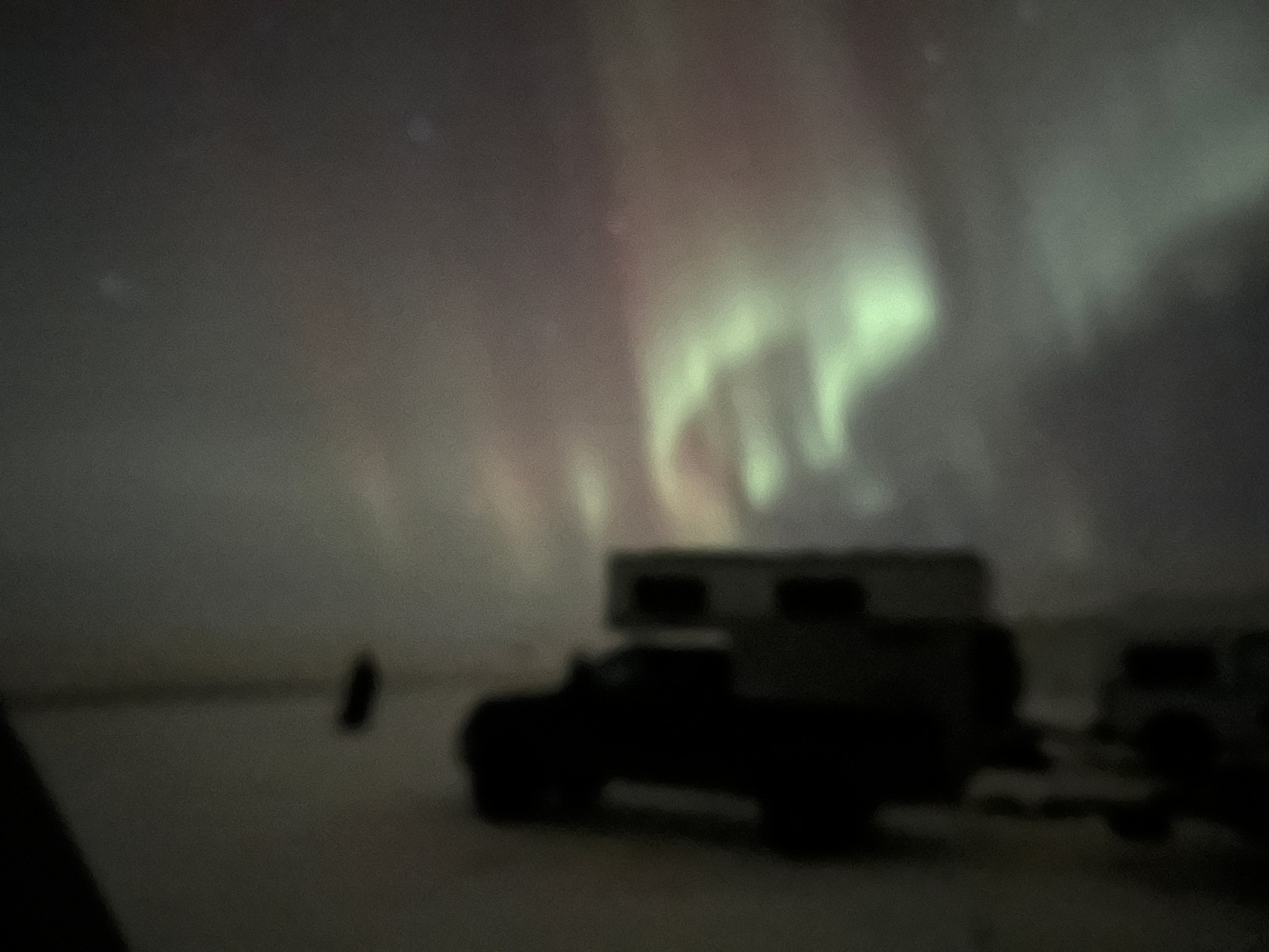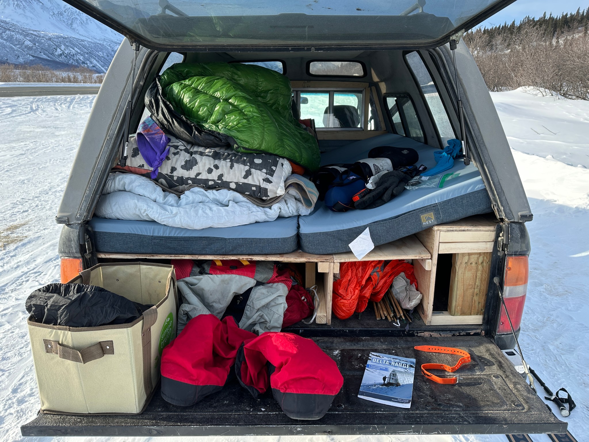 Tuesday the 14th rolls around, I swing by Moose’s Tooth to pick up Stefan to drive north to the Deltas. He and Zach Suave had been climbing in Eklutna Canyon for the past few days. Rather than resting, Stefan planned to go mountaineering in the Alaska Range—what a legend! We loaded my truck and met The Allison at the Richardson Monument around 10:30PM. I slept in the back of my truck and got a few glimpses of aurora, a good level 5, though the temps were incredibly cold. It was -20F when we woke up around 7AM with clear skies. Plan A assumed we’d be skiing towards Gulkana Glacier before 8AM. I heard a knock on my window and Allison shows me the remains of what had once been a lightweight climbing helmet. Apparently she had crushed it with her powerful knee accidentally as they packed the previous night.
