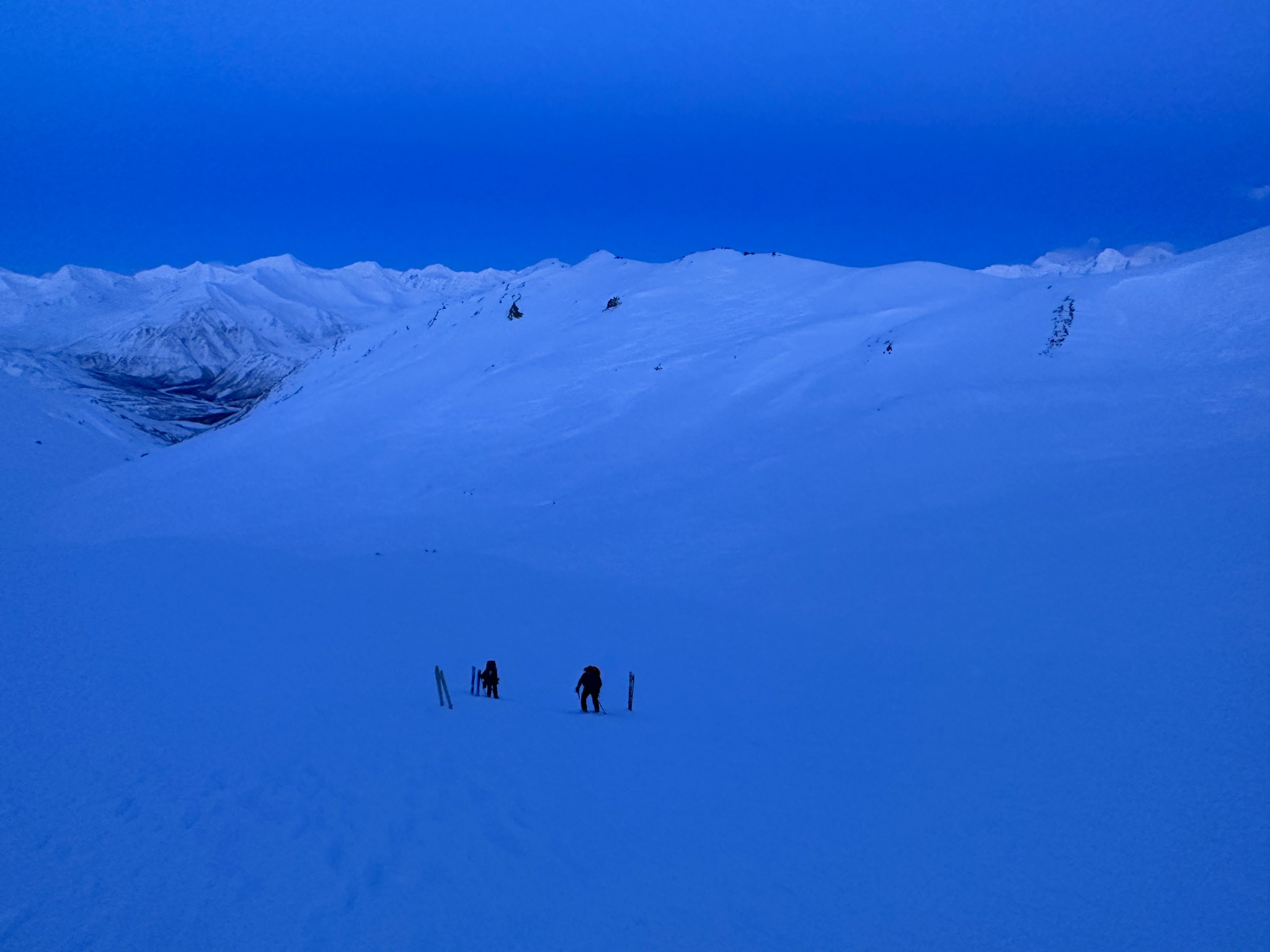 We all significantly lowered our expectations for the day. We justified: it would be nice to ski out with light, and the sun wouldn’t be up for a few more hours so we might as well get in some exercise. Hey: I could be back in Anchorage by the afternoon! By the time we reached the headwall around 7AM, the sun was rising, the skis had cleared, and we dared to believe we might get to climb today.