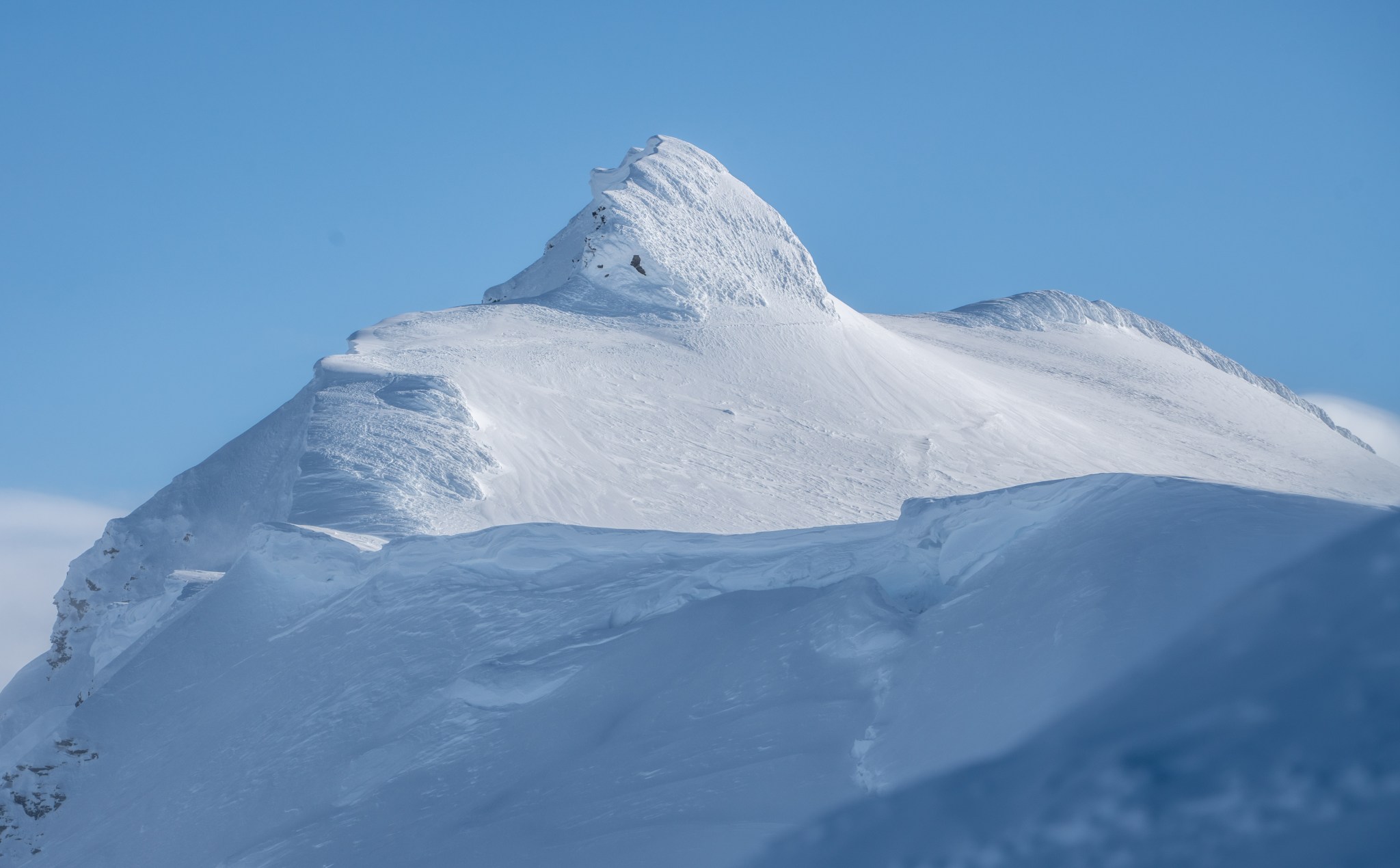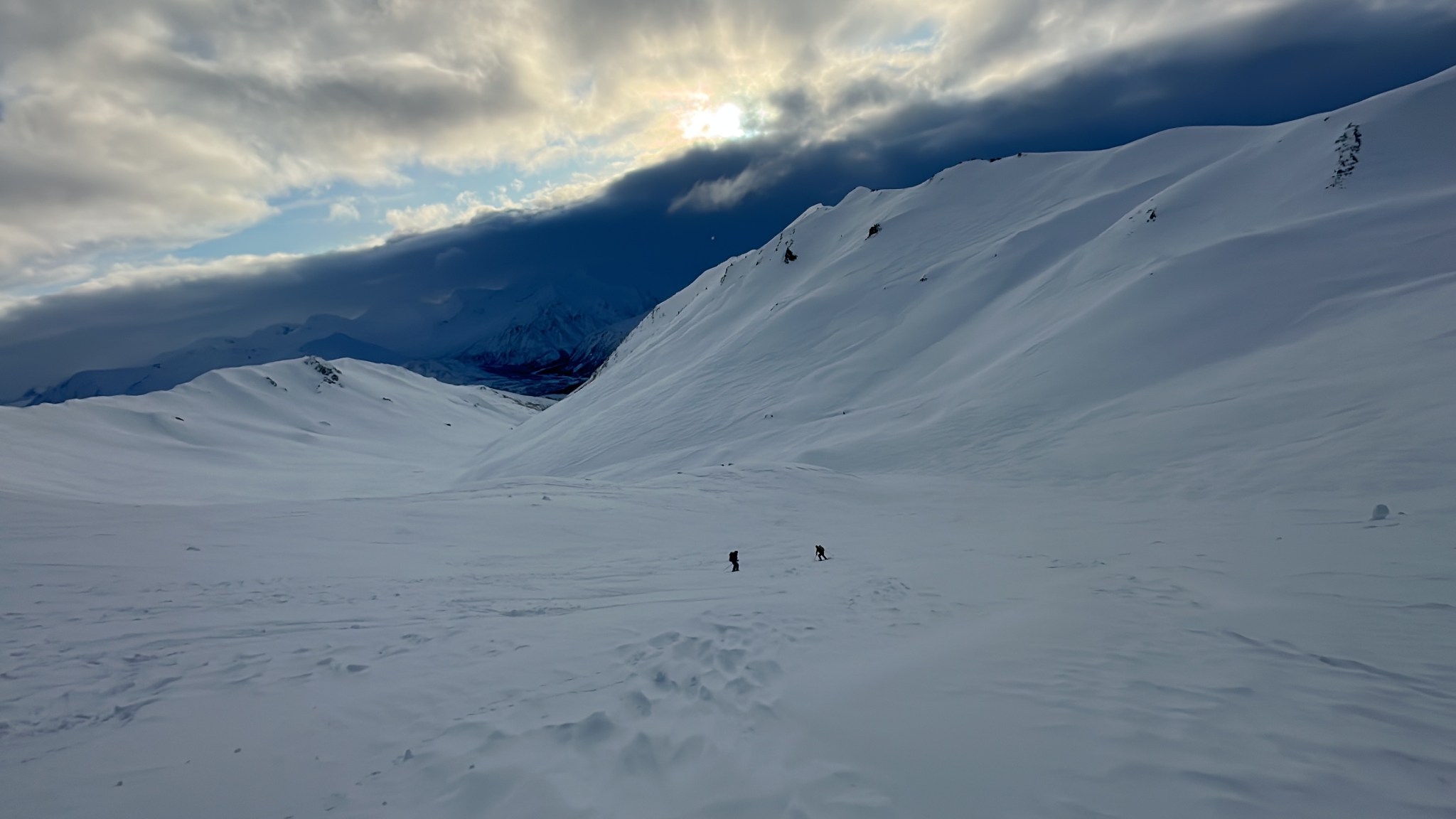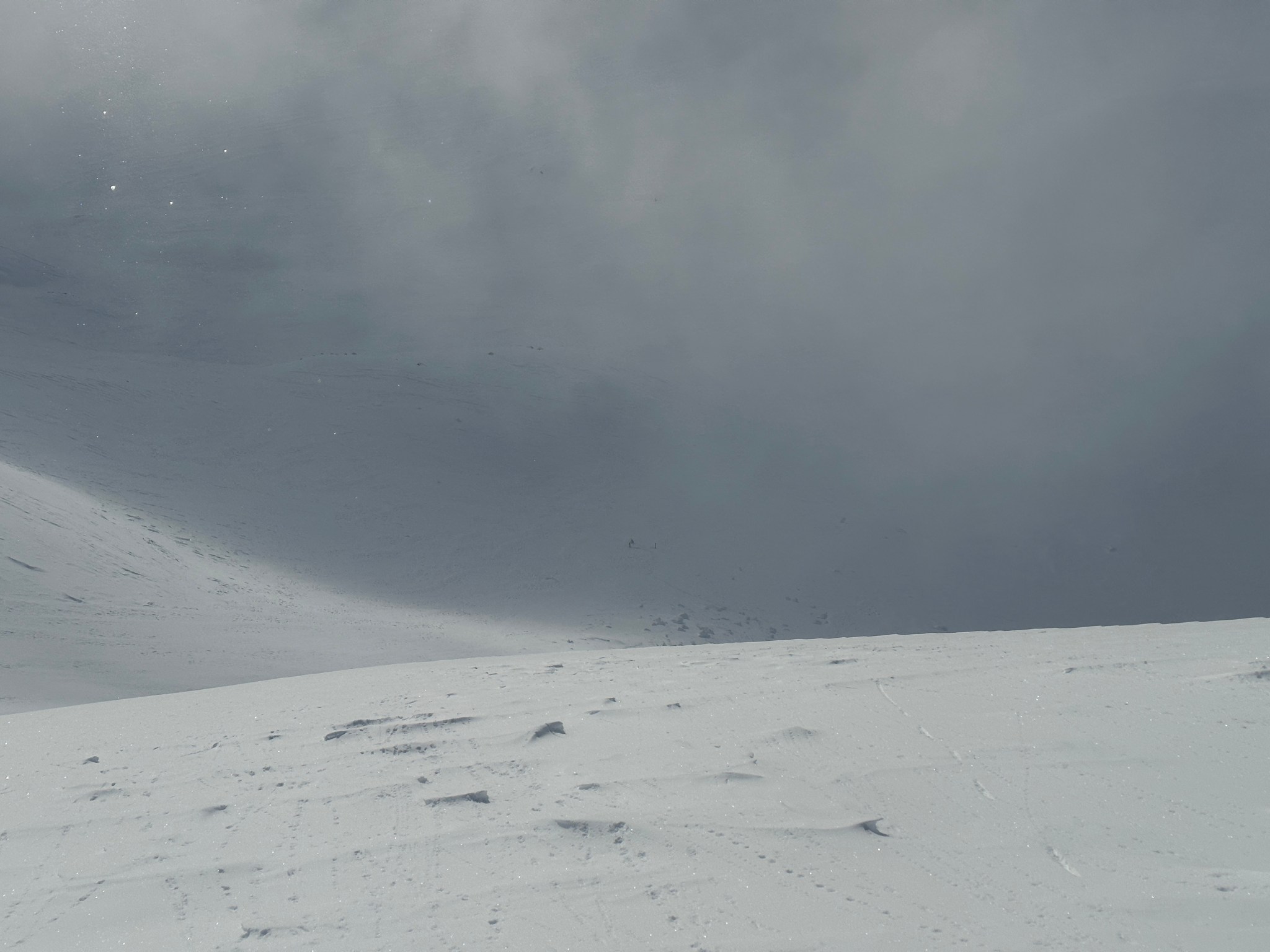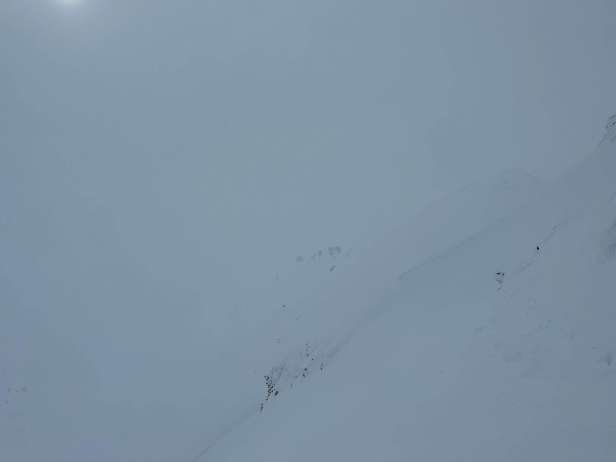 This part is just a blur in my memory, I was too focused on finding the route back, moving safely, and keeping track of my partners in the whiteout to recall specifics. It wasn’t my favorite part of the trip, but knowing we had already crossed it gave me confidence there was a route back we could find. When we finally made it to the gentle slope leading back to “Michael Peak”, Stefan said he felt like we were close to being off the ridge but he wasn’t sure. “No, it’s okay, we really are past the worst of it!” We made our way to the top of the headwall and noticed blue sky opening up above us…now?