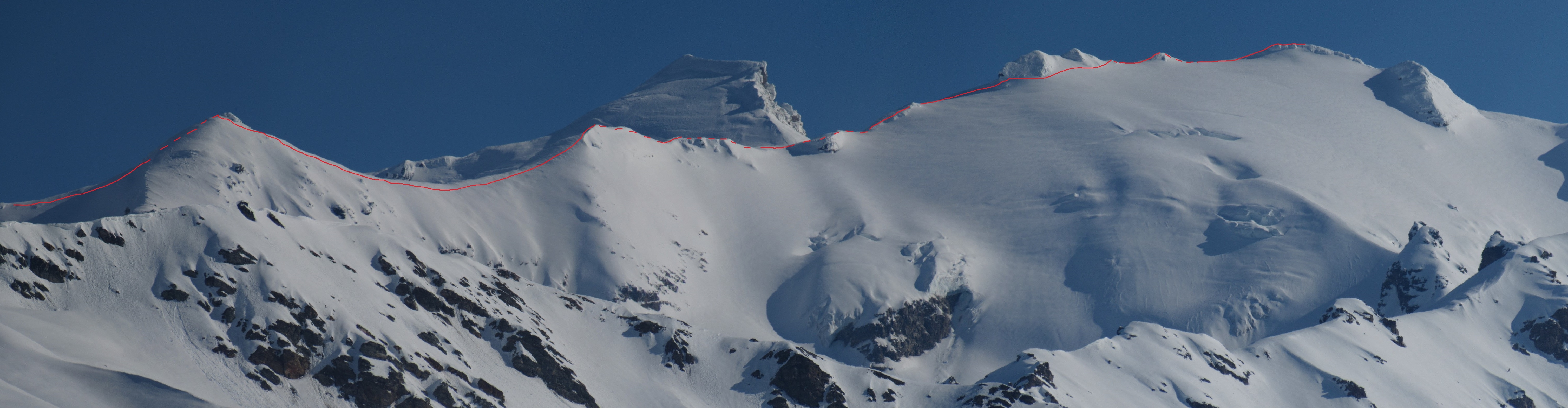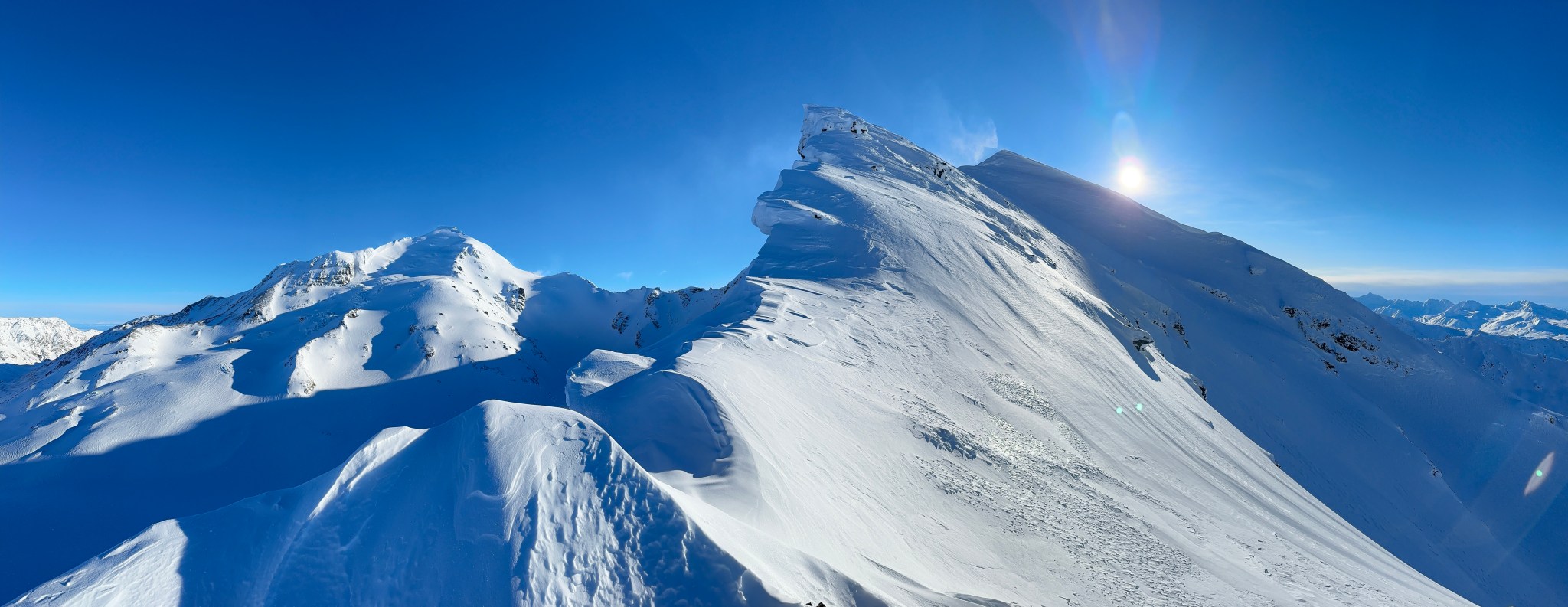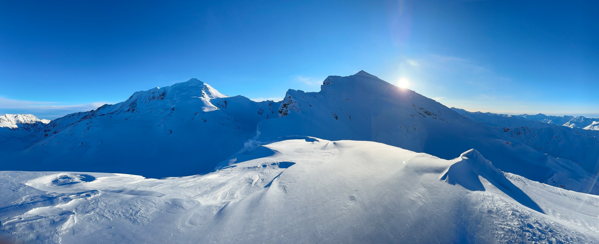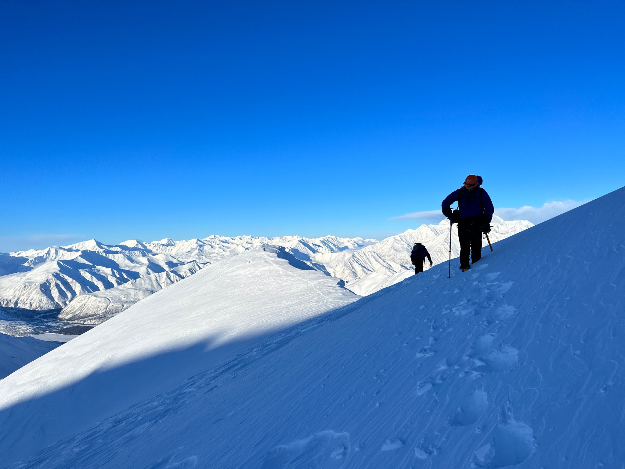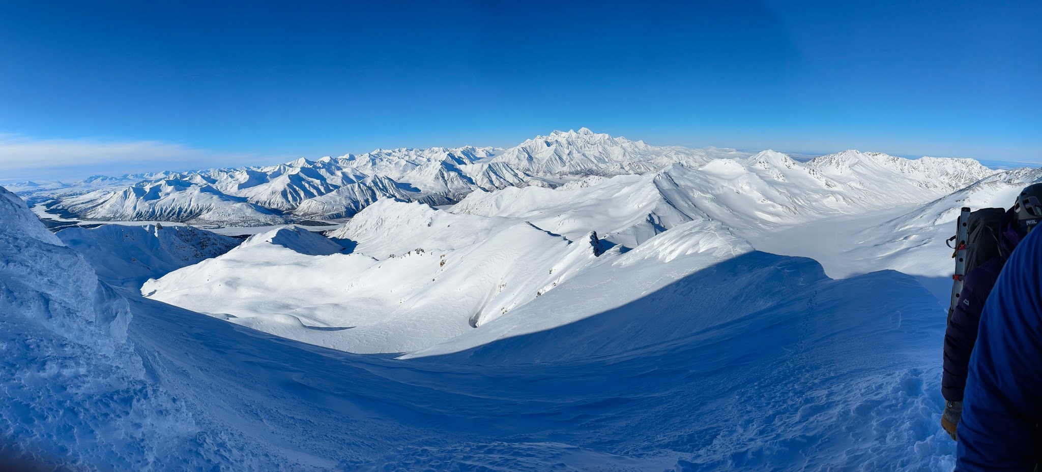 This part is just a blur in my memory, I was too focused on finding the route back, moving safely, and keeping track of my partners in the whiteout to recall specifics. It wasn’t my favorite part of the trip, but knowing we had already crossed it gave me confidence there was a route back we could find. When we finally made it to the gentle slope leading back to “Michael Peak”, Stefan said he felt like we were close to being off the ridge but he wasn’t sure. “No, it’s okay, we really are past the worst of it!” We made our way to the top of the headwall and noticed blue sky opening up above us…now?