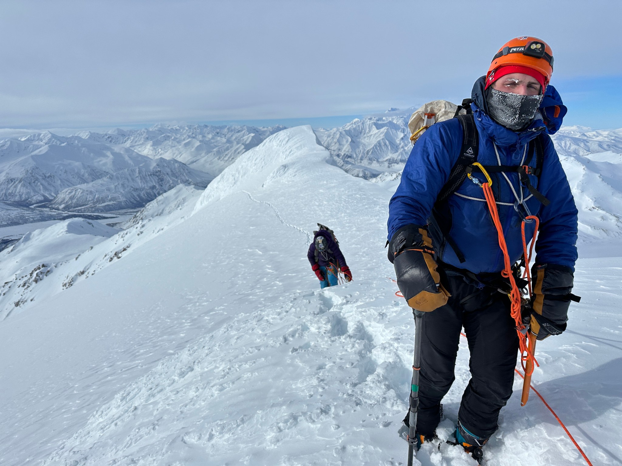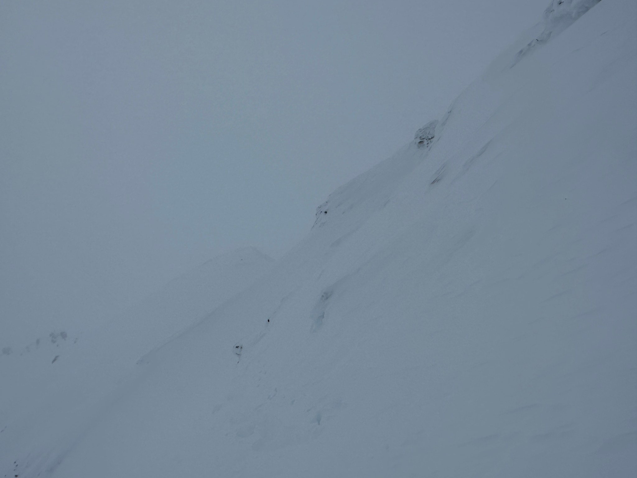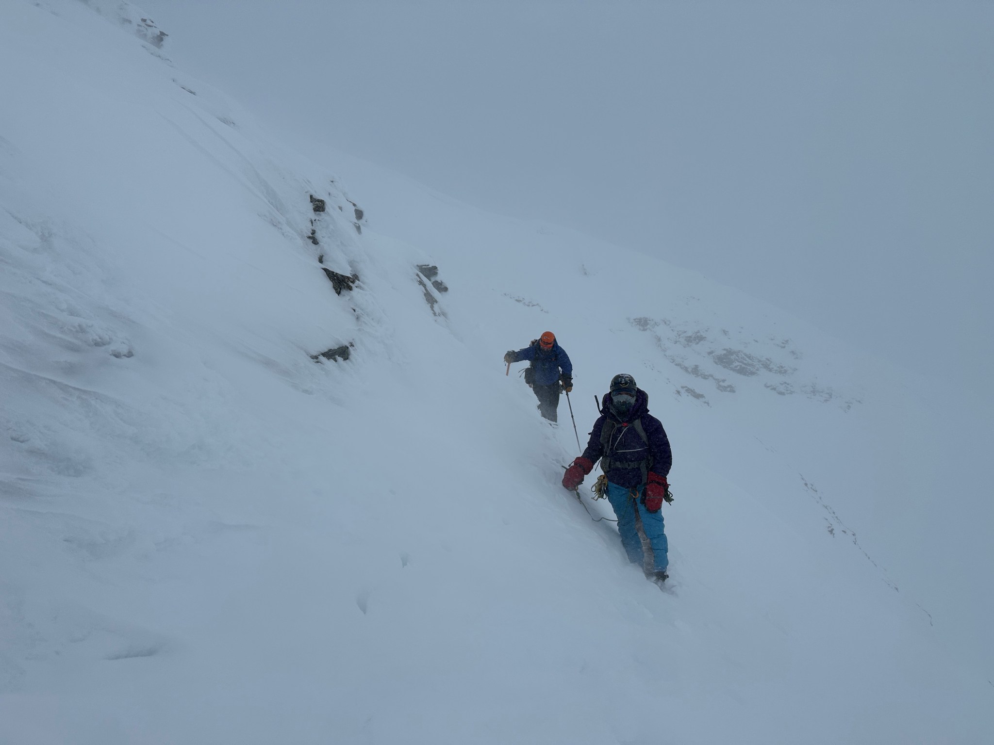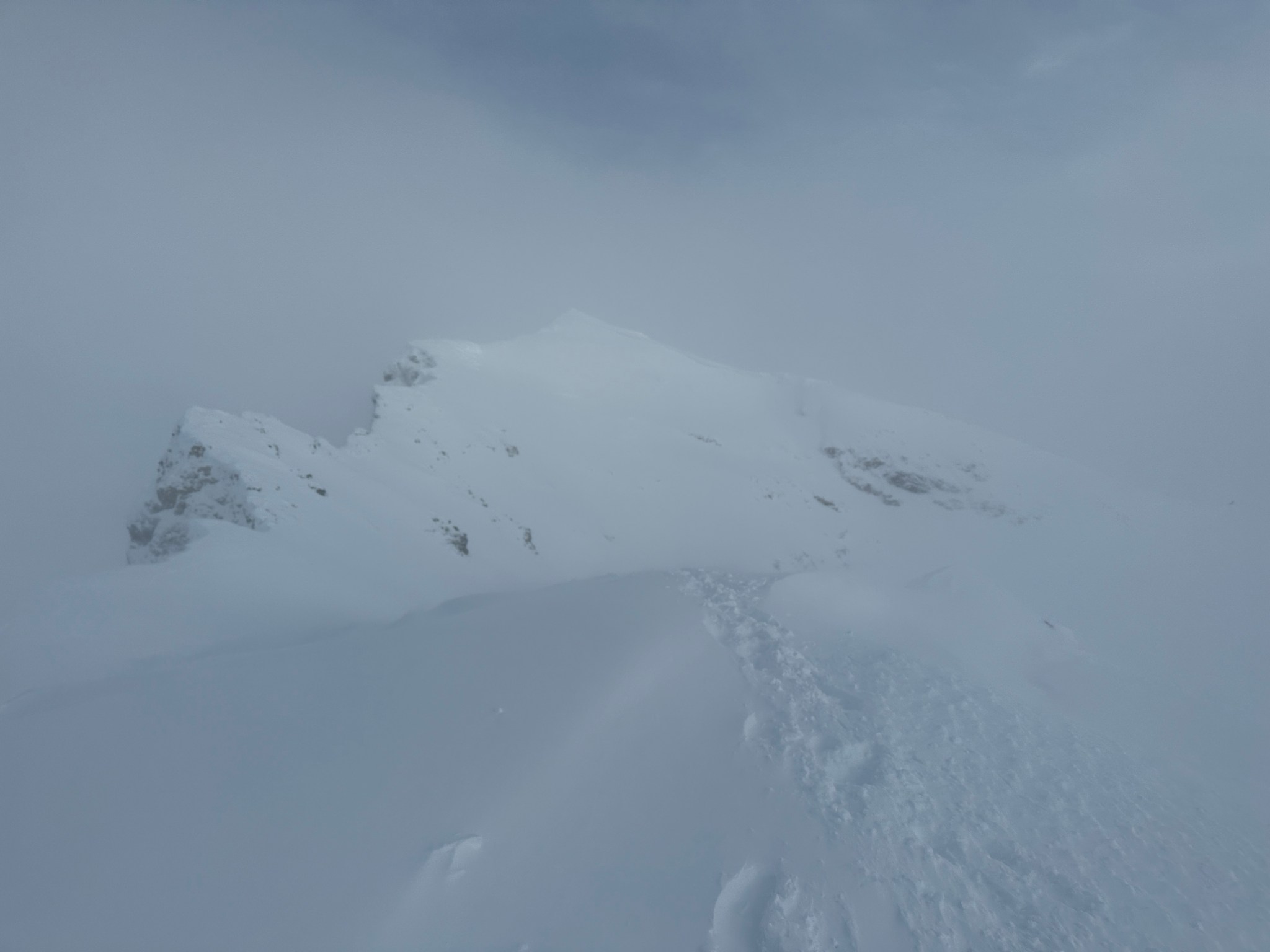On our ascent when it was sunny, we had discussed taking the southwest ridge down and crossing Trim’s valley to access Michael Creek, avoiding the exposed west ridge and the headwall downclimb. However, that no longer seemed like a viable option in a whiteout storm. Luckily it wasn’t too snowy, mostly just clouds and wind. We were already accustomed to wind. We unroped at the false summit and started the traverse down the steep west ridge, which wasn’t too complicated to navigate physically, but after only a few hours our bootpack had already been mostly obliterated by the wind. I was able to connect vague footprints and mountaineering axe holes to lead us back across. I really wish I had brought wands.