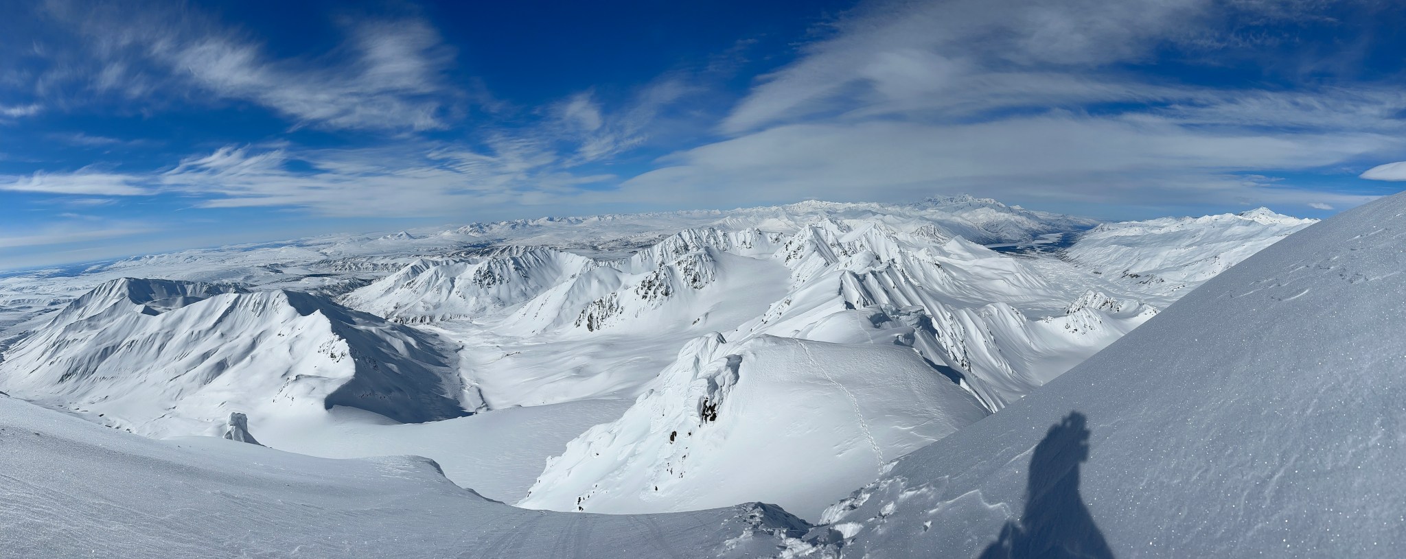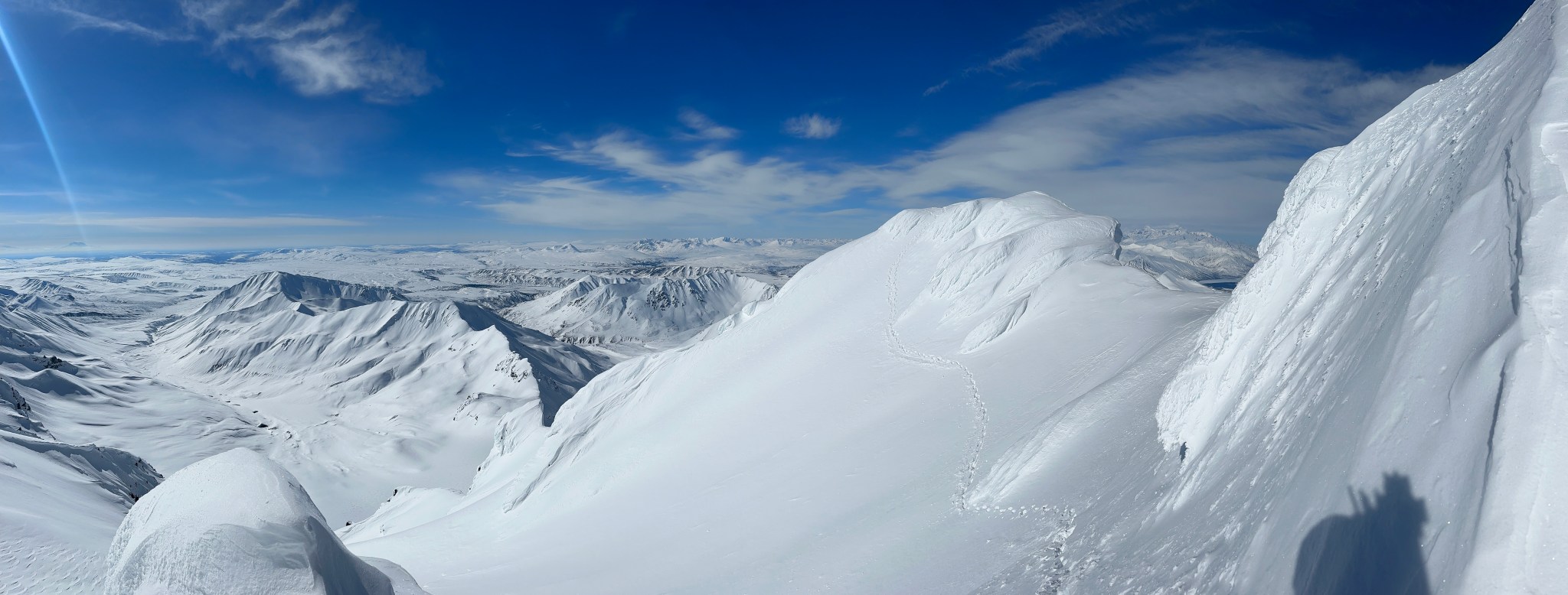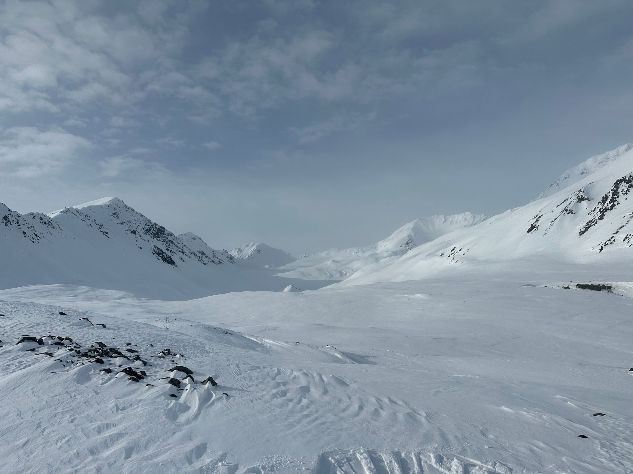 I understand why the previous bootpack was so hard to ascend: the previous party had slid down their own path. While this was also an option for me, I found glacading down fresh snow more enjoyable when I didn’t have to downclimb. I reached my skis around 4:30 and had a very pleasant break. Finally off the steep terrain, part of my mind could relax. I used Claire’s jetboil to make some water for myself while I ate, removed a layer, and texted. The unexpected cell service might have been due to the coinciding Arctic Man event. Strapping my boots tight, I prepared to ski back to my truck.