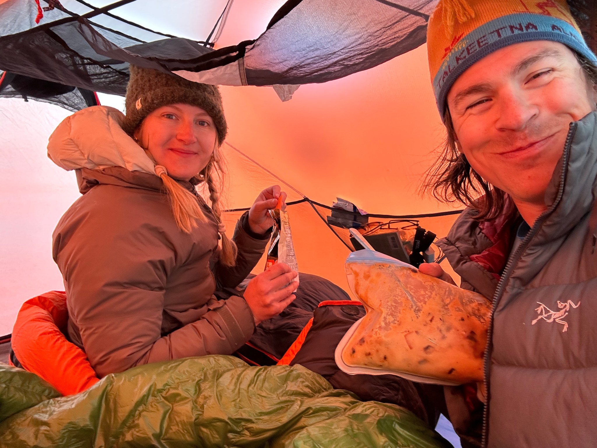 Claire and I kept skiing until we reached the moraine, then gained it via a low spot on the west. I had thought about skiing further up the valley, but eventually realized the best vantage point was the top of the moraine. I assumed the moraine’s high point would be further back up the valley; instead it was about halfway up the valley or less. Claire was happy to be done skiing with a pack! We spent half an hour getting a tent platform stomped and leveled, and then set up the tent. I started the snow-cooking for dinner and water, then left to go dig the latrine. Around 8PM I spied new ski tracks descending the West Gulkana Glacier and was suddenly tempted with the idea of ascending Institute the next day, rather than Rainbow or McCallum. Analyzing the various risks associated with soloing the mountain, I determined they weren’t much greater than Rainbow, trading steep slopes for glacier travel. After discussing my idea with Claire, she had no objections (though she did wonder what she was going to do with herself until 3PM). We ate dinner and fell asleep. Osiris the husky had trouble getting comfortable and insisted we share the double sleeping pad; eventually she and I negotiated a truce where she laid at my feet and I rested my legs on her.