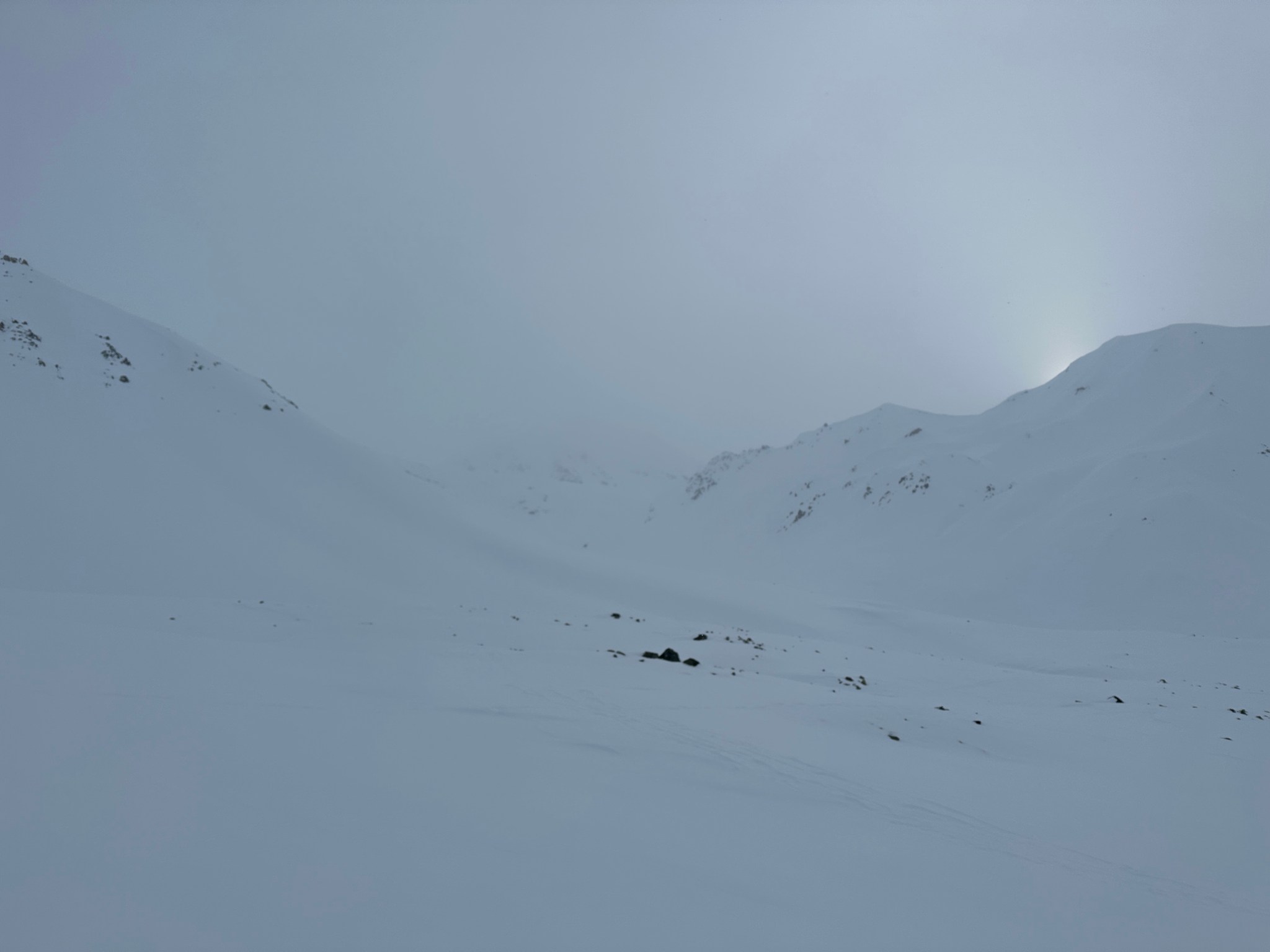 At 2AM I was up, skiing by 2:30. The clear weather that had tucked us into bed had vanished, replaced by clouds of unknown elevation. Skiing entirely in the dark for many hours would have been eerie, but this was far from my first nighttime trek in the Deltas. It helps to have a trail to follow! I noticed yesterday’s ascentists had skied out the previous evening. Nothing of note occurred, I gained the West Gulkana Glacier tongue and made my way to the ridge. The ridge was the only object not engulfed in clouds. I could have begun my ascent by 6:30, but judging the swirling storms, I decided weather was going to deteriorate. I did climb up the ridge a little to see what the snow was like, playing around with the idea I still could make an attempt. I let my mind free to weigh all the risks and rewards without my conscious input, and the conclusion it came to was pretty clear.