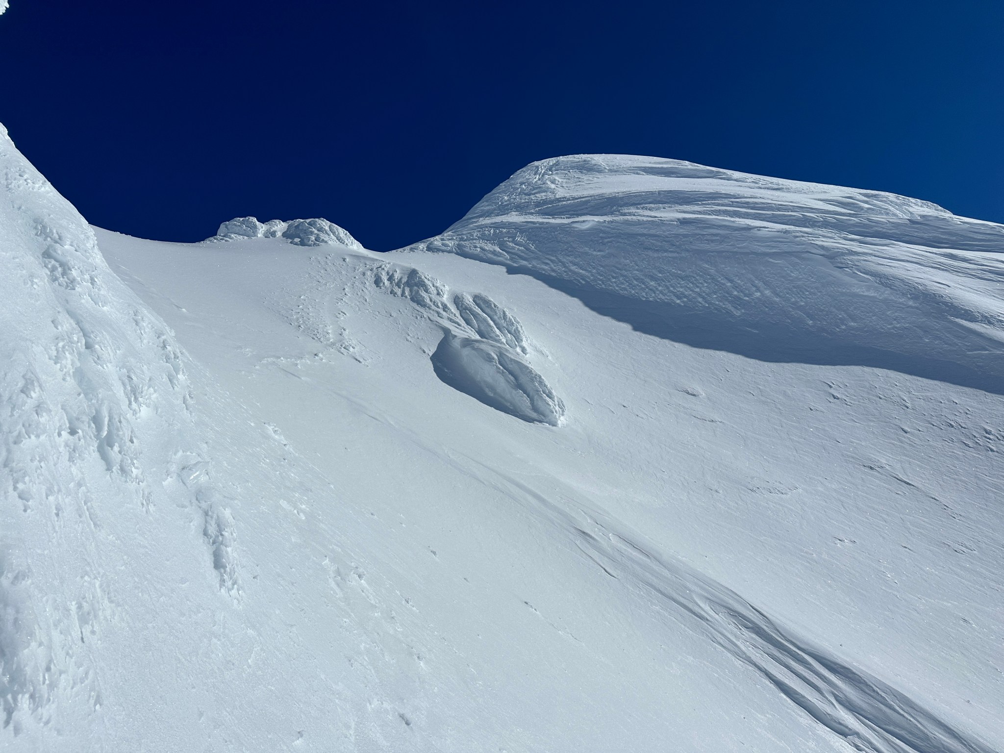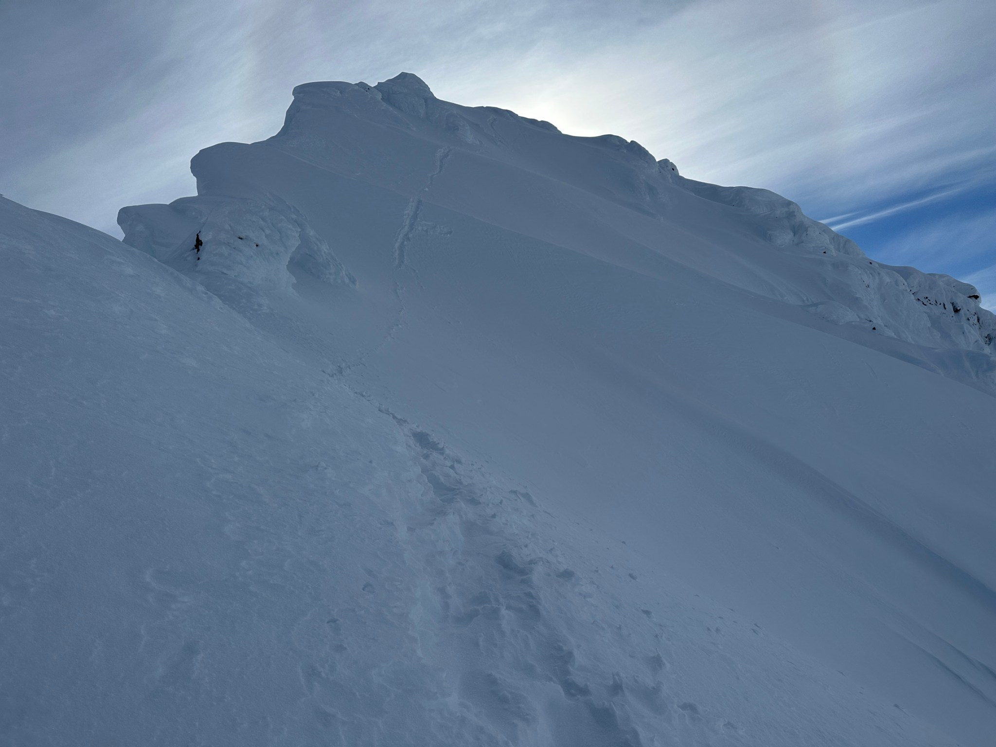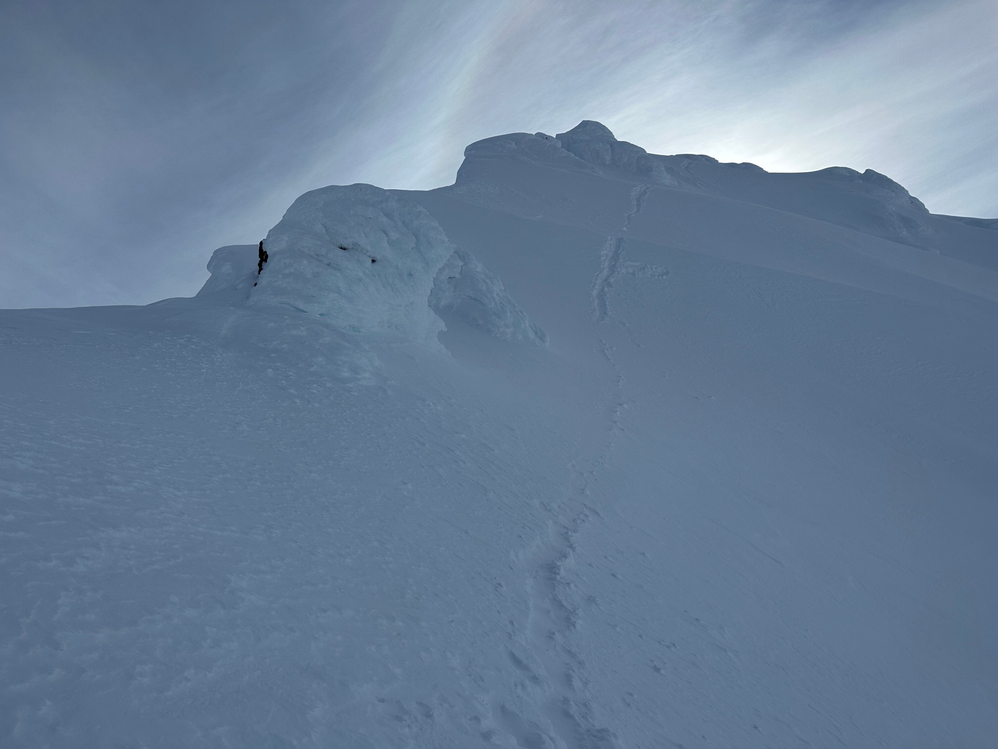 I reached the false summit and took a short break. From here, I thought I could see the true summit but cautioned myself against believing such folly. Foreshortening is a tricky devil, and what would be the point of forming some sort of belief or expectation? I traversed the inside of the ridge, near but not quite on top (to avoid breaking off cornices). I tended to stay above (left of) the old bootpack, for avalanche safety. Being so high on the ridge had me fairly comfortable with the potential avalanche danger; they tend to pick up speed as they move, and if I happened to set one off the potential for getting free seemed high.