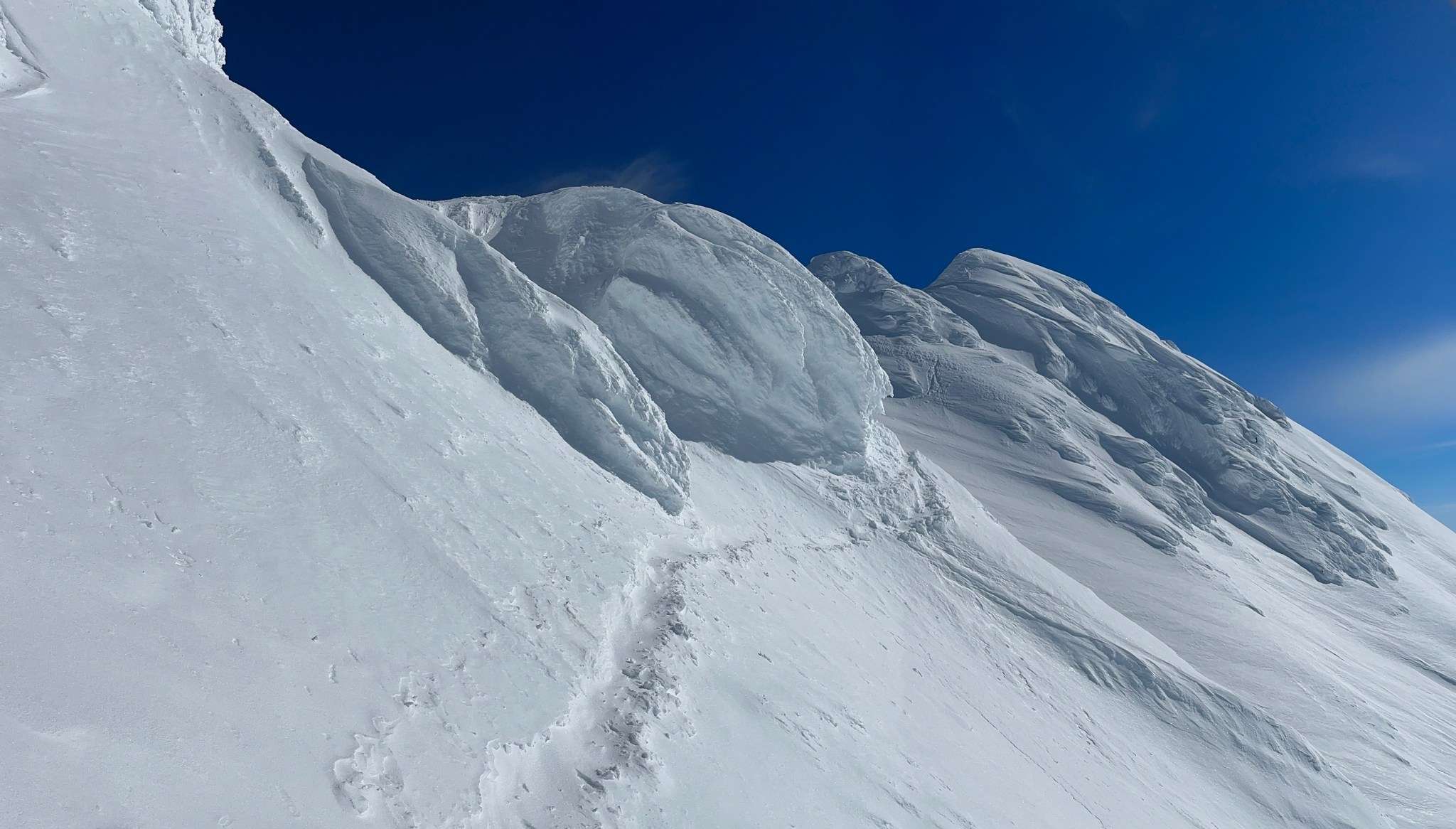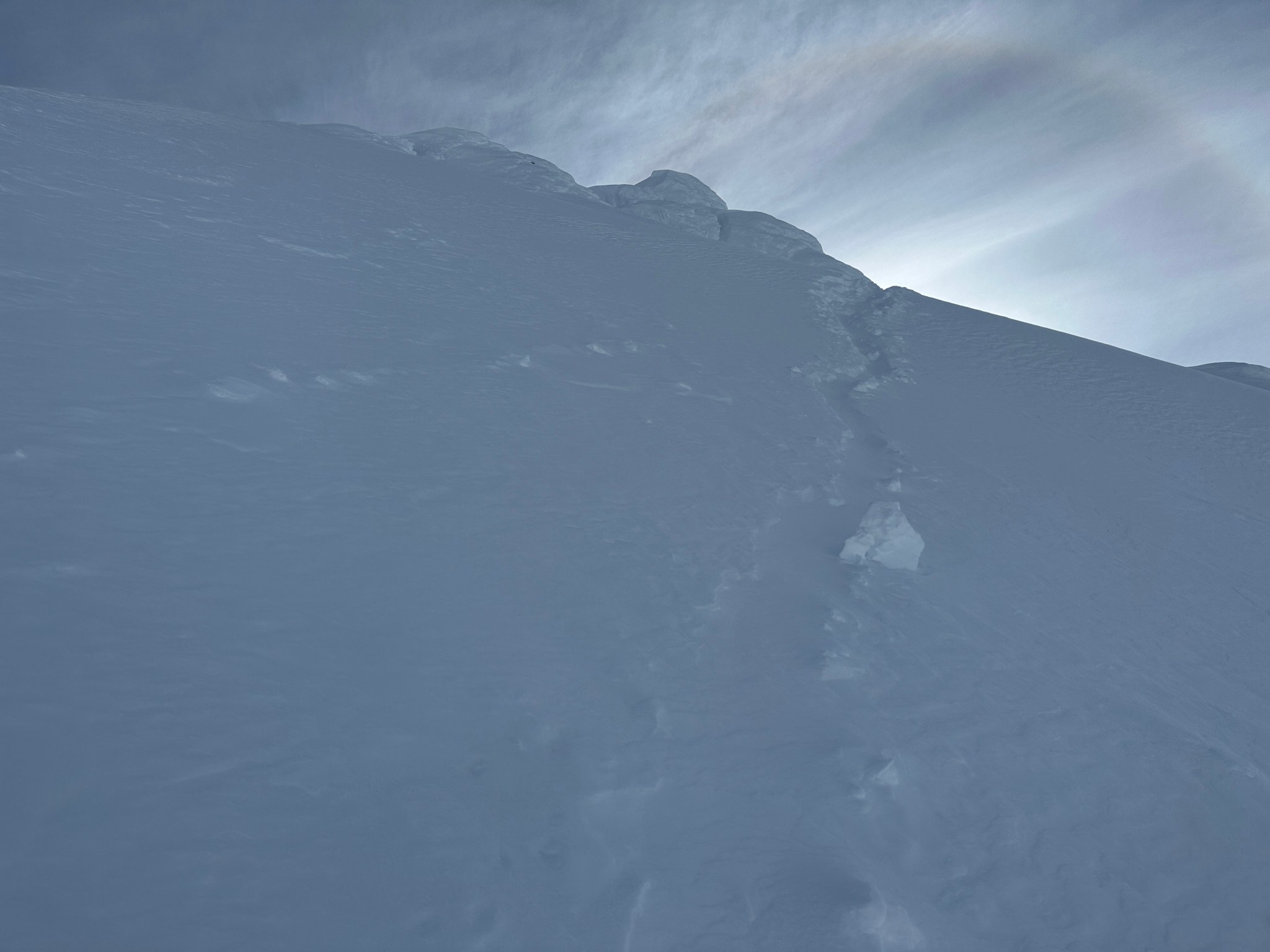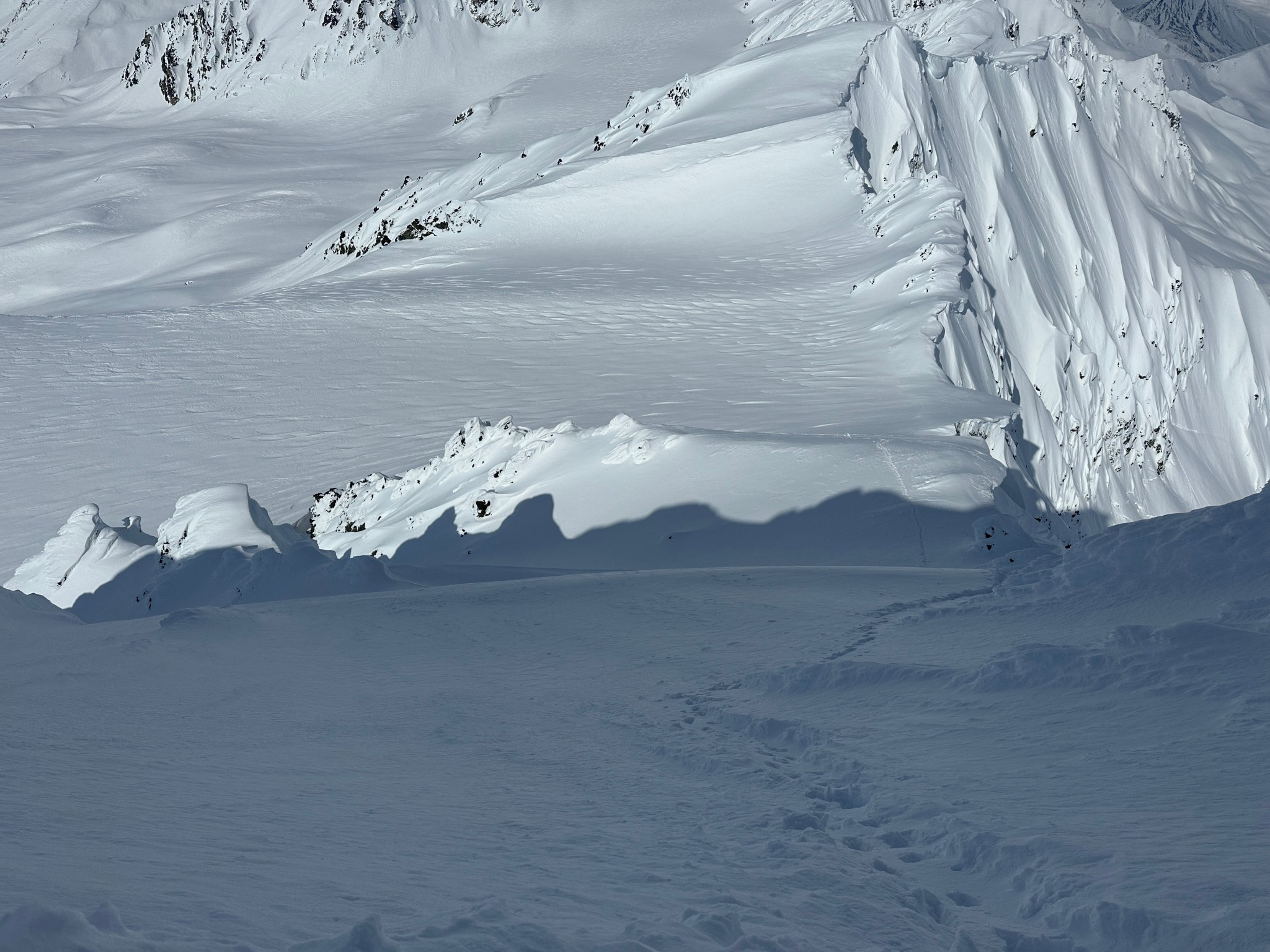 As I followed the trail up the glacial tongue, the skintrack would entirely disappear at times. The snow that filled the skintrack fractured and slid easily on the 30ish degree slope, making me wary of relying on it too much. The sun hit my face as I crested the tongue and moved onto the glacier proper, though it was quite buried in snow. I reached the ridge and stabbed my skis deeply into the snow, up to the bindings…just in case.