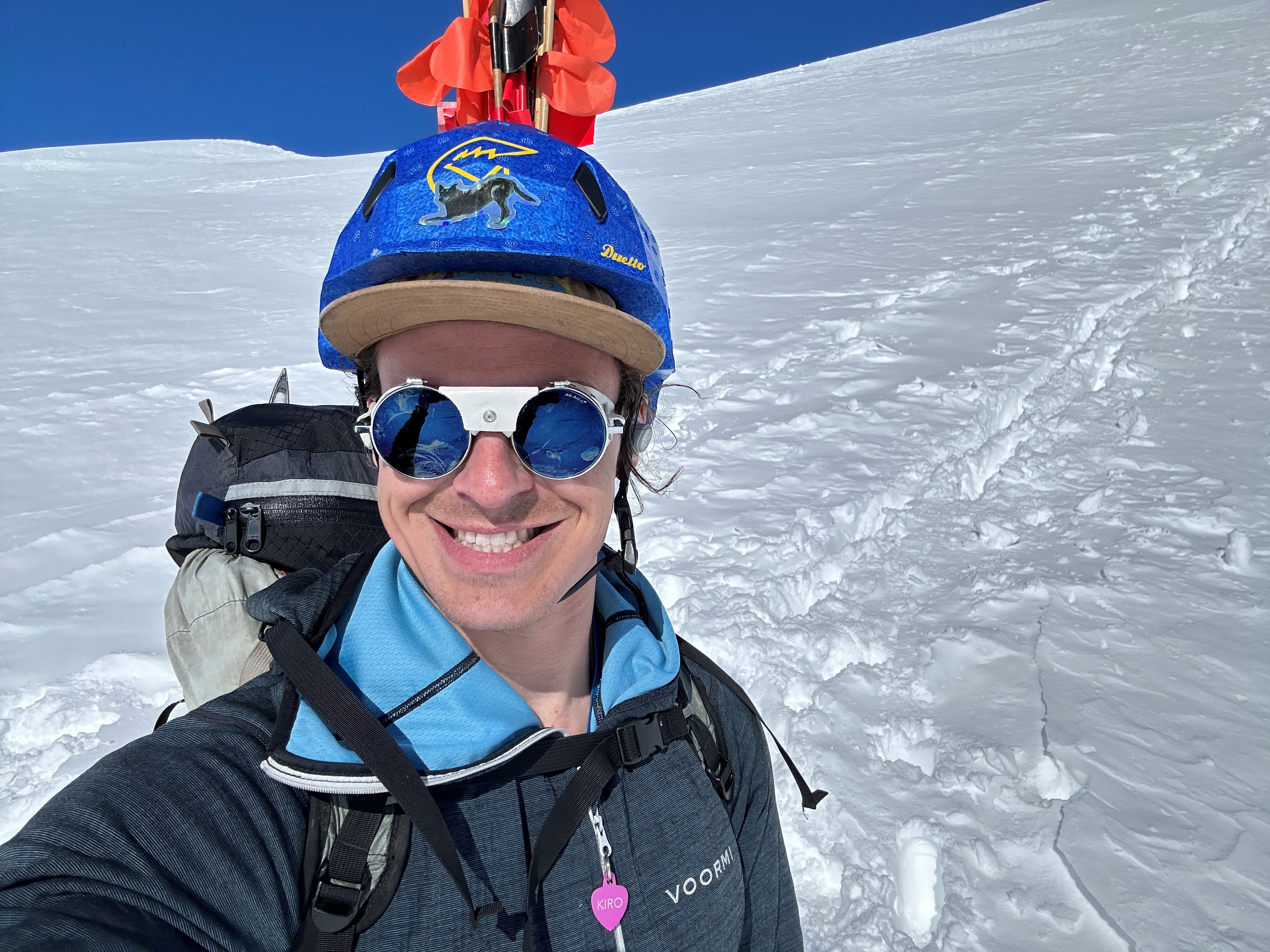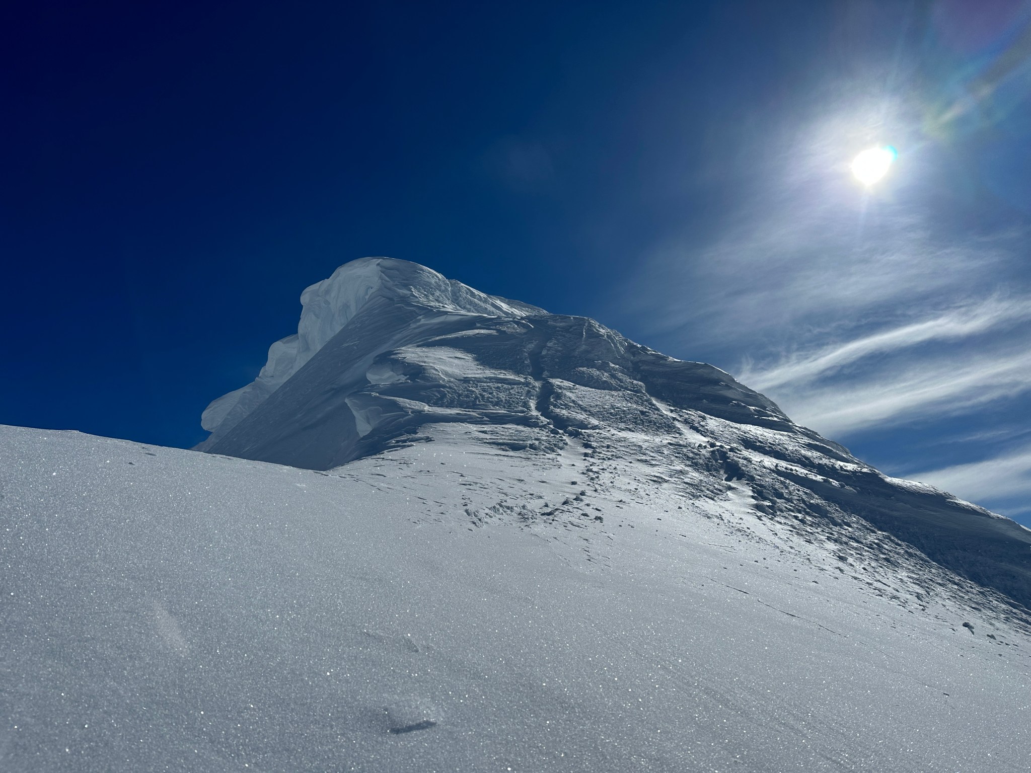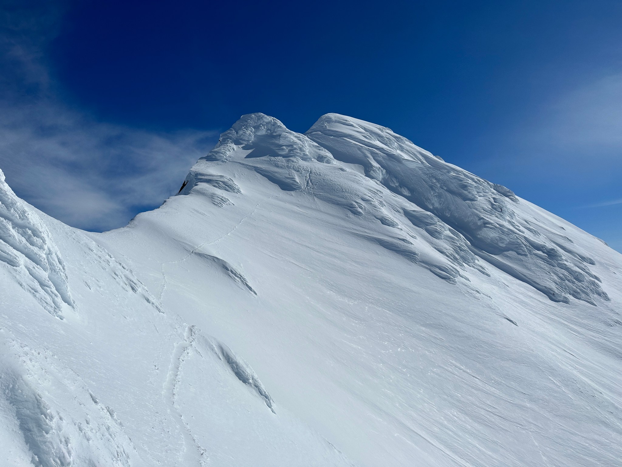 As I followed the trail up the glacial tongue, the skintrack would entirely disappear at times. The snow that filled the skintrack fractured and slid easily on the 30ish degree slope, making me wary of relying on it too much. The sun hit my face as I crested the tongue and moved onto the glacier proper, though it was quite buried in snow. I reached the ridge and stabbed my skis deeply into the snow, up to the bindings…just in case.