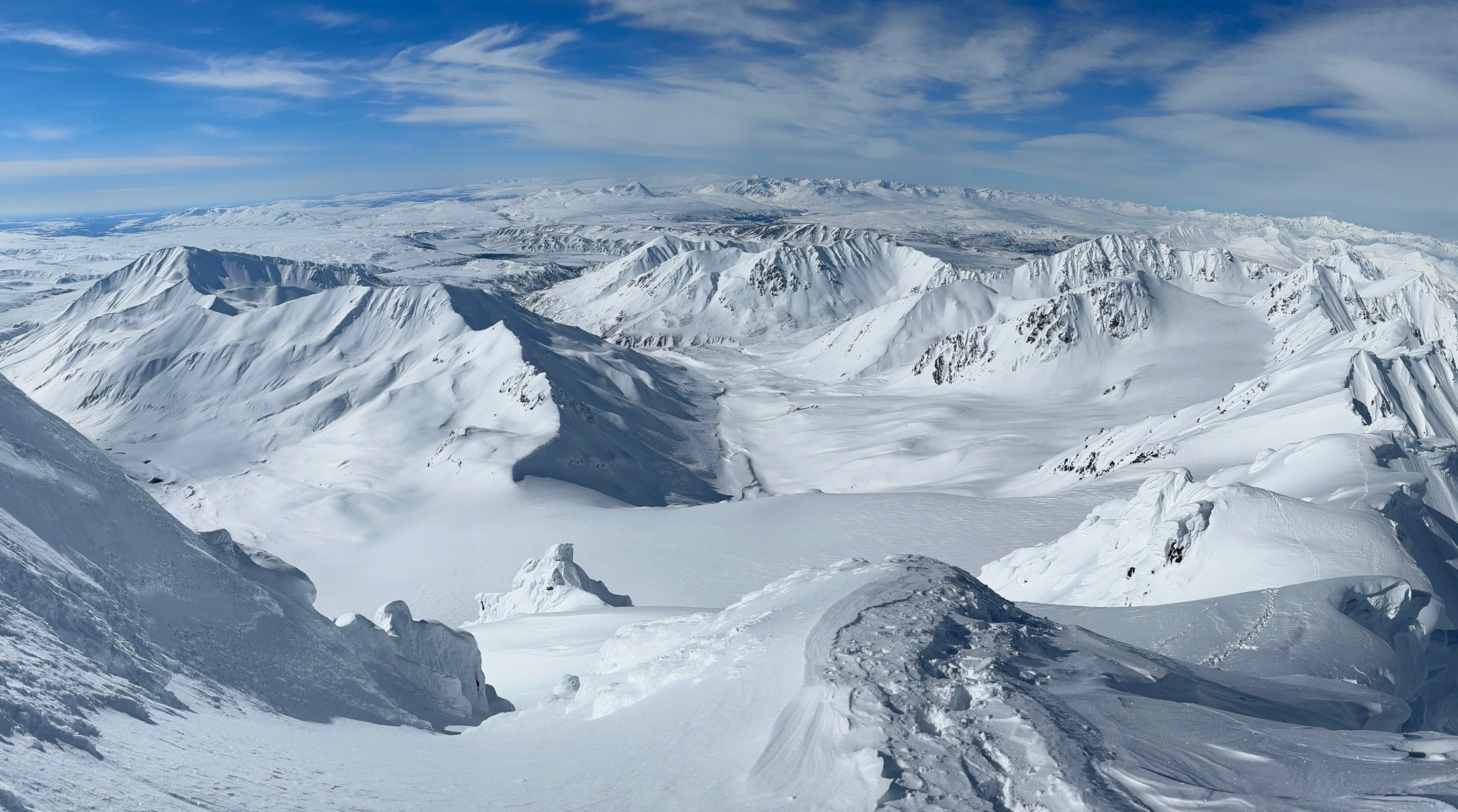 The final climb to the summit took more time than expected. Even on an 8000’ peak (relatively small compared with Silvertip or White Princess), things are bigger than they seem. I reached the top around 1PM and hung out for about an hour. The wind picked up as I reached the top, for the first time in the day. It had been pretty eery climbing the ridge in clear and still weather, with the occasional breeze blowing by to cool me down. I took hundreds of photos (final count for the trip was 1,715) while I hung out on the tiny fin of a summit, watching the clouds slowly burn away and the shadows move across the valleys. I could see the Wrangell Volcanoes, Mount Sanford and Mount Drum, 80+ miles to the south. To the north I could easily see the north side of the Deltas, from Item all the way to Snow White. Gakona and the unnamed peak next to Snow white were fairly engulfed in clouds though I did spy the Yeti’s Cap’s southern aspect for the first time. Mount Kimball, the highest peak in the Deltas, was visible as a distance mass of rock and ice. Beginning to feel stiff, I promised myself “okay only a few more pictures” a couple times before beginning the downclimb.