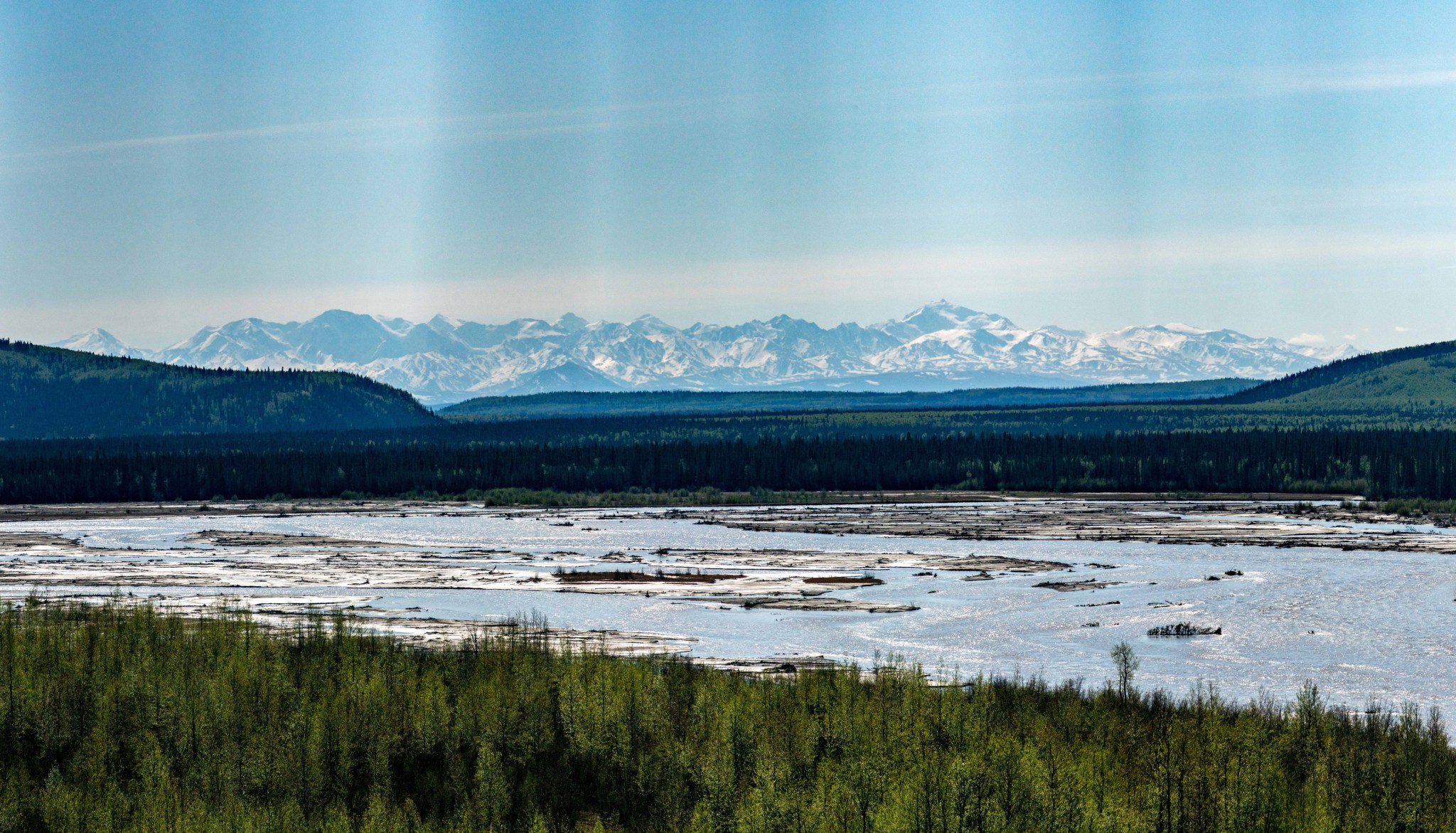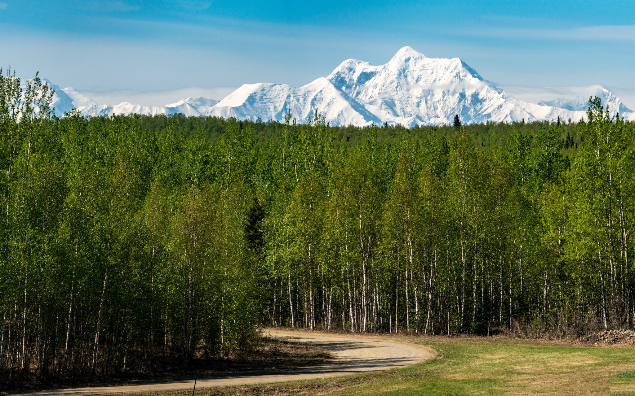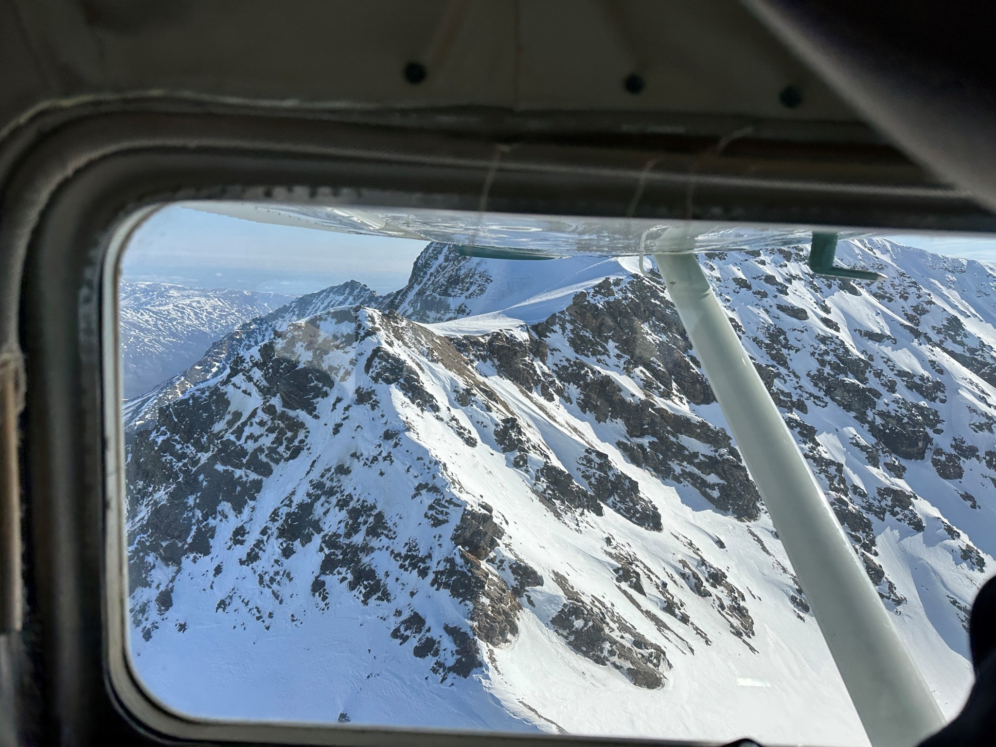 We got up around 6 or 7 and noted there were still some winds, but the sky had finally cleared. 9AM approached the winds died down considerably, and Jessie landed shortly after. I asked him if he’d mind doing a couple loops around the Basin so I could take some photos, he was game. We did one big loop around the valley as we gained altitude, and a second where we flew over the O’Brien Icefall and got a view of White Princess’s north face. I got the photos I wanted as we flew past the Old Snowy/Blackcap ridge, then over the 8,000′ pass we had previously gained on our Double Exposure attempt. As we flew back to Delta Junction and landed, green returned to our color spectrum and overwhelmingly so! Spring had turned into full-blown summer, the brown replaced by magnificent green. As Quinn and I drove down Golden Eagle Road, we spied the monsters of the Hayes Range peeking out over the bright-green fields and I had to stop to take photos.