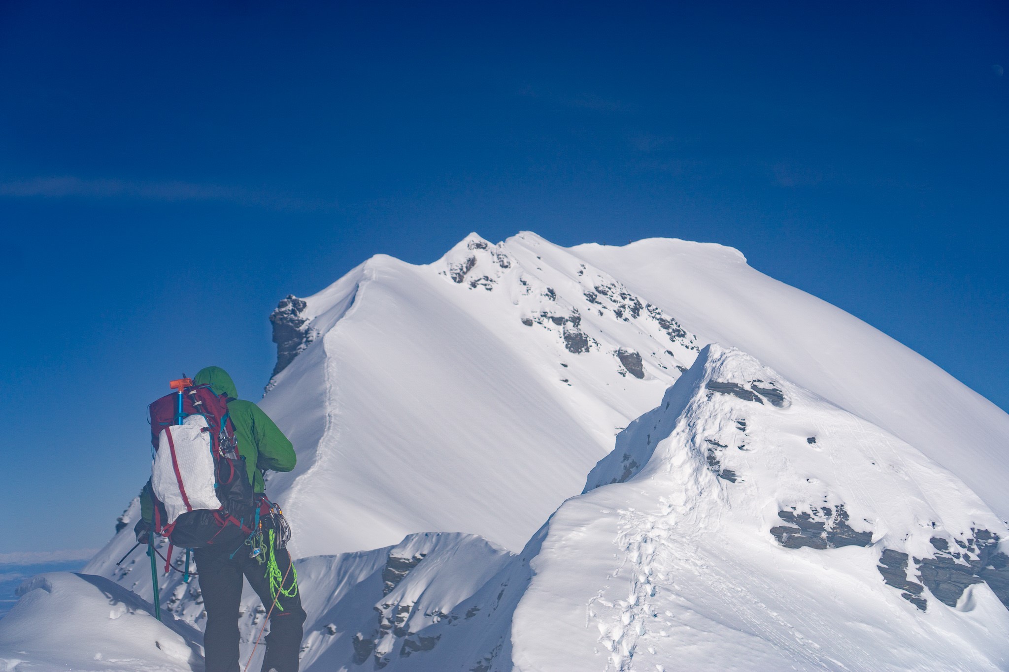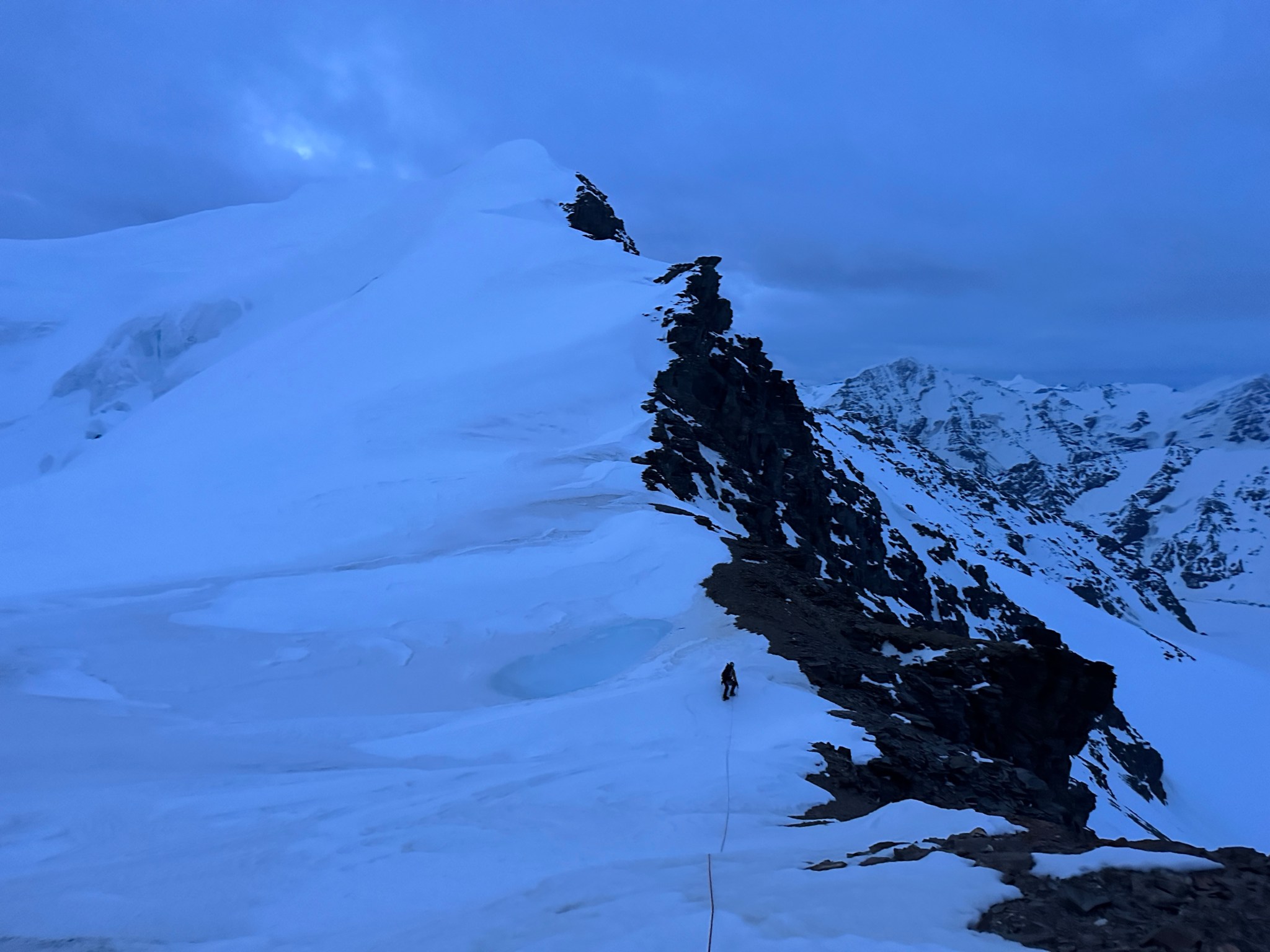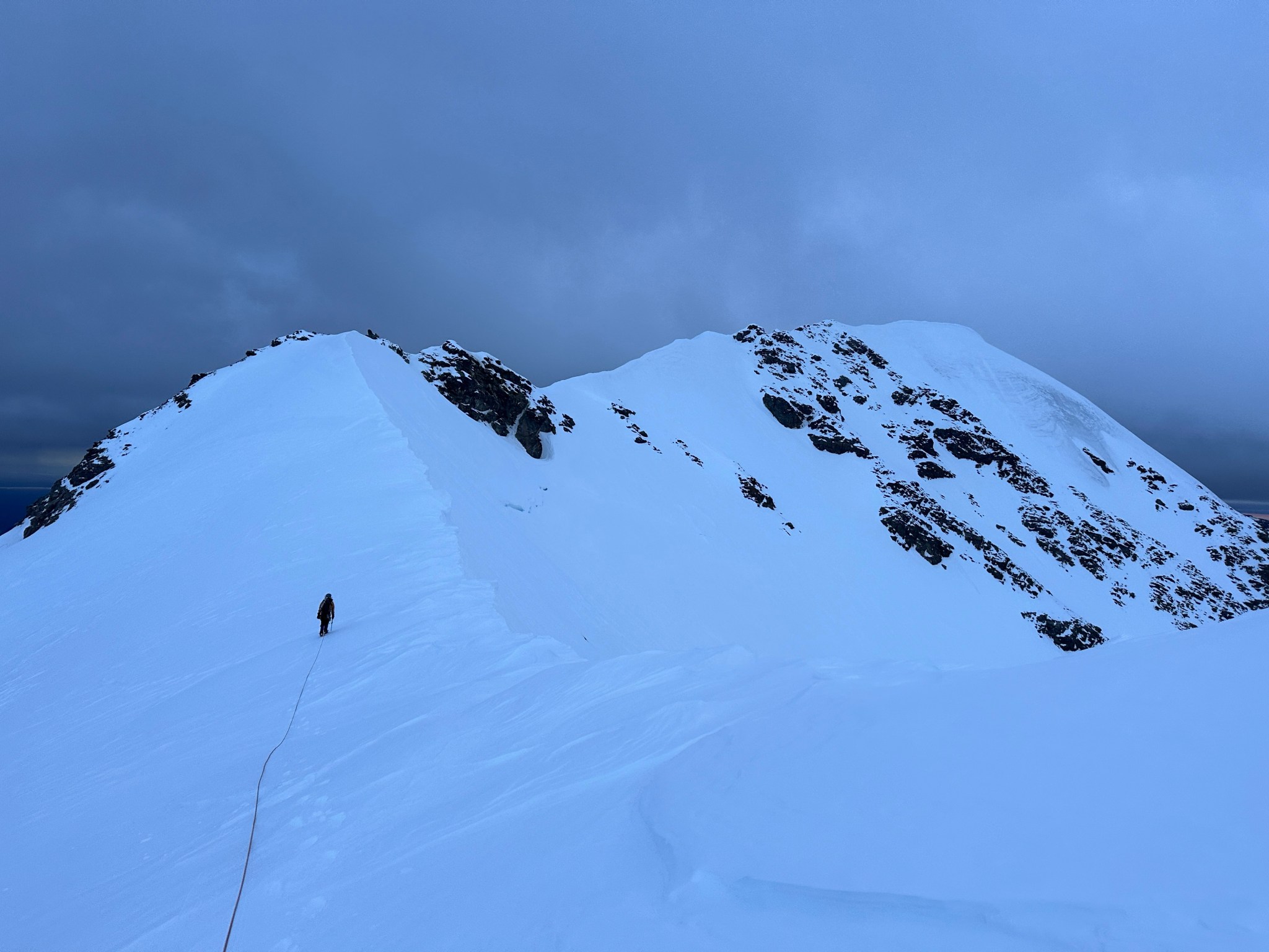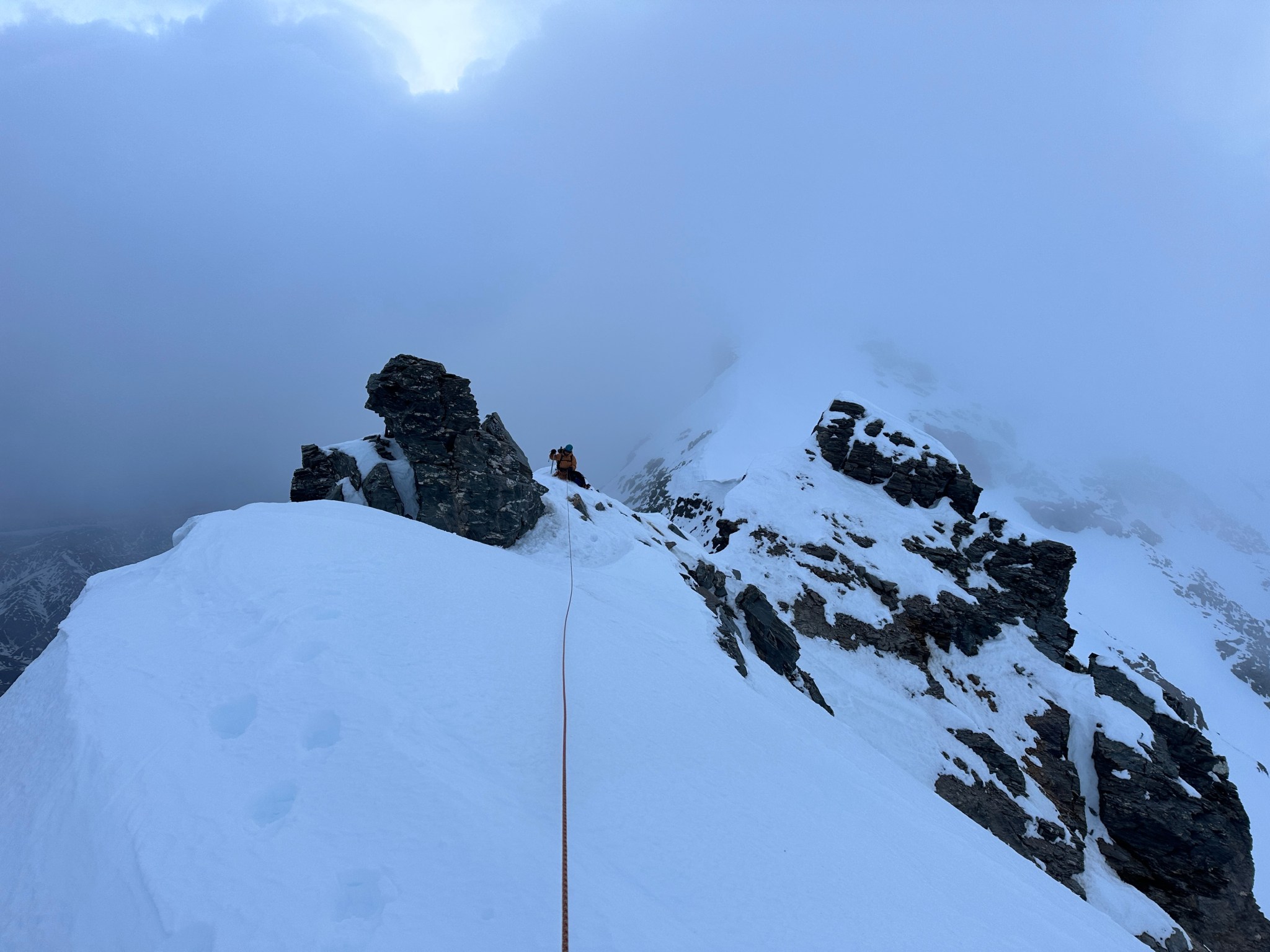 The false summit ended up being less-steep than predicted and we simply climbed over it and continued onto a knife-edge, Quinn placing a picket for protection. I also left a wand somewhere on the ridge for good measure. This peaky feature was much more intimidating from the sky and glacier than the ridge.