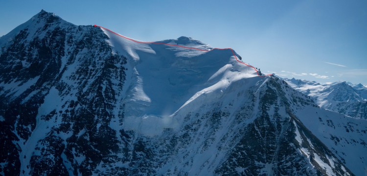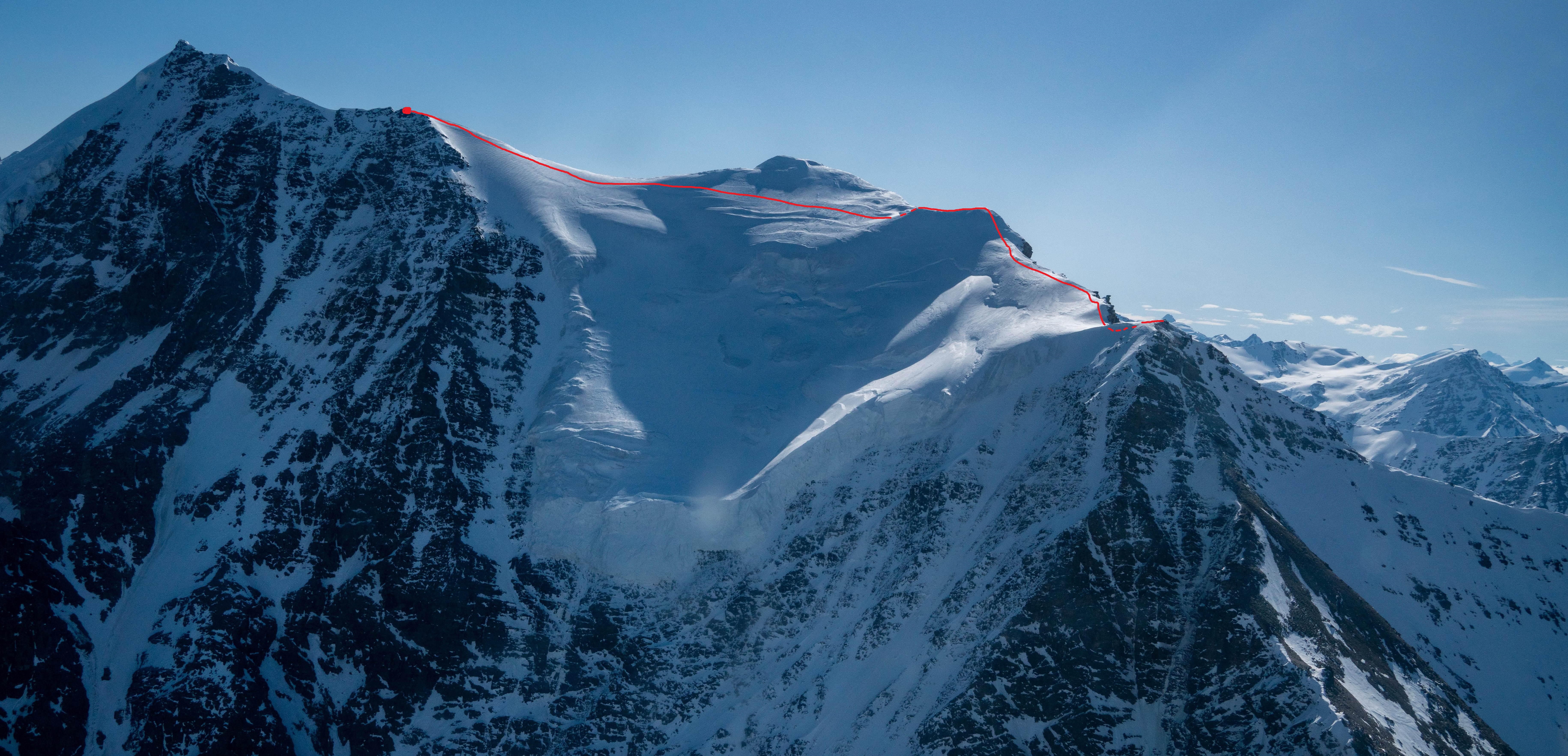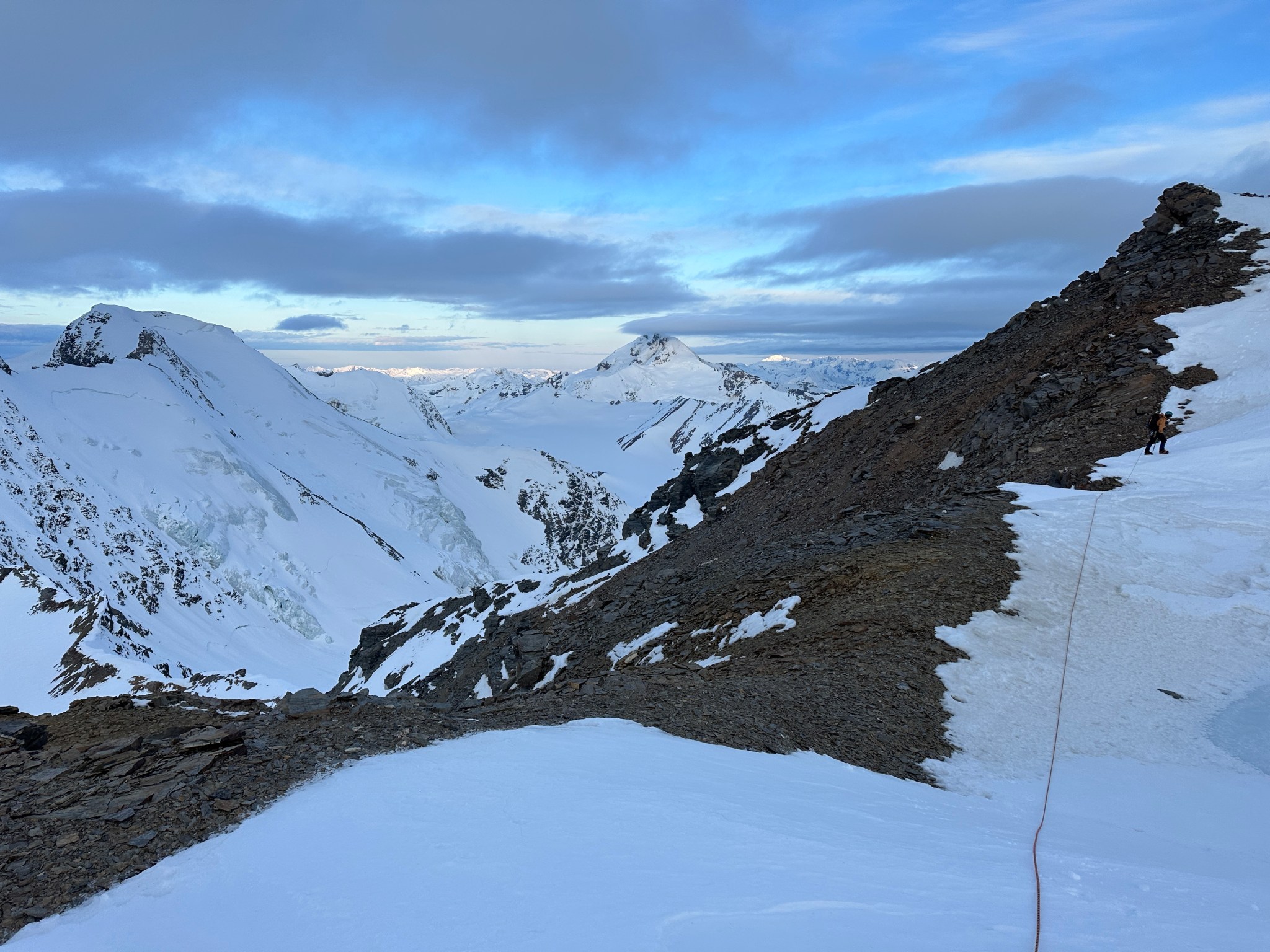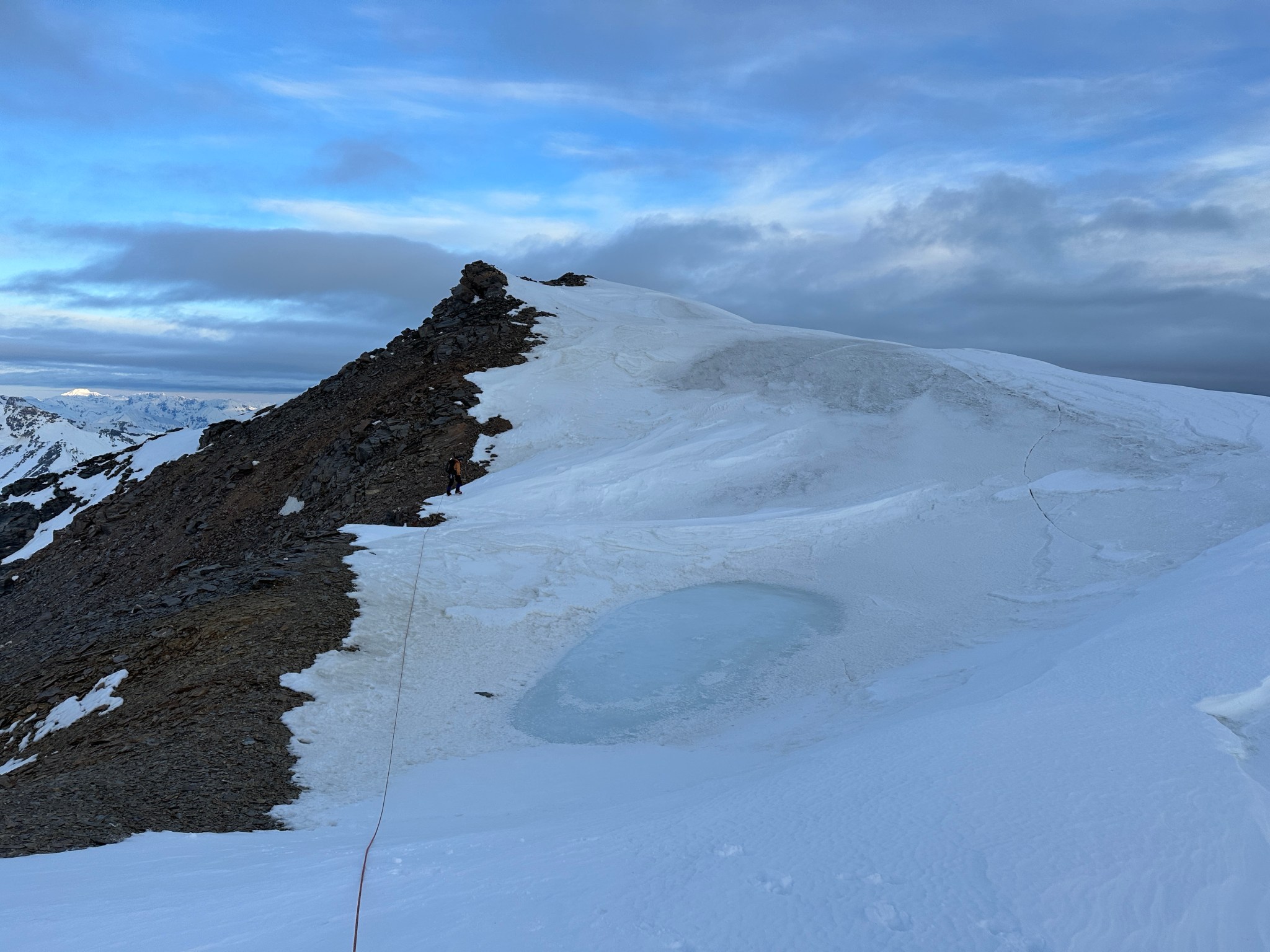 The false summit ended up being less-steep than predicted and we simply climbed over it and continued onto a knife-edge, Quinn placing a picket for protection. I also left a wand somewhere on the ridge for good measure. This peaky feature was much more intimidating from the sky and glacier than the ridge.