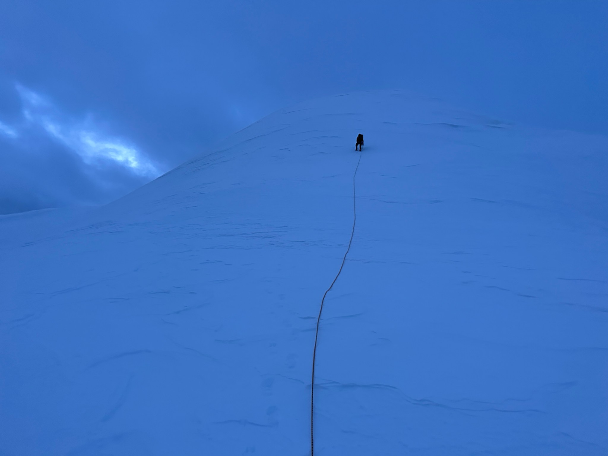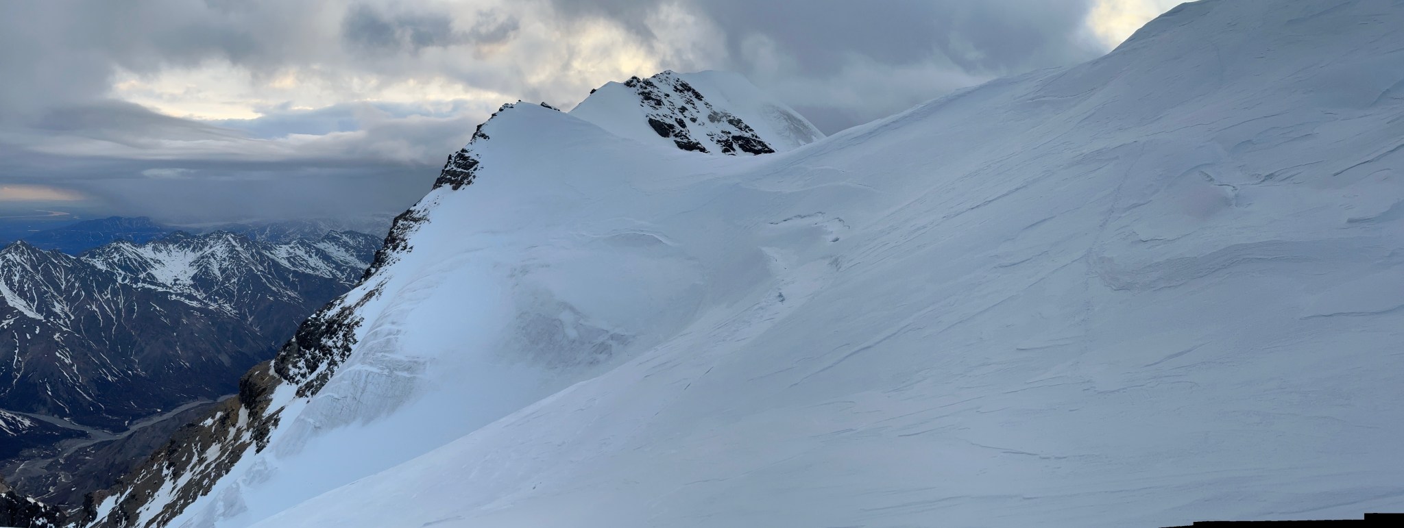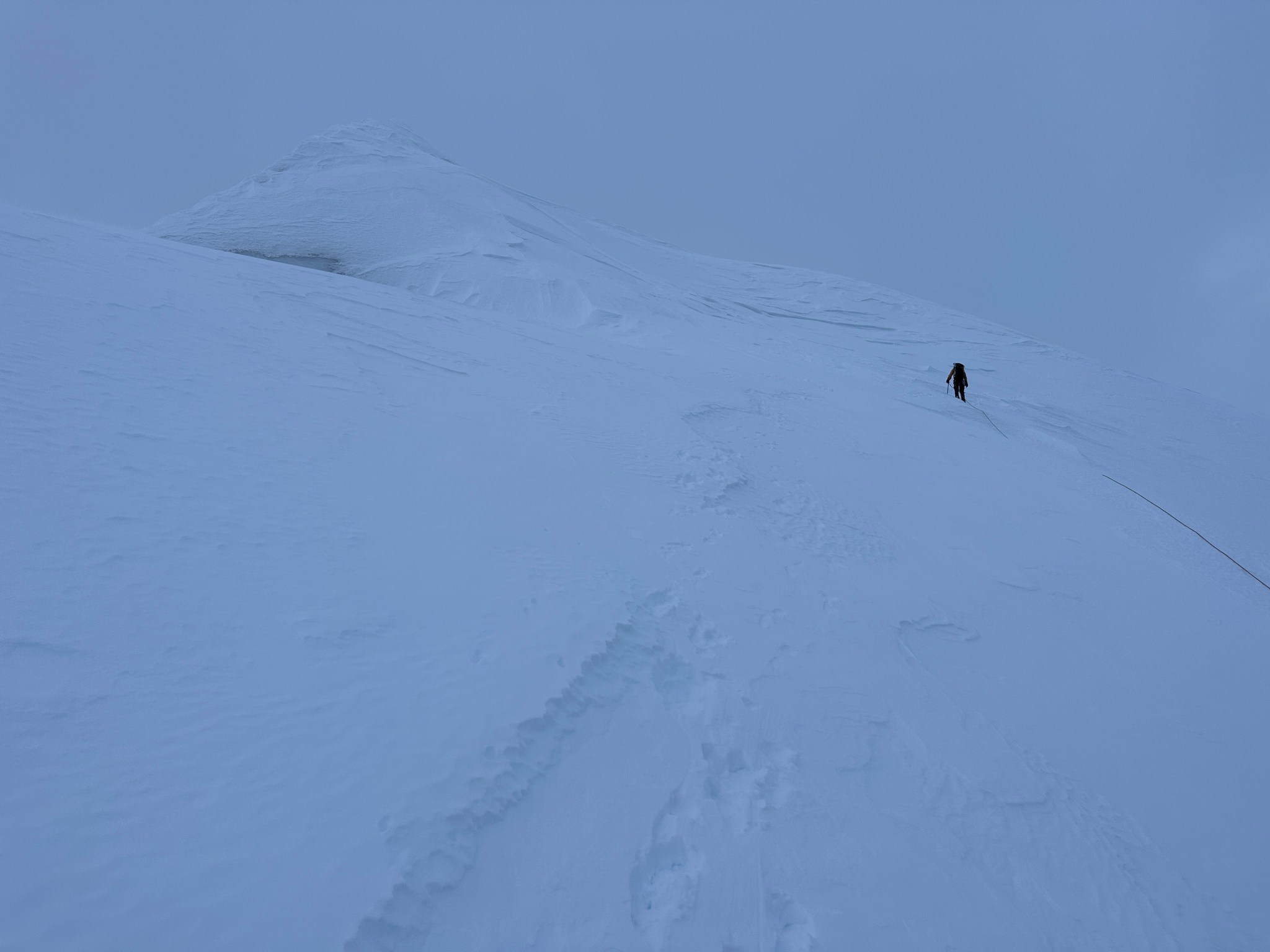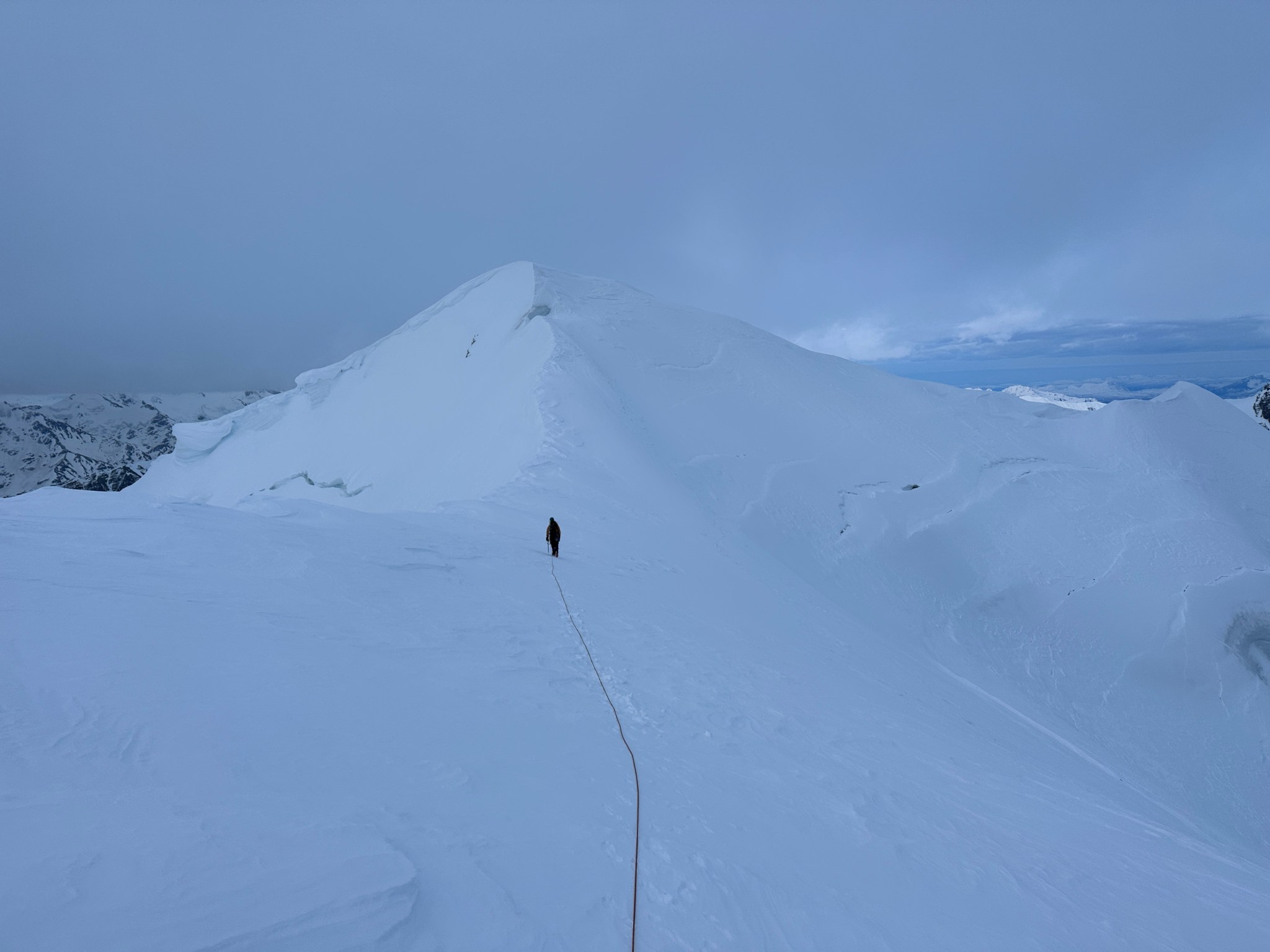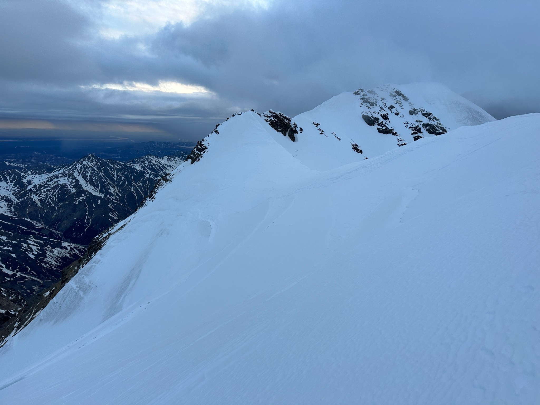 The 4000’ drop to the west was less astounding due to the distracting number of large crevasses directly below us; it wasn’t quite an icefall, but traveling straight up or down the bowl would require a lot of traversing back and forth to avoid a crevasse fall. And of course there was a massive ice-cliff at the bottom of the hanging glacier. Thankfully we were able to avoid all visible crevasses by traversing high and skirting the rim of the glacier bowl, eventually gaining the mellow ridge between the lower summit and the summit ridge proper. Quinn pulled in rope as I joined him at the start of the summit ridge, a bit confused as to what I was looking at. I asked if this was the route and he said “yes, but it’s time to go down”. The ulu blade of a summit was being consumed by clouds, and increasingly so.