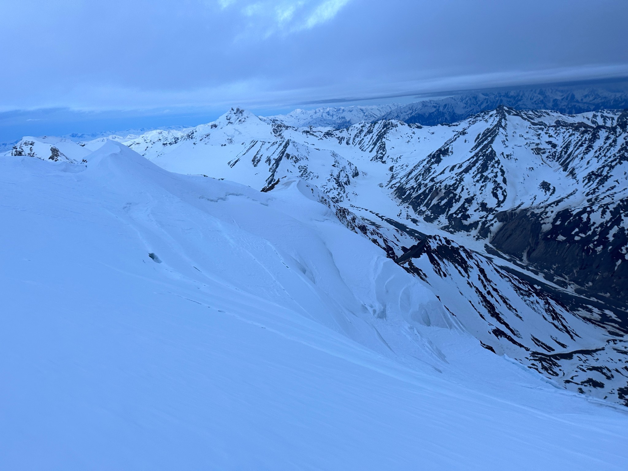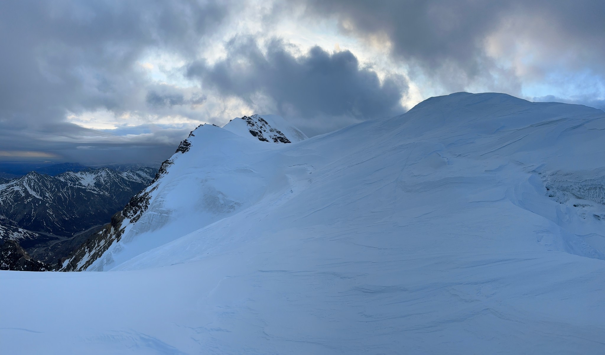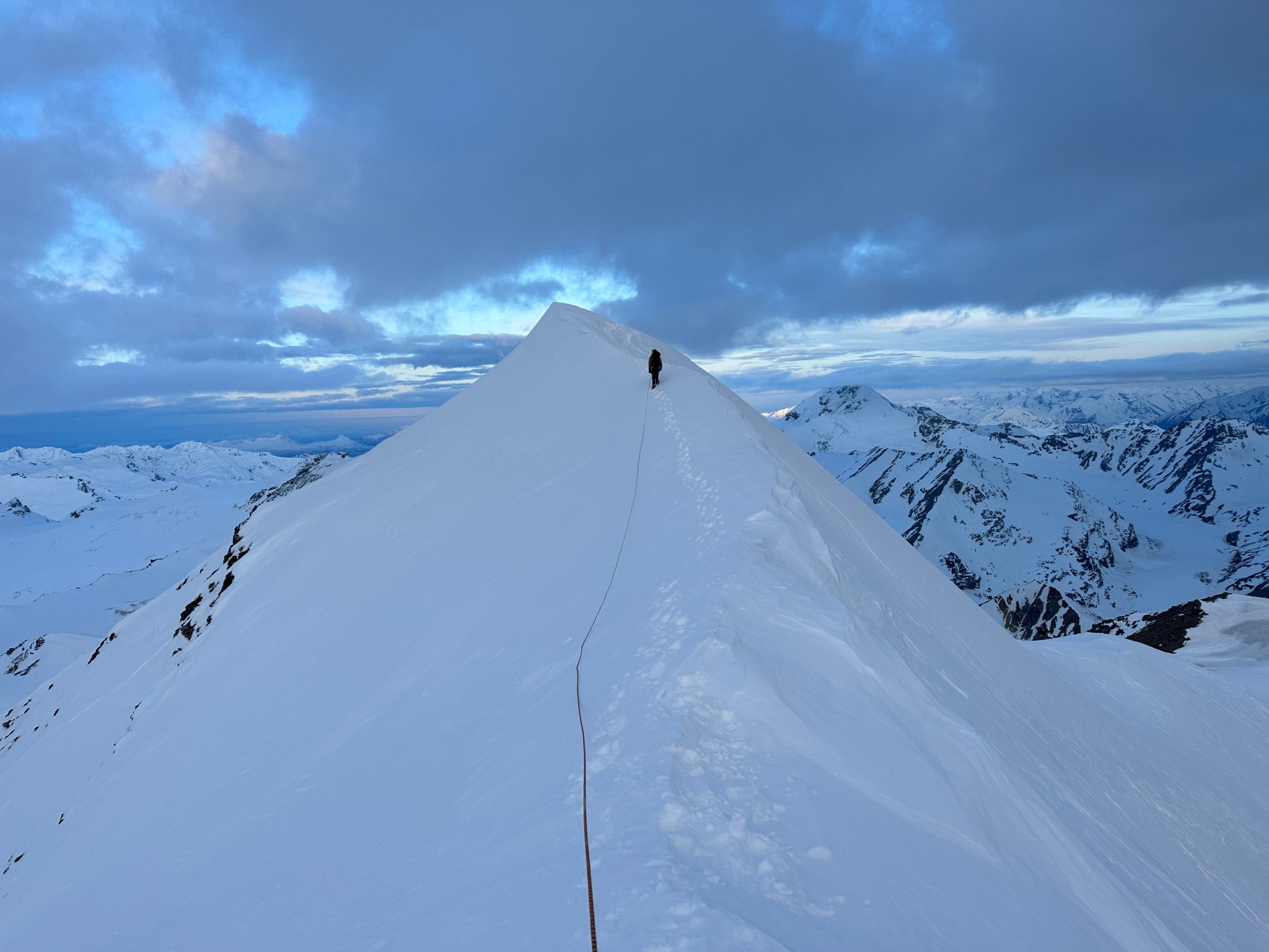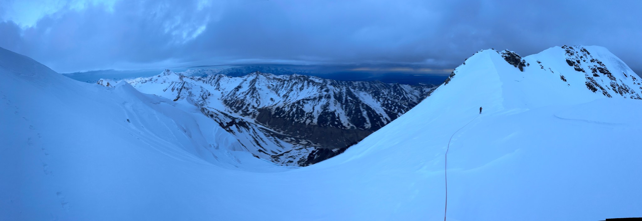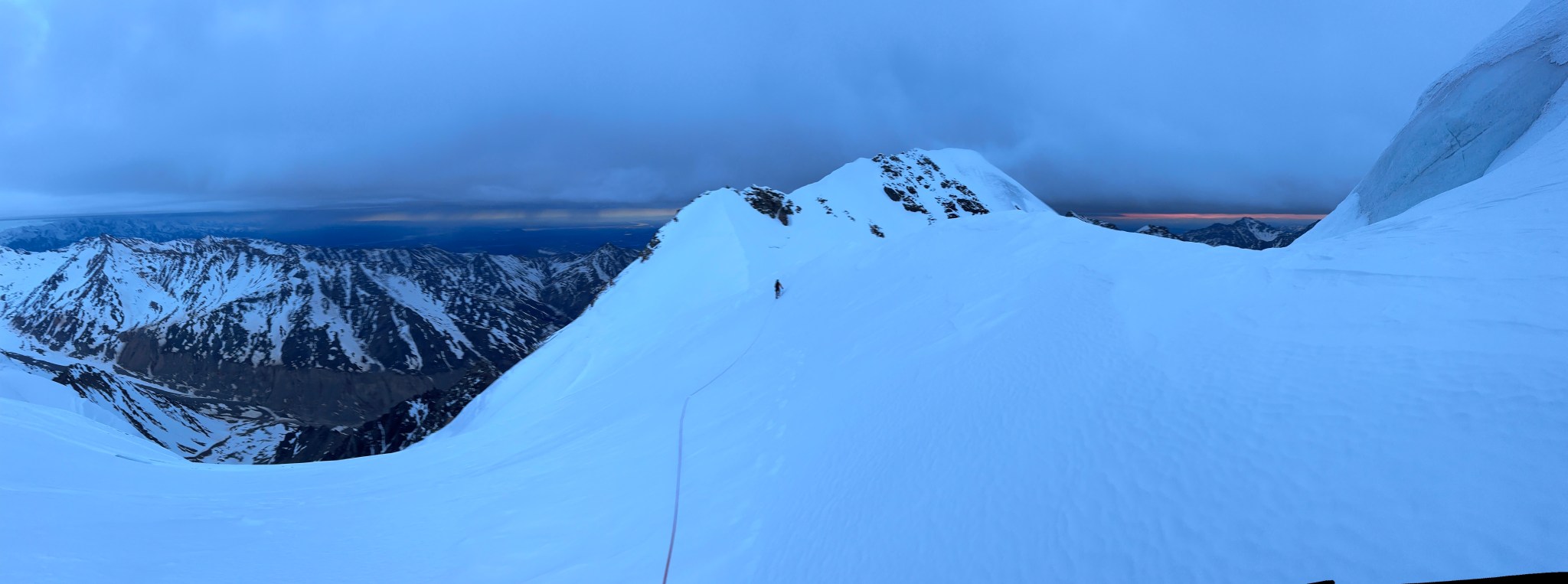The 4000’ drop to the west was less astounding due to the distracting number of large crevasses directly below us; it wasn’t quite an icefall, but traveling straight up or down the bowl would require a lot of traversing back and forth to avoid a crevasse fall. And of course there was a massive ice-cliff at the bottom of the hanging glacier. Thankfully we were able to avoid all visible crevasses by traversing high and skirting the rim of the glacier bowl, eventually gaining the mellow ridge between the lower summit and the summit ridge proper. Quinn pulled in rope as I joined him at the start of the summit ridge, a bit confused as to what I was looking at. I asked if this was the route and he said “yes, but it’s time to go down”. The ulu blade of a summit was being consumed by clouds, and increasingly so.