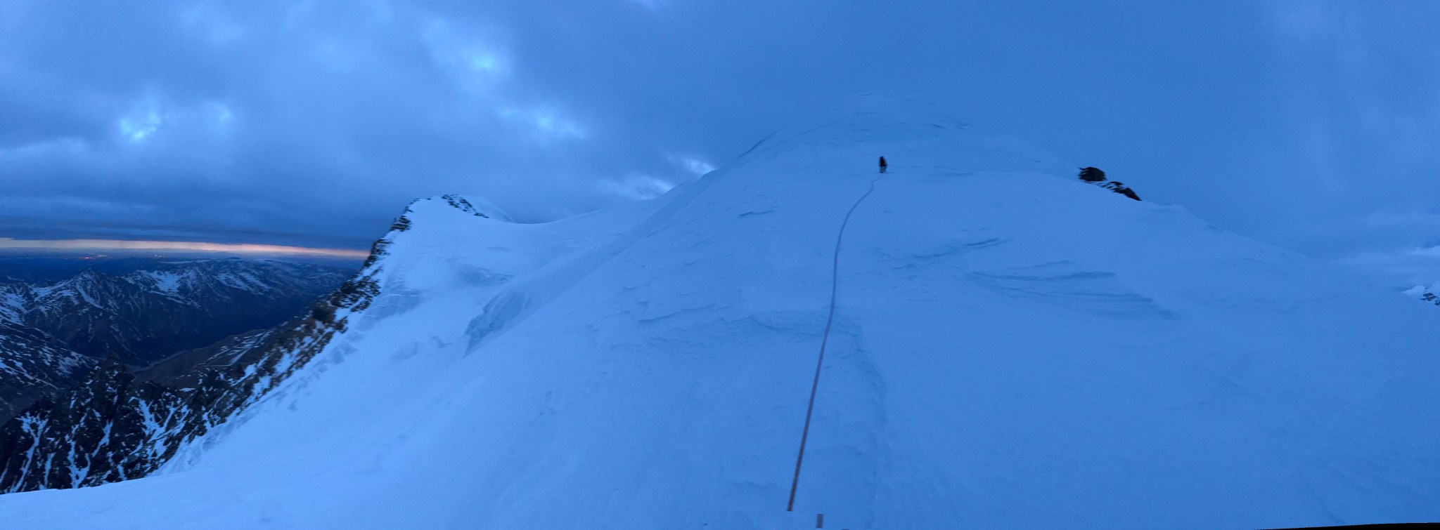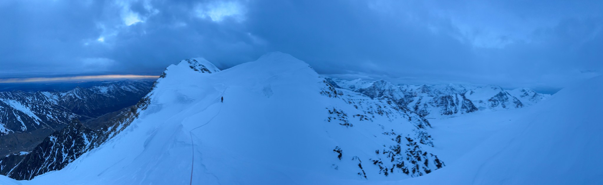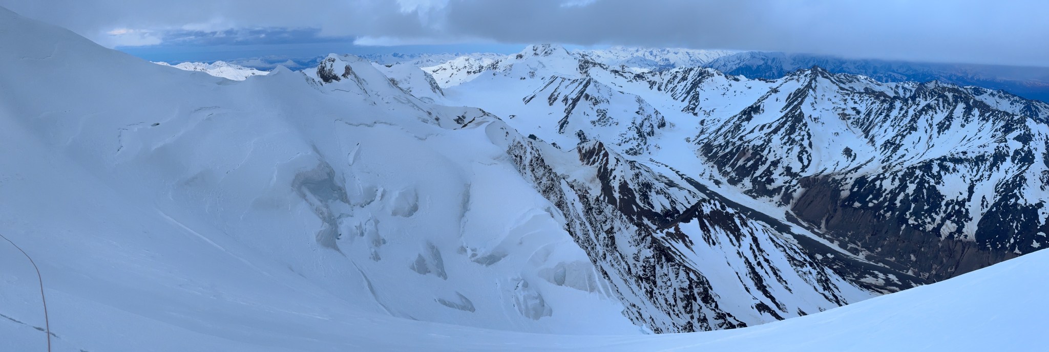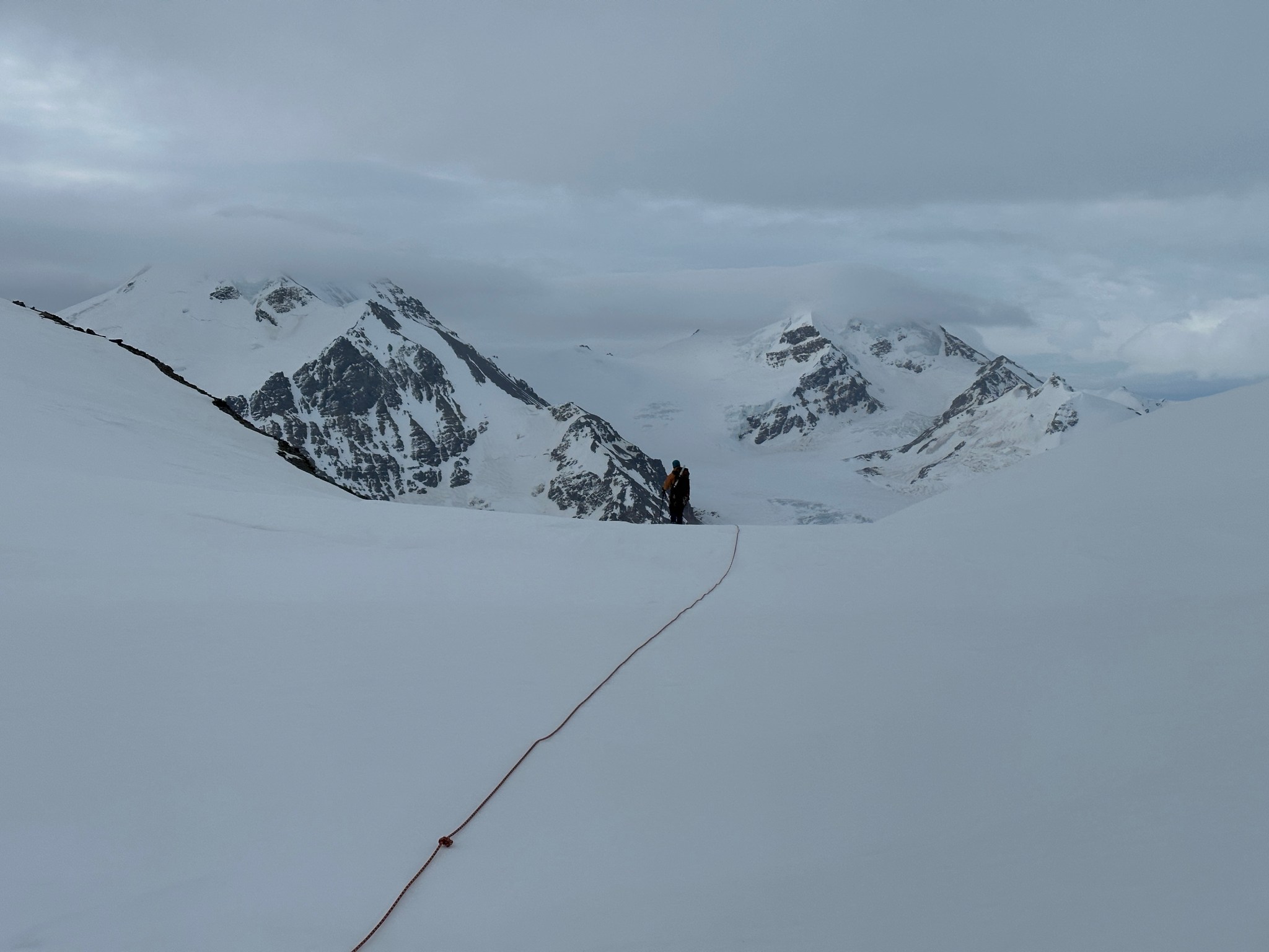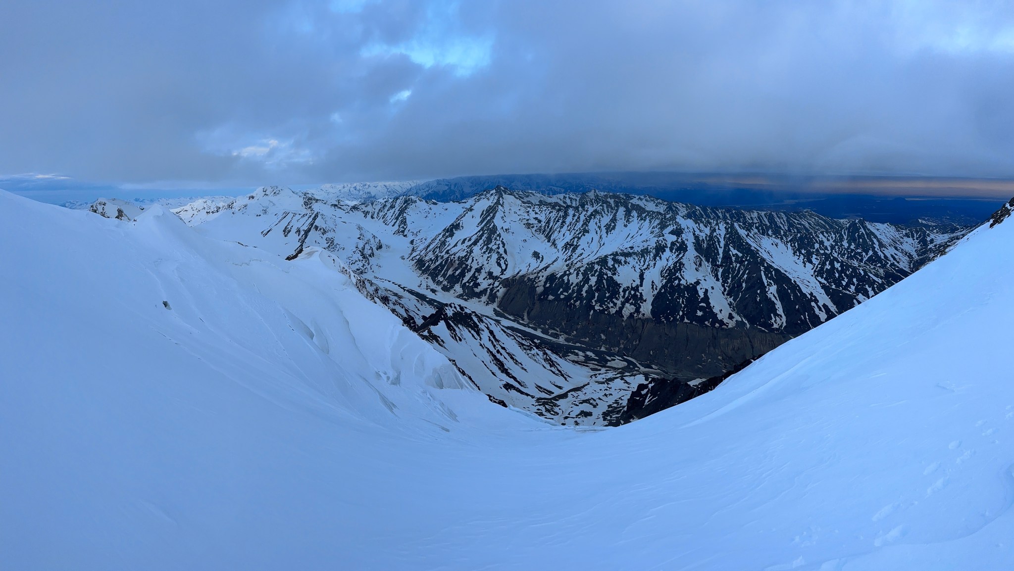 The 4000’ drop to the west was less astounding due to the distracting number of large crevasses directly below us; it wasn’t quite an icefall, but traveling straight up or down the bowl would require a lot of traversing back and forth to avoid a crevasse fall. And of course there was a massive ice-cliff at the bottom of the hanging glacier. Thankfully we were able to avoid all visible crevasses by traversing high and skirting the rim of the glacier bowl, eventually gaining the mellow ridge between the lower summit and the summit ridge proper. Quinn pulled in rope as I joined him at the start of the summit ridge, a bit confused as to what I was looking at. I asked if this was the route and he said “yes, but it’s time to go down”. The ulu blade of a summit was being consumed by clouds, and increasingly so.