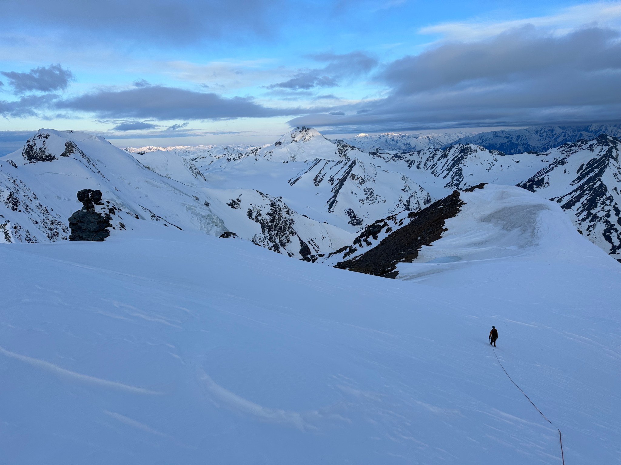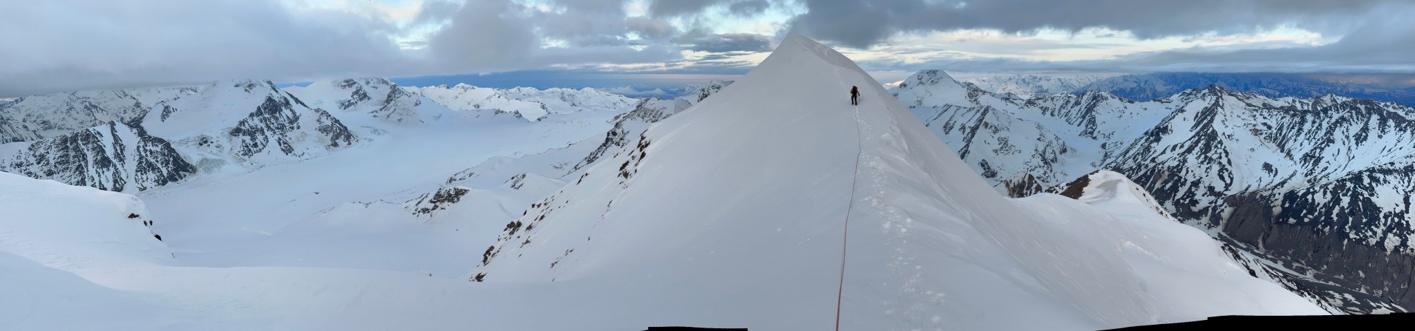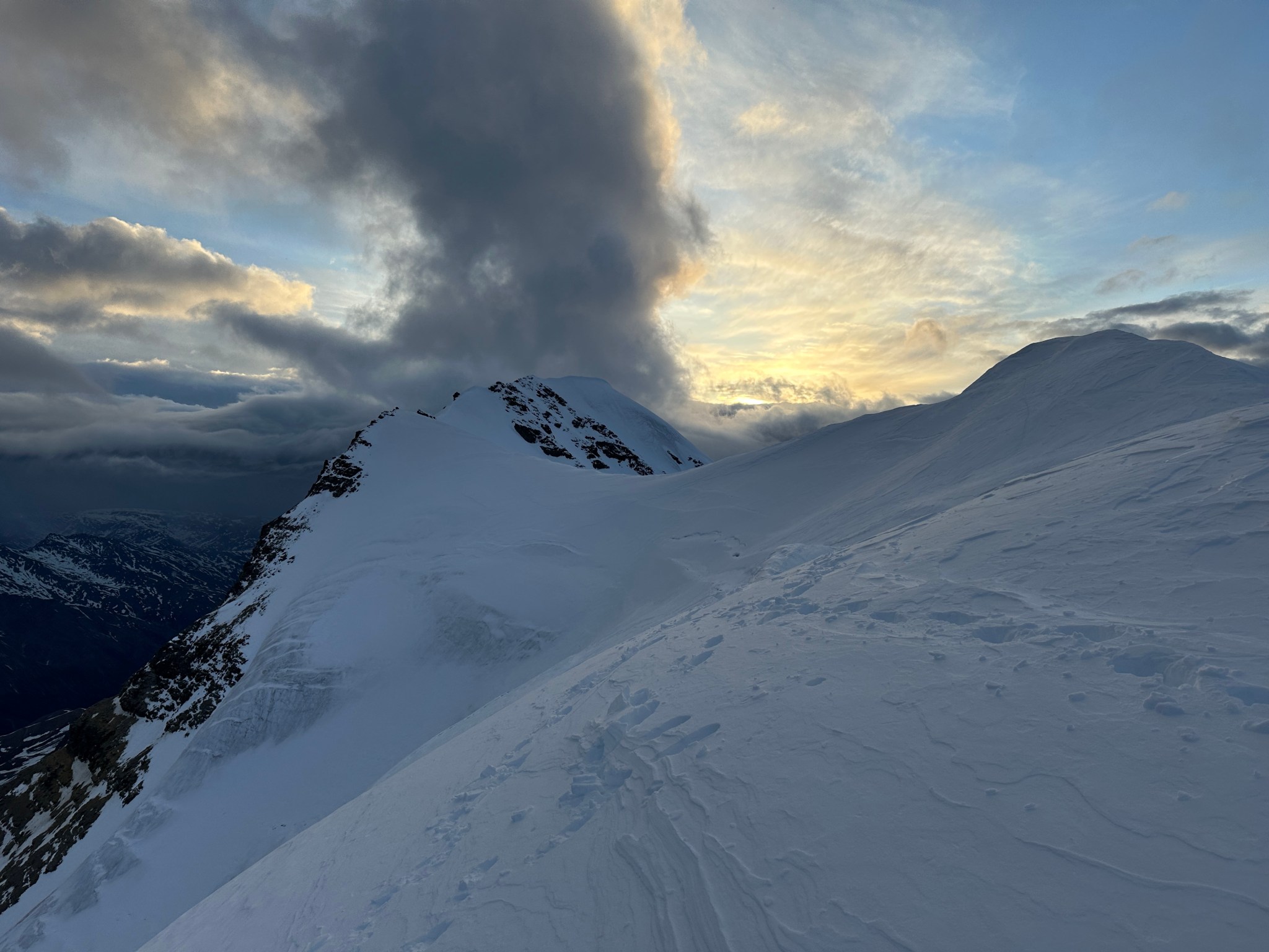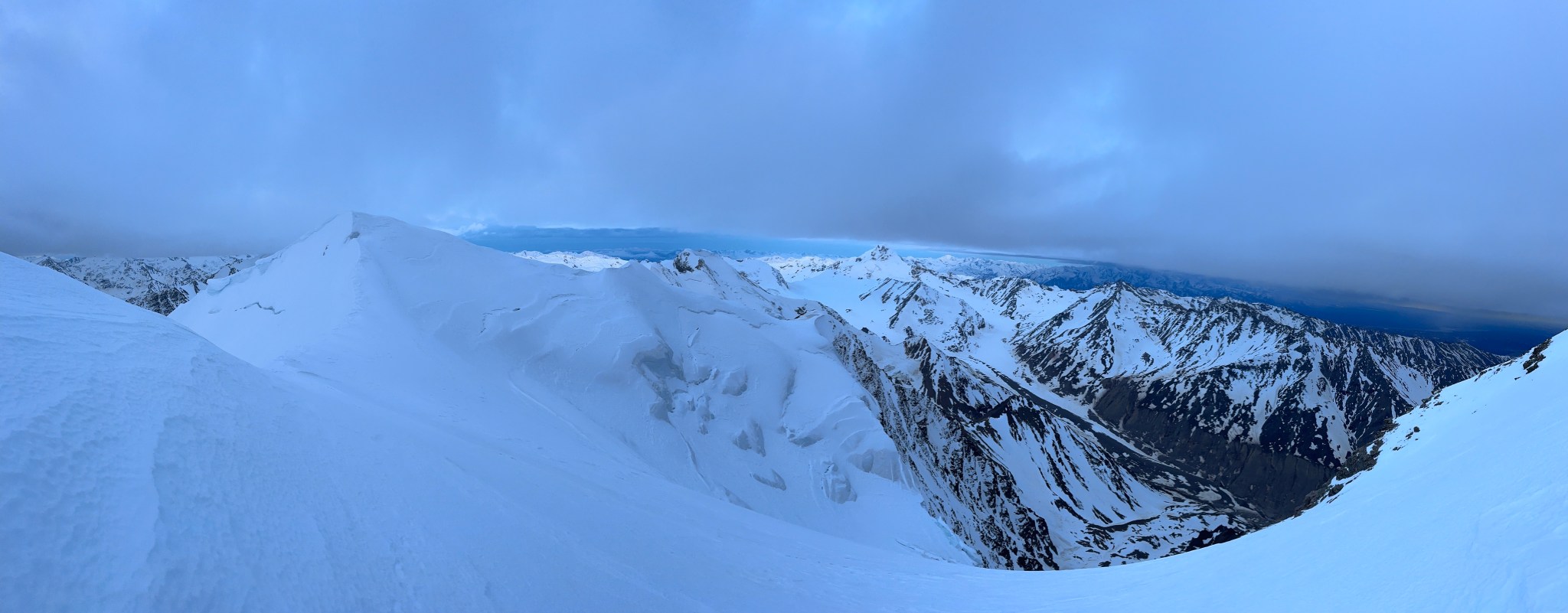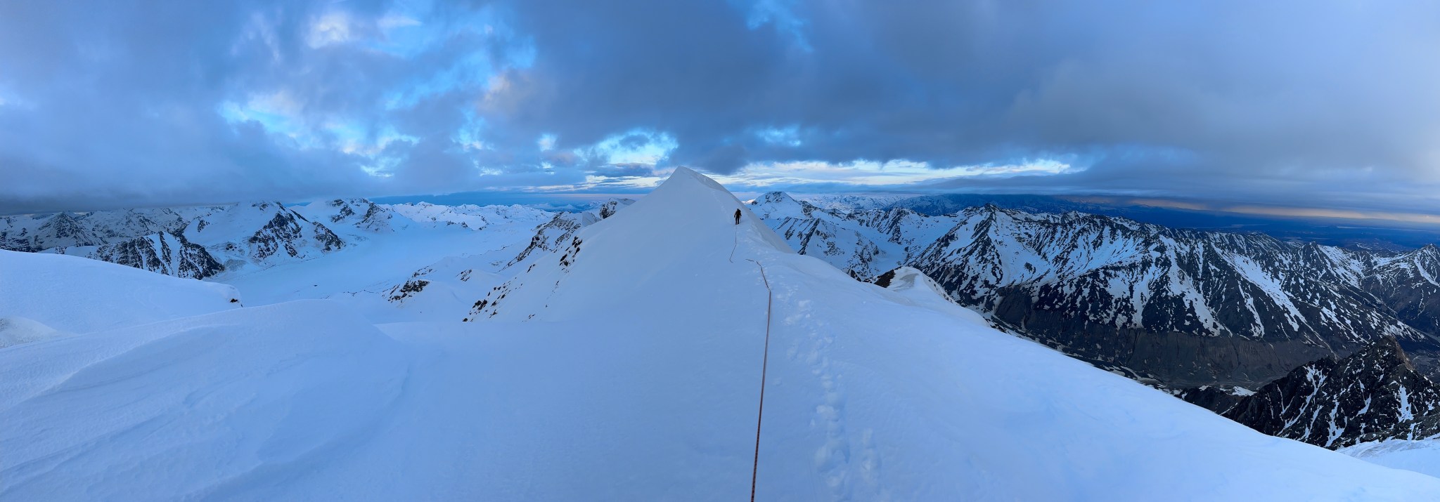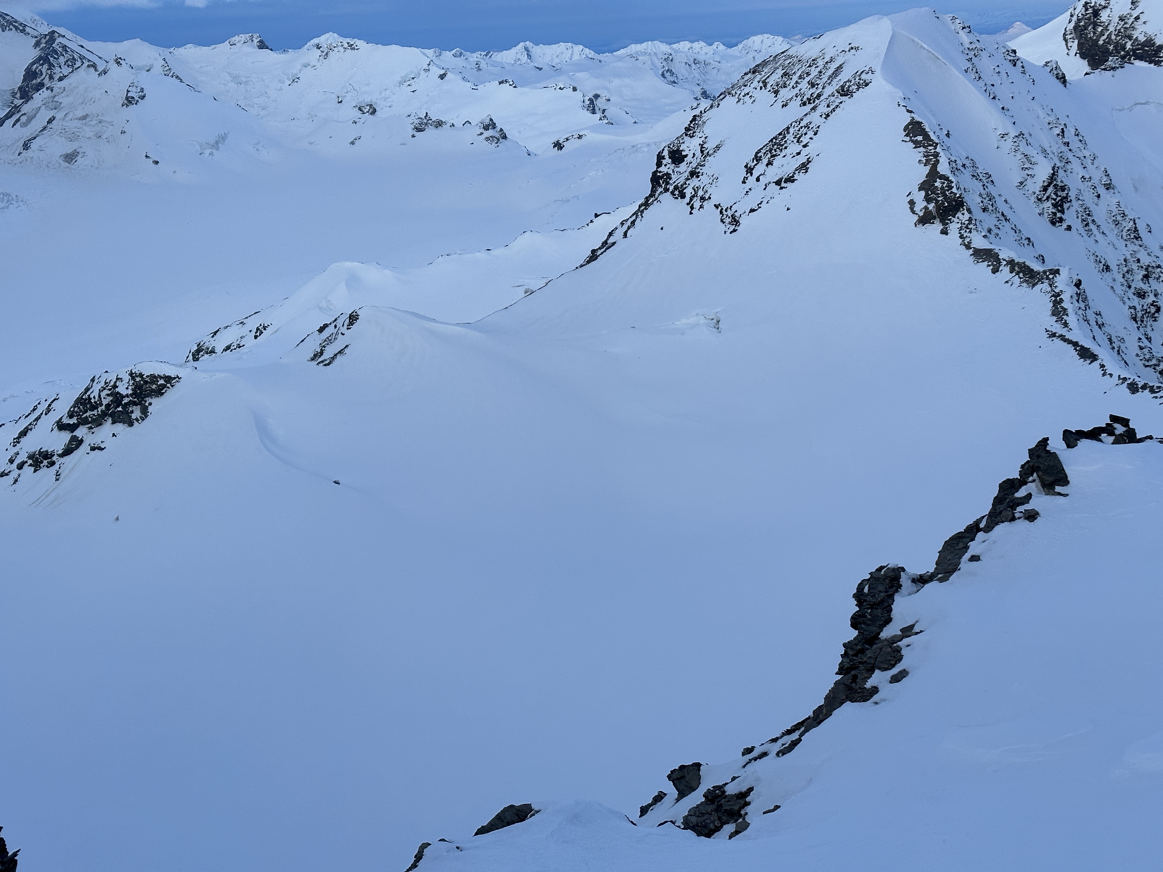 The 4000’ drop to the west was less astounding due to the distracting number of large crevasses directly below us; it wasn’t quite an icefall, but traveling straight up or down the bowl would require a lot of traversing back and forth to avoid a crevasse fall. And of course there was a massive ice-cliff at the bottom of the hanging glacier. Thankfully we were able to avoid all visible crevasses by traversing high and skirting the rim of the glacier bowl, eventually gaining the mellow ridge between the lower summit and the summit ridge proper. Quinn pulled in rope as I joined him at the start of the summit ridge, a bit confused as to what I was looking at. I asked if this was the route and he said “yes, but it’s time to go down”. The ulu blade of a summit was being consumed by clouds, and increasingly so.