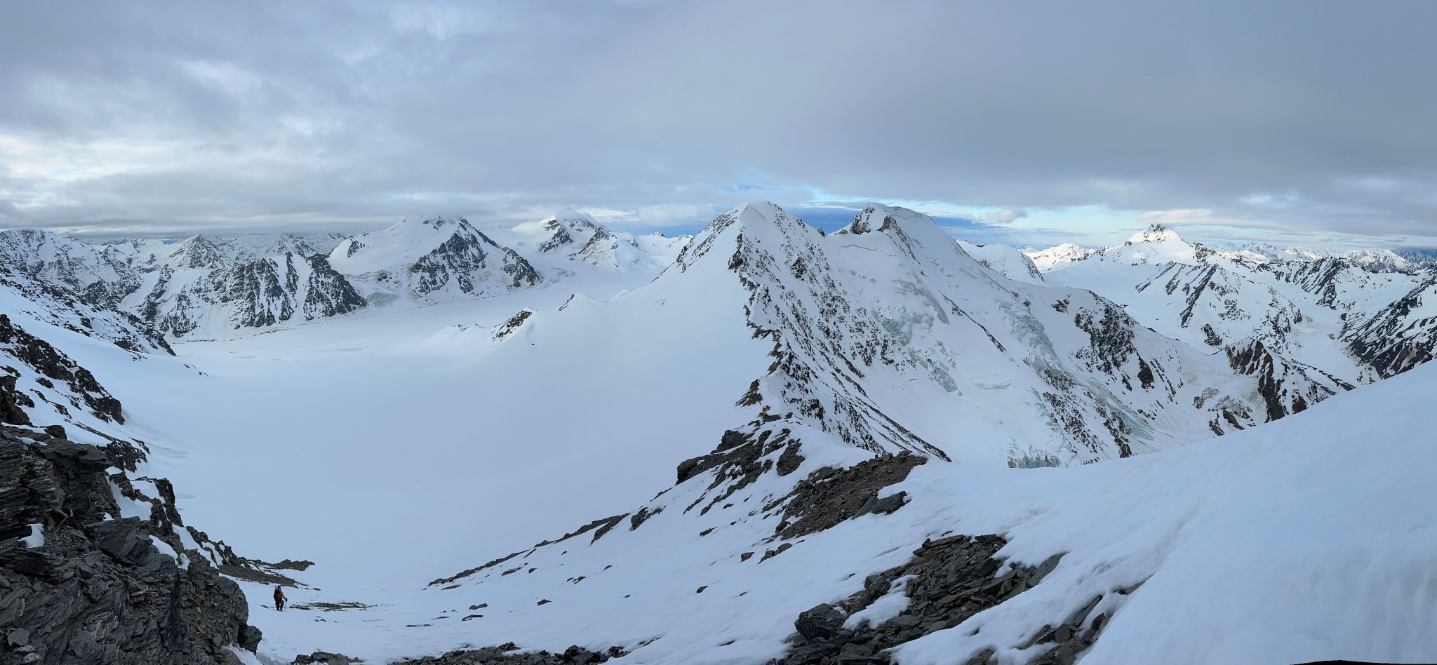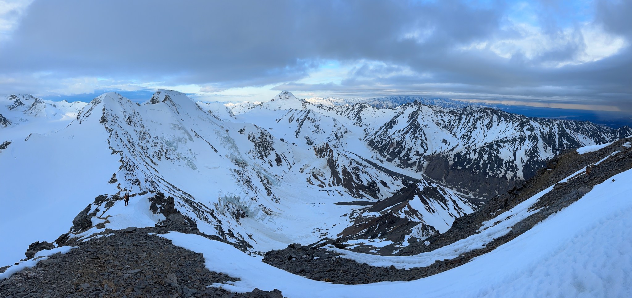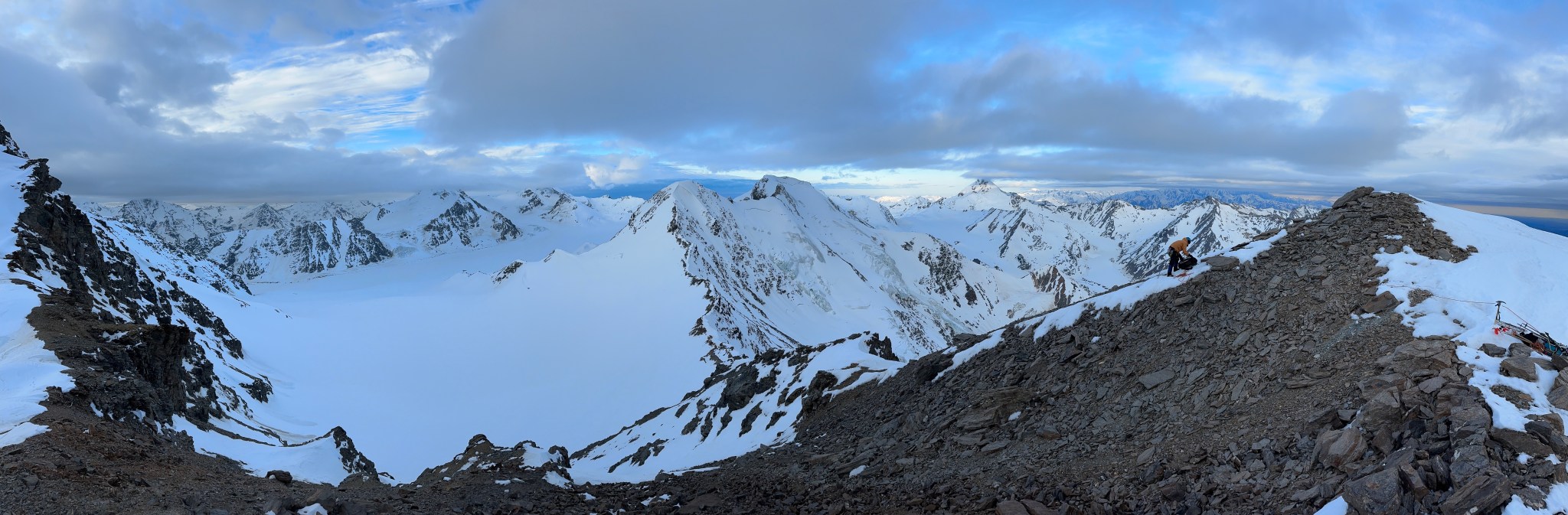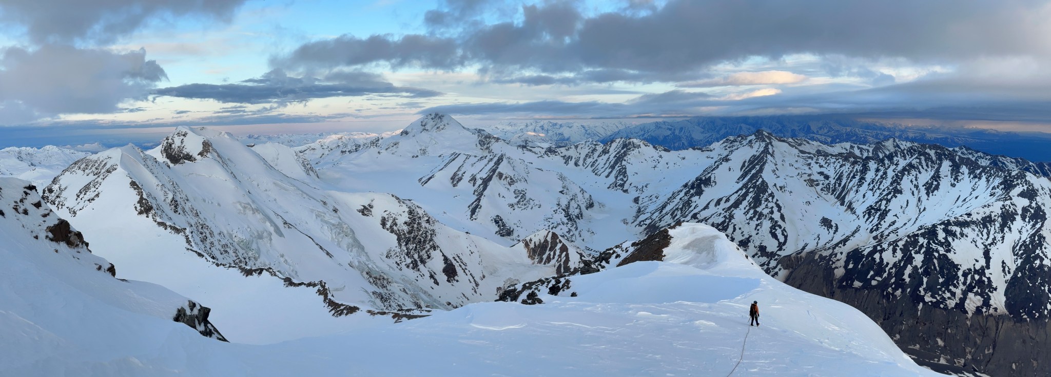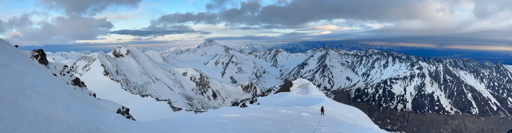 The 4000’ drop to the west was less astounding due to the distracting number of large crevasses directly below us; it wasn’t quite an icefall, but traveling straight up or down the bowl would require a lot of traversing back and forth to avoid a crevasse fall. And of course there was a massive ice-cliff at the bottom of the hanging glacier. Thankfully we were able to avoid all visible crevasses by traversing high and skirting the rim of the glacier bowl, eventually gaining the mellow ridge between the lower summit and the summit ridge proper. Quinn pulled in rope as I joined him at the start of the summit ridge, a bit confused as to what I was looking at. I asked if this was the route and he said “yes, but it’s time to go down”. The ulu blade of a summit was being consumed by clouds, and increasingly so.