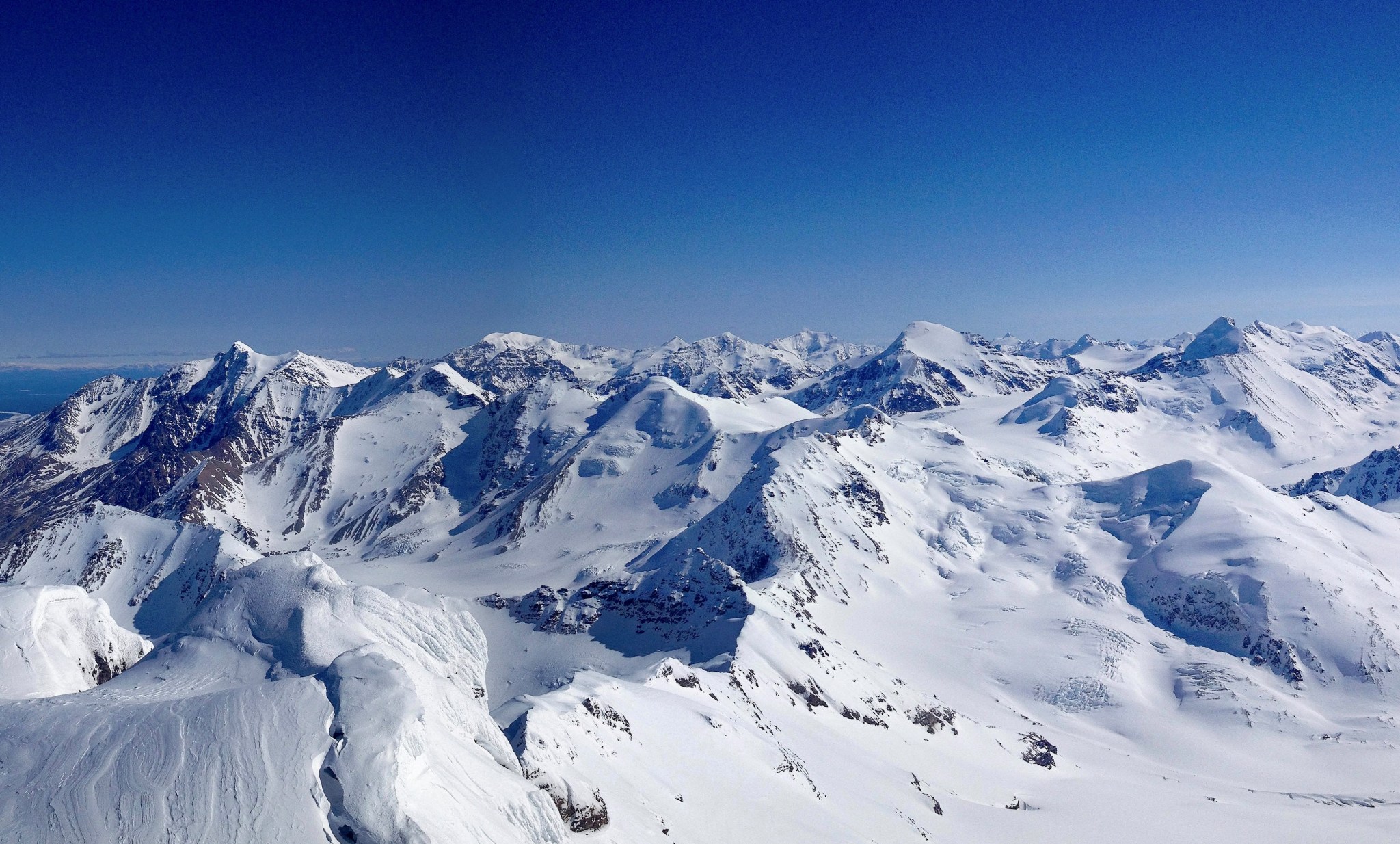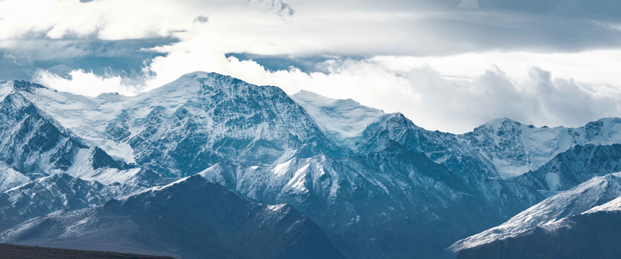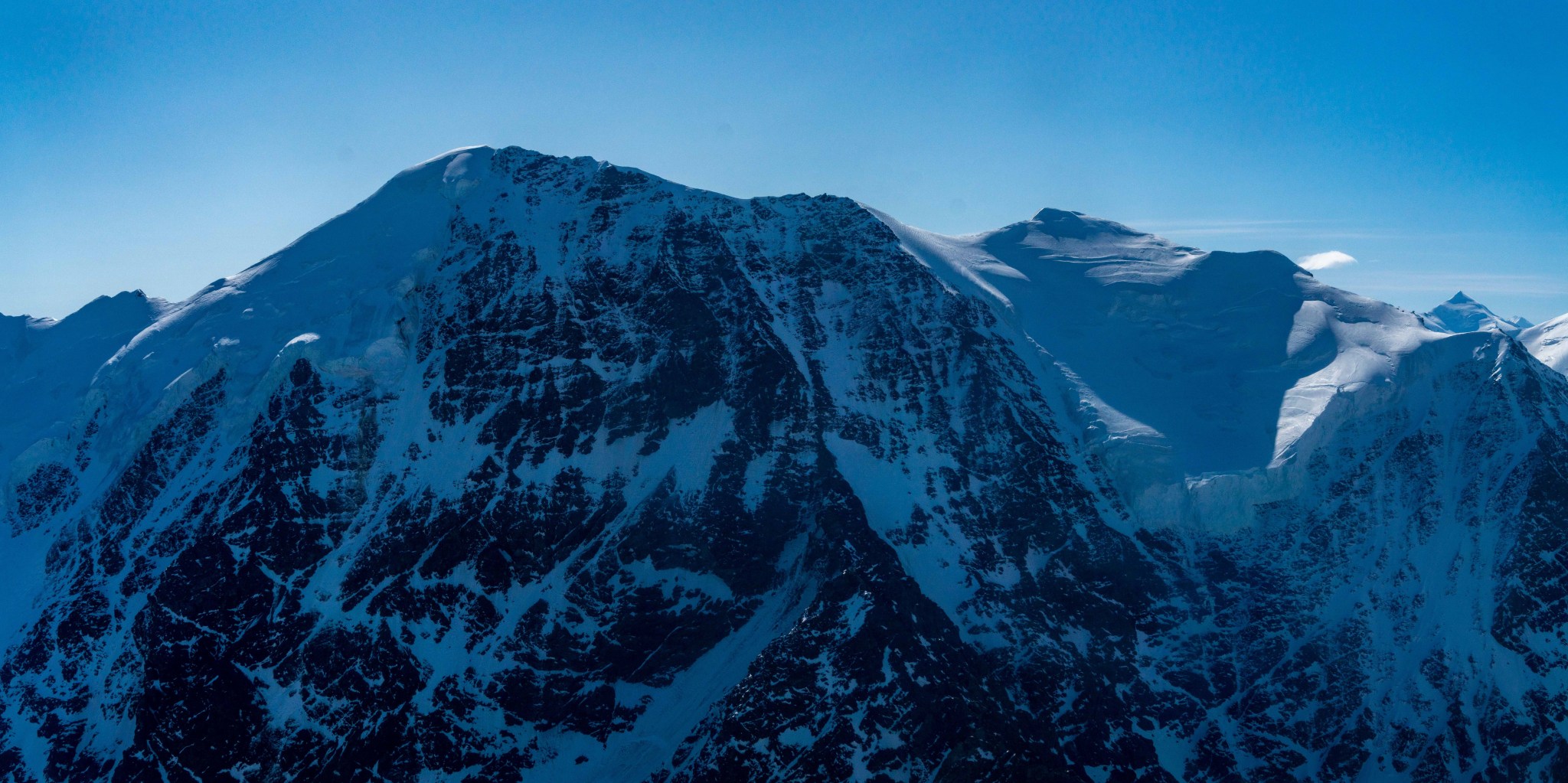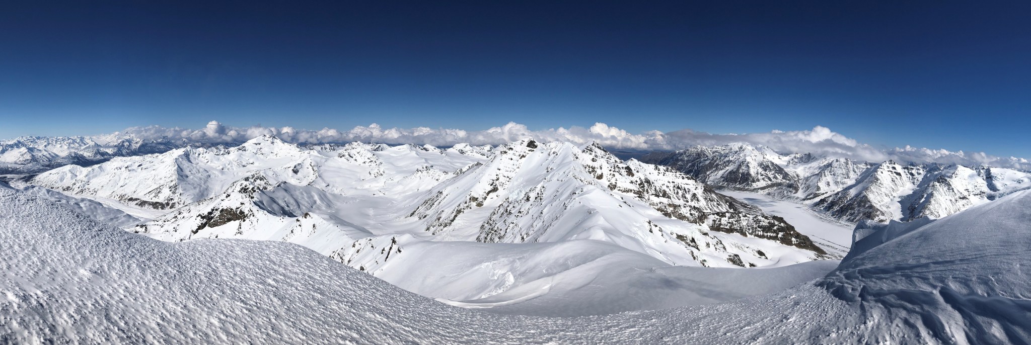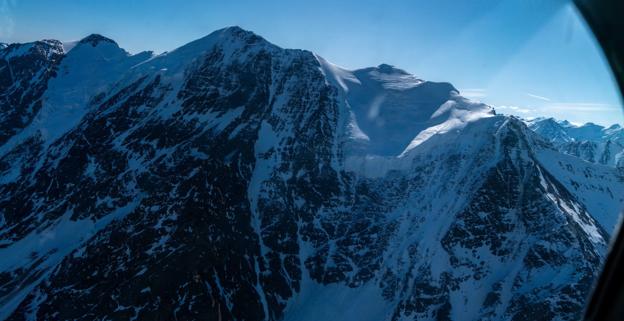The 4000’ drop to the west was less astounding due to the distracting number of large crevasses directly below us; it wasn’t quite an icefall, but traveling straight up or down the bowl would require a lot of traversing back and forth to avoid a crevasse fall. And of course there was a massive ice-cliff at the bottom of the hanging glacier. Thankfully we were able to avoid all visible crevasses by traversing high and skirting the rim of the glacier bowl, eventually gaining the mellow ridge between the lower summit and the summit ridge proper. Quinn pulled in rope as I joined him at the start of the summit ridge, a bit confused as to what I was looking at. I asked if this was the route and he said “yes, but it’s time to go down”. The ulu blade of a summit was being consumed by clouds, and increasingly so.