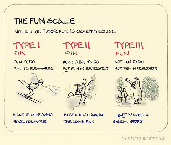 Fear not, fellow climbers, I’m still interested in trip invitations, and if my friends want to go out I’m game. But I don’t want to be the initiator anymore. I would love to climb Silvertip again or ski Item Peak, as the views are amazing, the climbing is easy, and the ski out is truly Type 1 fun. Despite these bright points in my memory, most of my experience of climbing these days is more commonly Type 2/3 fun.