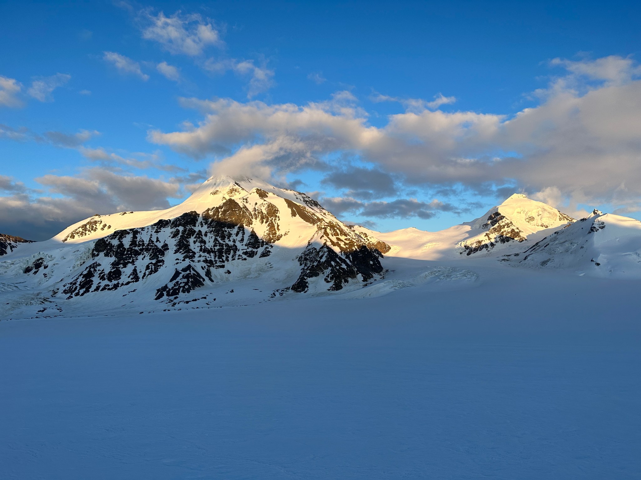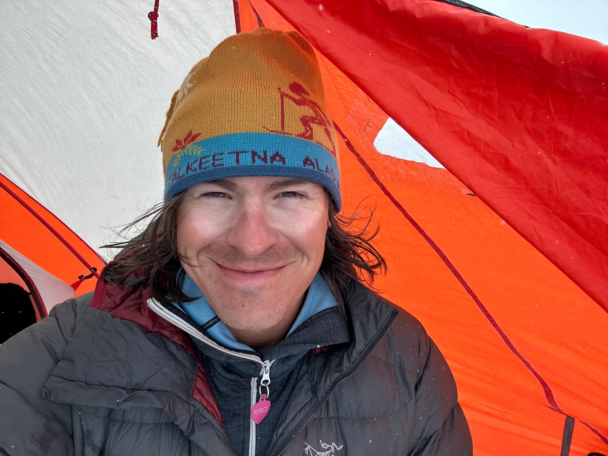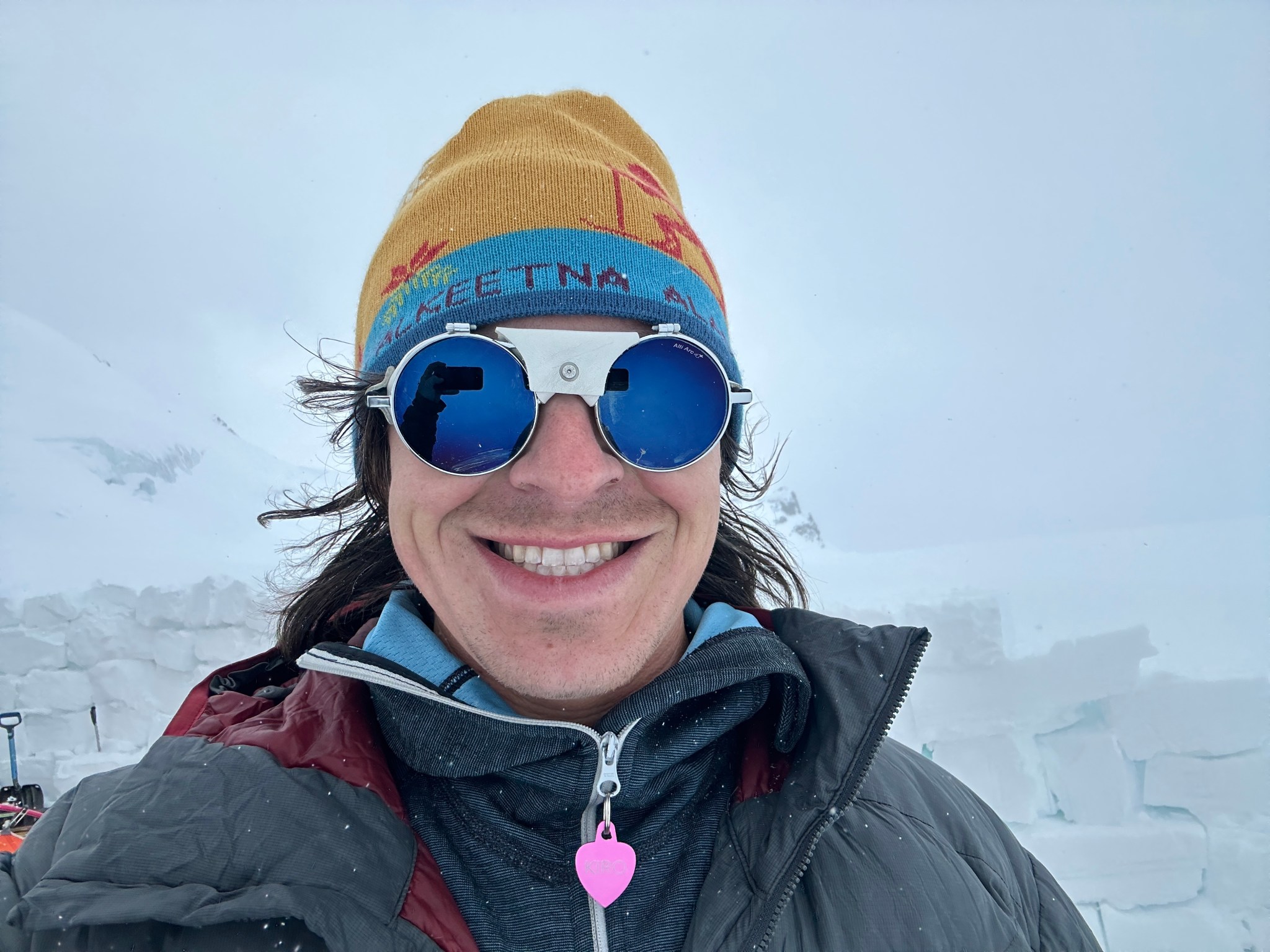 We slept, laid, and sat around the tent all day Sunday and Monday, I had enough time to write two trip reports (hello!). A few snowstorms hit our camp from the north on Sunday and we weathered them well 4ish inches of snow accumulated on the glacier, all light fluffy powder. I purposely didn’t wall in the tent entirely so some of the snow could blow downglacier when the winds inevitably picked back up. Sure enough, on Monday there was a southern series of windstorms, probably gusts up to 30 mph. Hard to tell when you’re safely tucked behind snow walls! There were periods of bluebird sky, followed by whiteout conditions. This oscillation continued all day. We contacted Jessie and planned to chat in the morning about a pickup. Before going to bed, I exhumed the snow anchors around the tent while the snow was still soft. They had formed into 20-30 pound blocks of snow with little parachutes connected to the tent that serve as anchors. Crushing a ball of ice is one thing, but sawing out a rock-hard anchor would be more work, so I’m glad I thought of this pre-bed task.