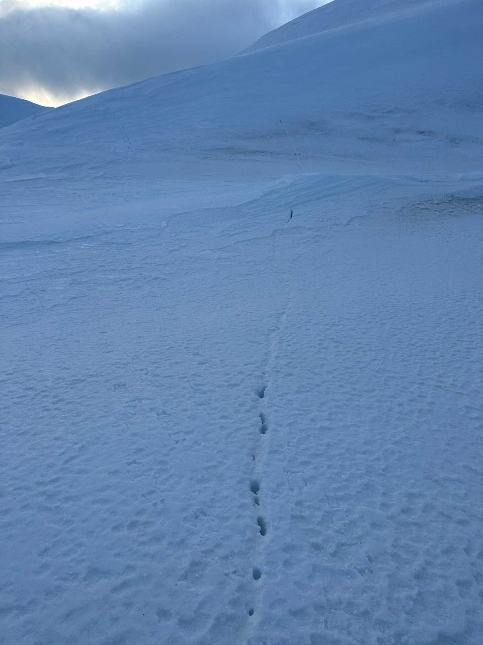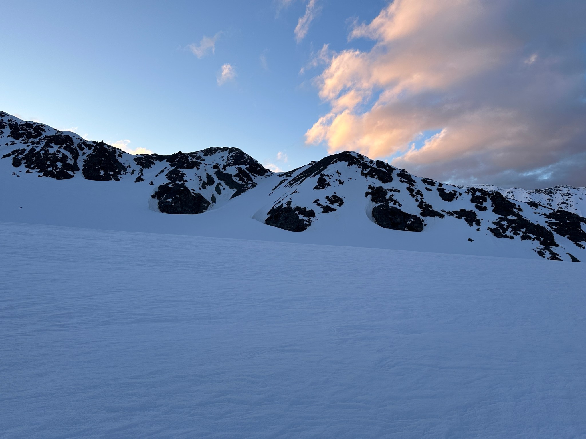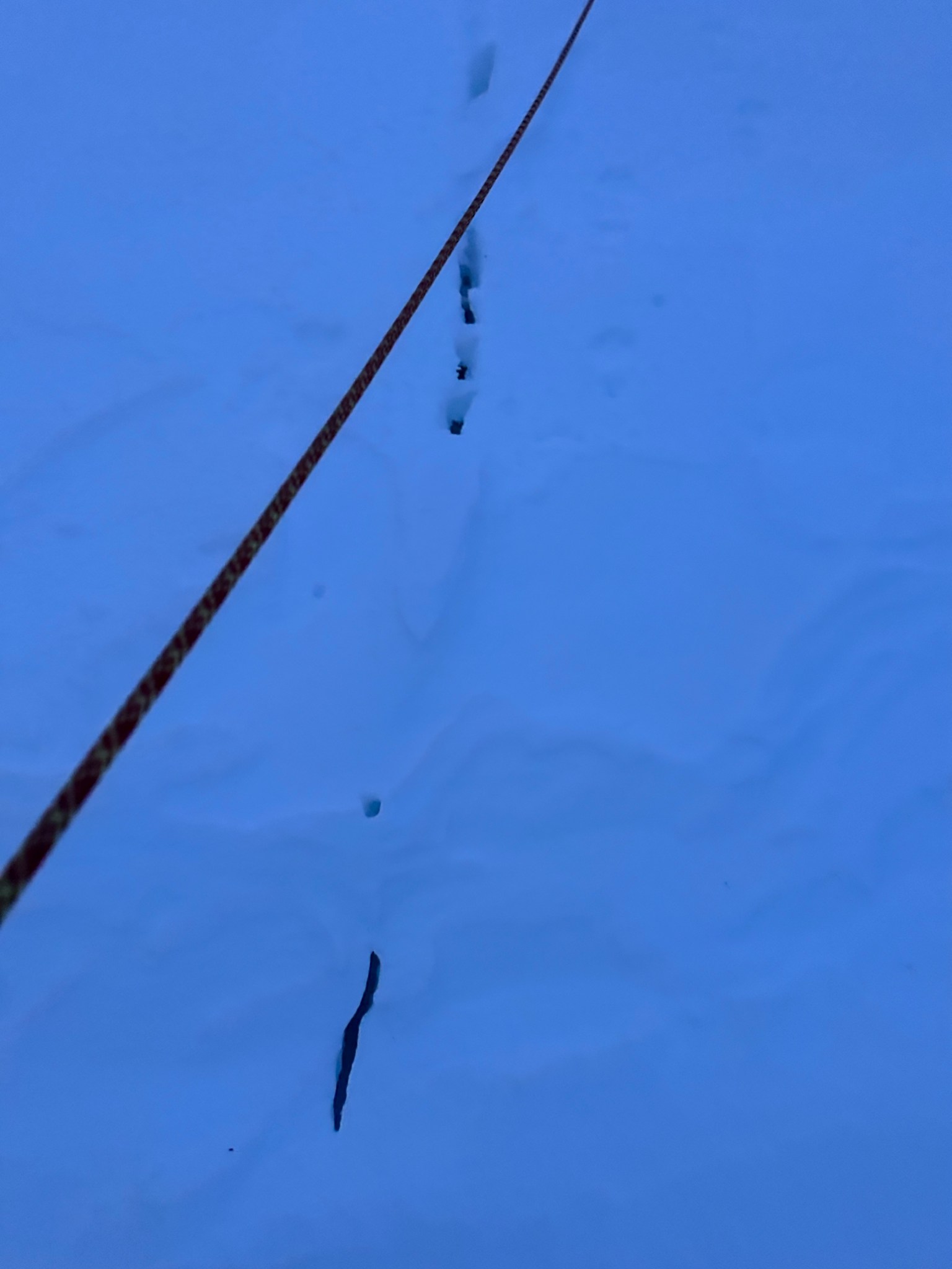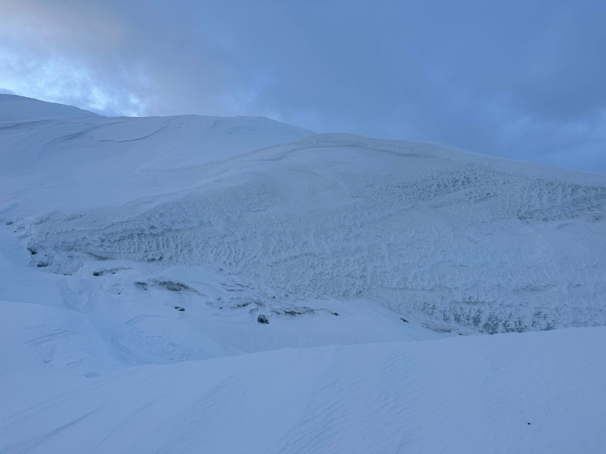 I lead out across the pass, for a while on top of solid windsuncrust. Eventually I reached a section where the 3”-4” of crust would not support my weight. Each step barely held until fully weighted, then shattered, plunging my legs into deep faceted snow up to my knees and hips. My hips were doing fairly well since surgery over a year ago (the recovery is long), but the amount of force my hips were absorbing started to worry me. This experience took on another dimension in my mind with the bergshrund haunting my memory. Every step caused anxiety spikes, wondering if this step was the one to sink me into inky blackness. How about that one? And the next?
