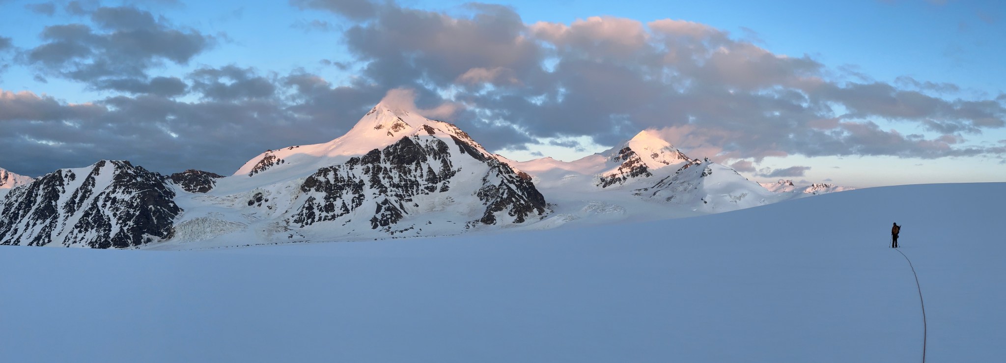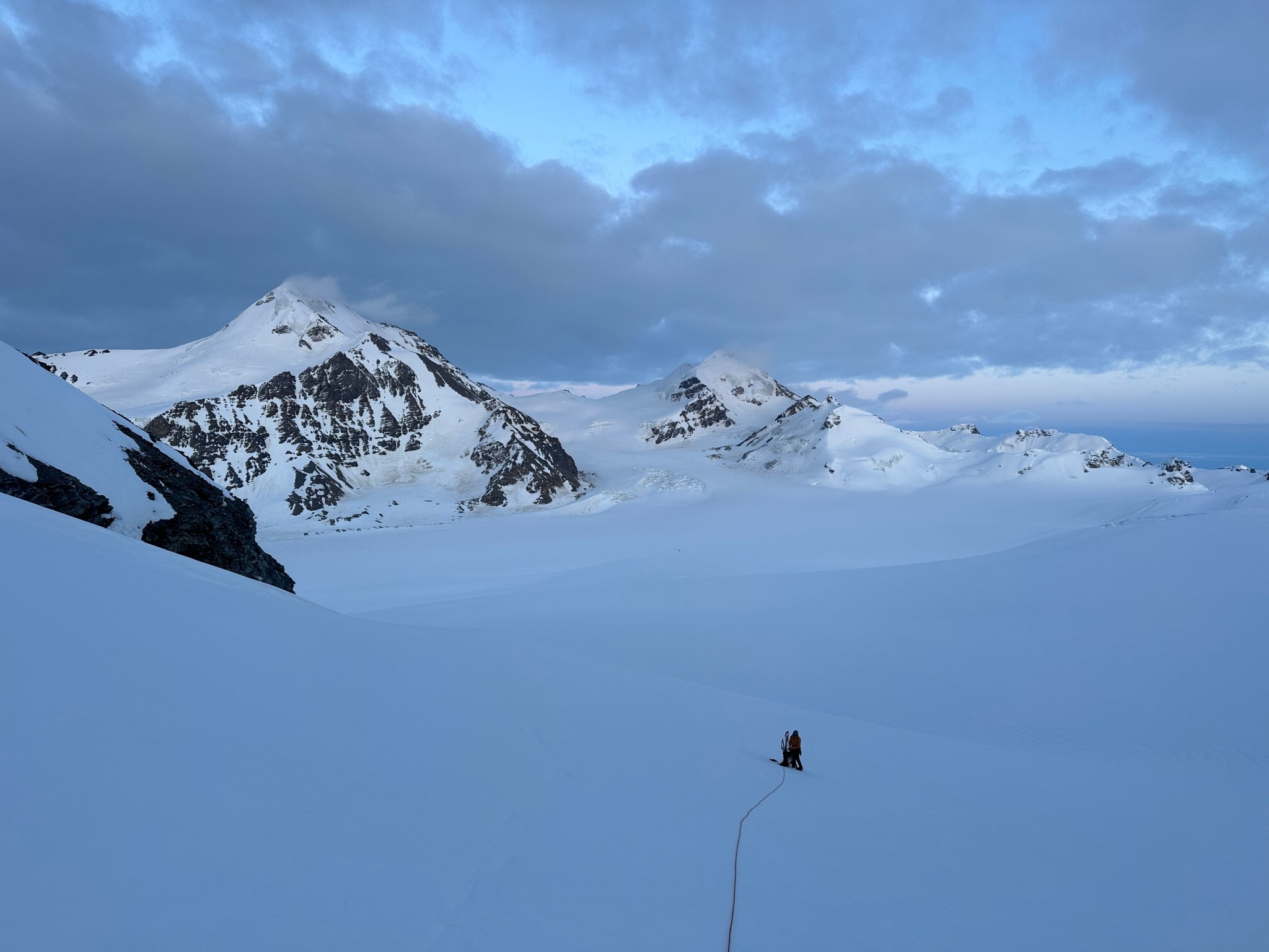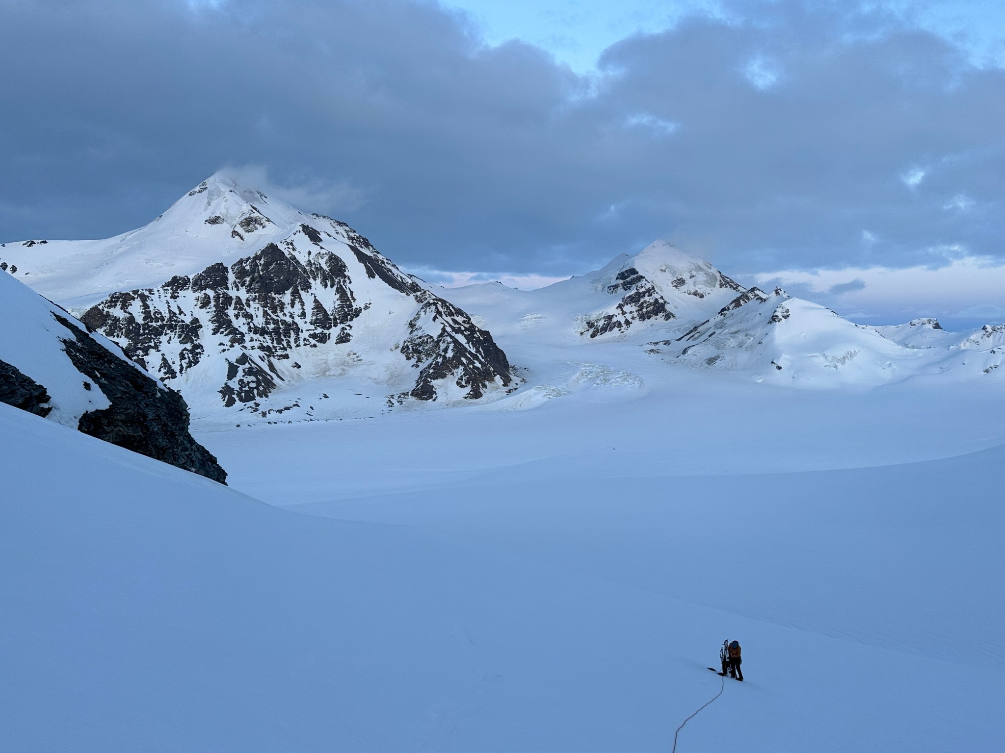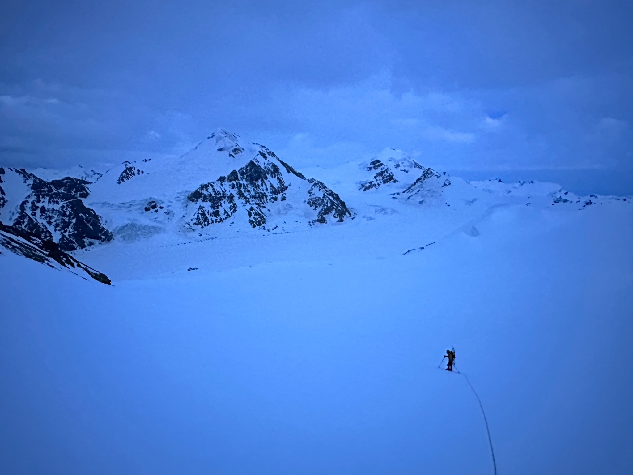 With a route plan in mind, we traveled over two cols to gain and maintain elevation as we skied the roughly 3.5 miles to the ridge. Starting the ski at night was weird for me, there is comfort in daylight that cannot be fully-appreciated until one embarks on a sunset journey into deepening darkness. “Darkness” is relative, as it is summer in Alaska, but the looming clouds cast an ominous shadow over the icefield even with “endless daylight”.