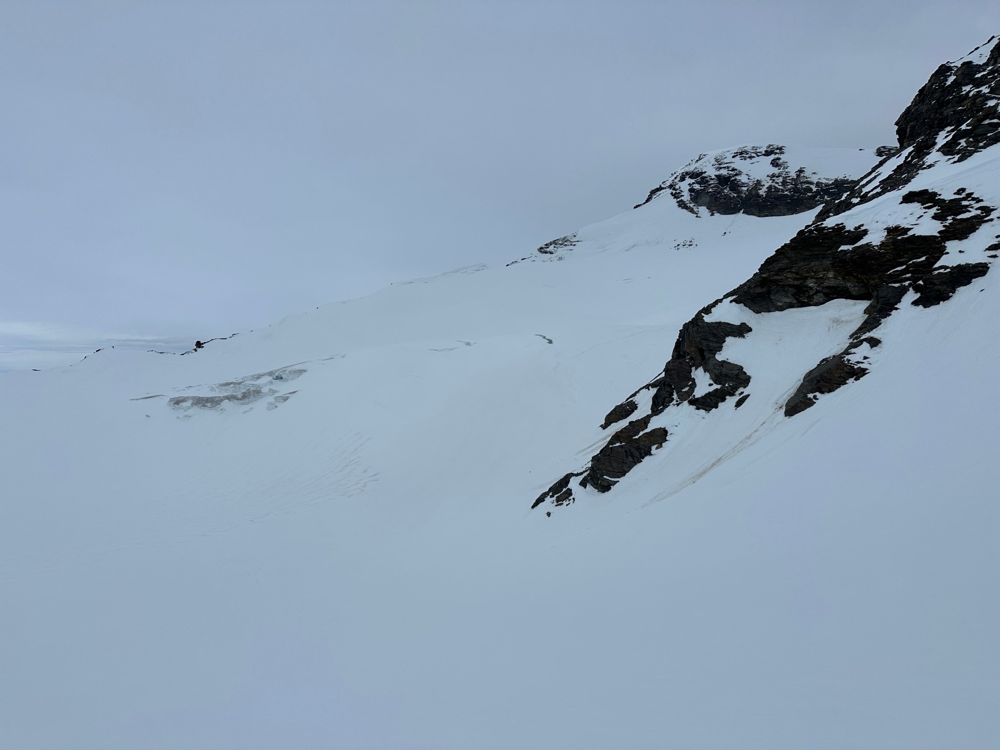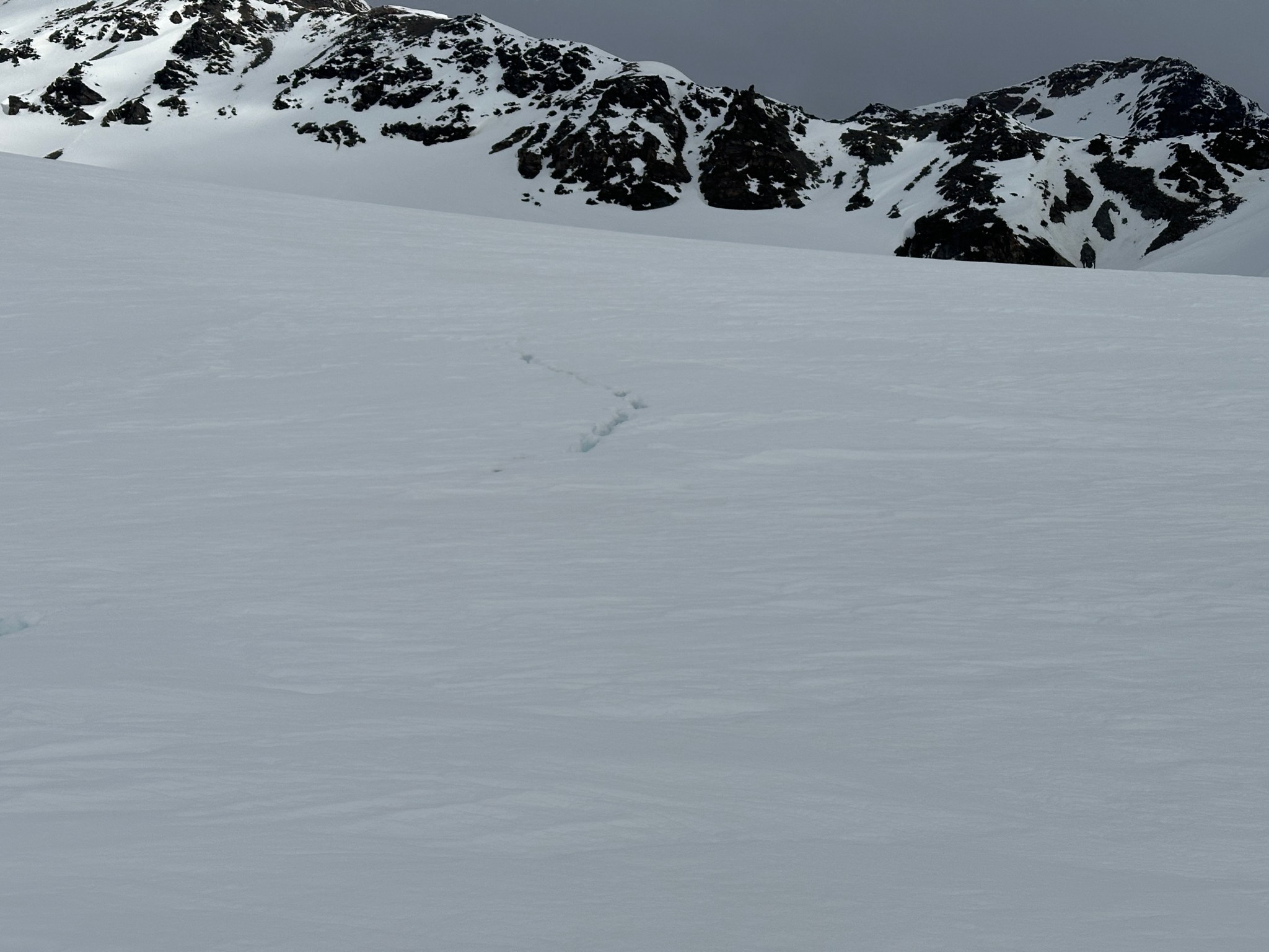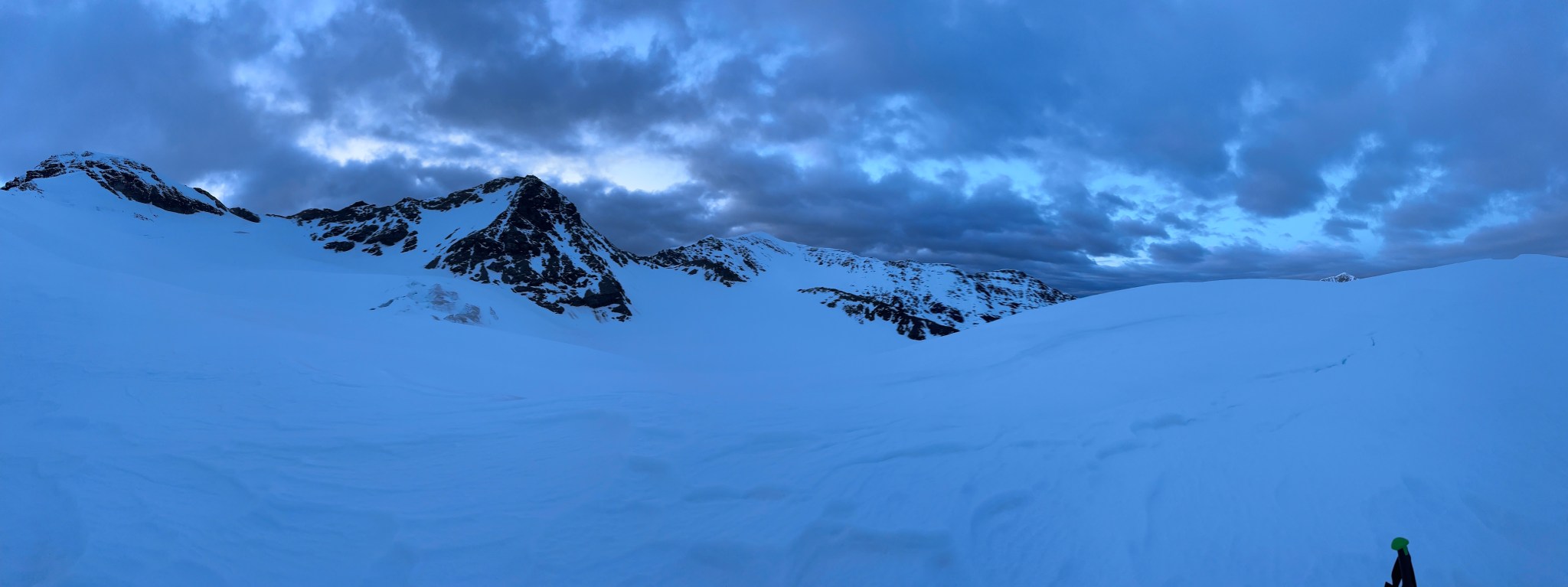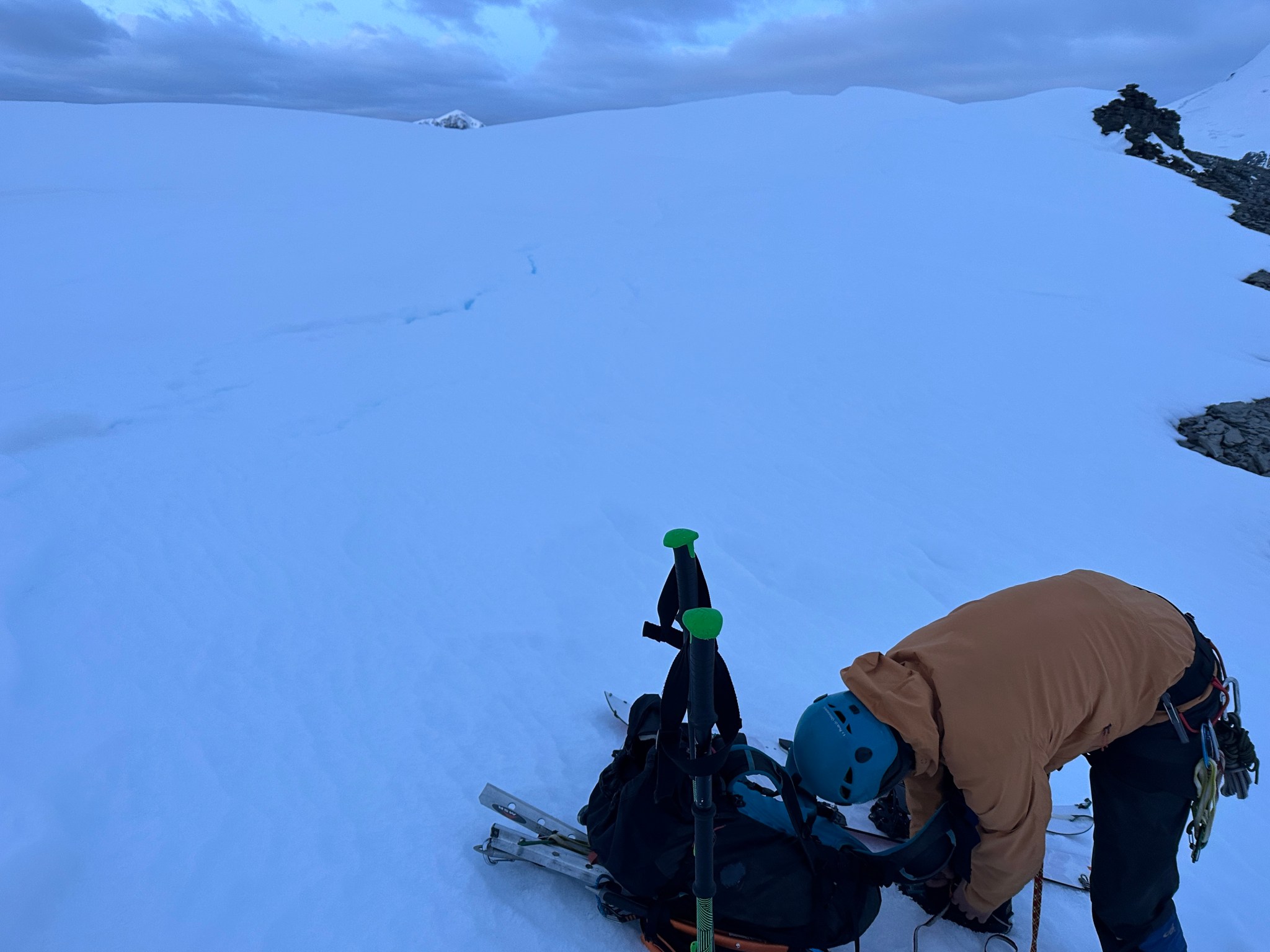 Thinking fast, I planted a wand right below the pass, then backtracked and grabbed many rocks as I could carry and began to toss them off the top of the pass down towards where I assumed there would be a valley. Sure enough, the rocks landed on a surface that suddenly seemed much less-steep than in the dim flat light. I skied to my rocks, picked up most of them, and restarted the rock-throwing process. We were able to continue in this manner all the way across the glacier until we found the next snow incline to climb. I left my rocks behind in case we needed them on the way back.