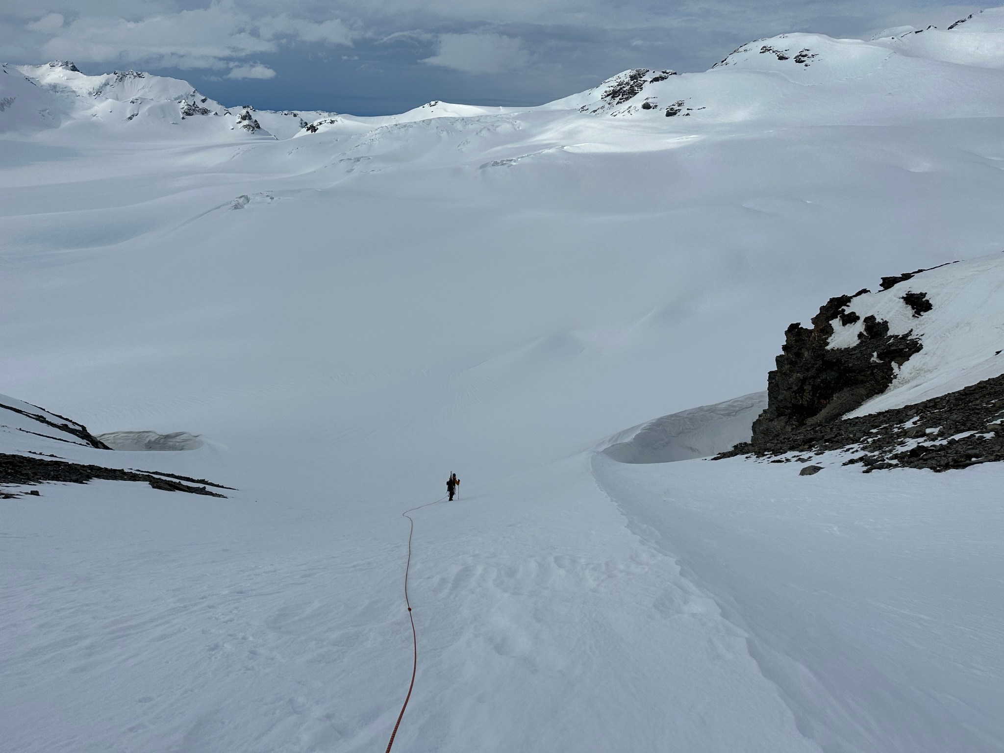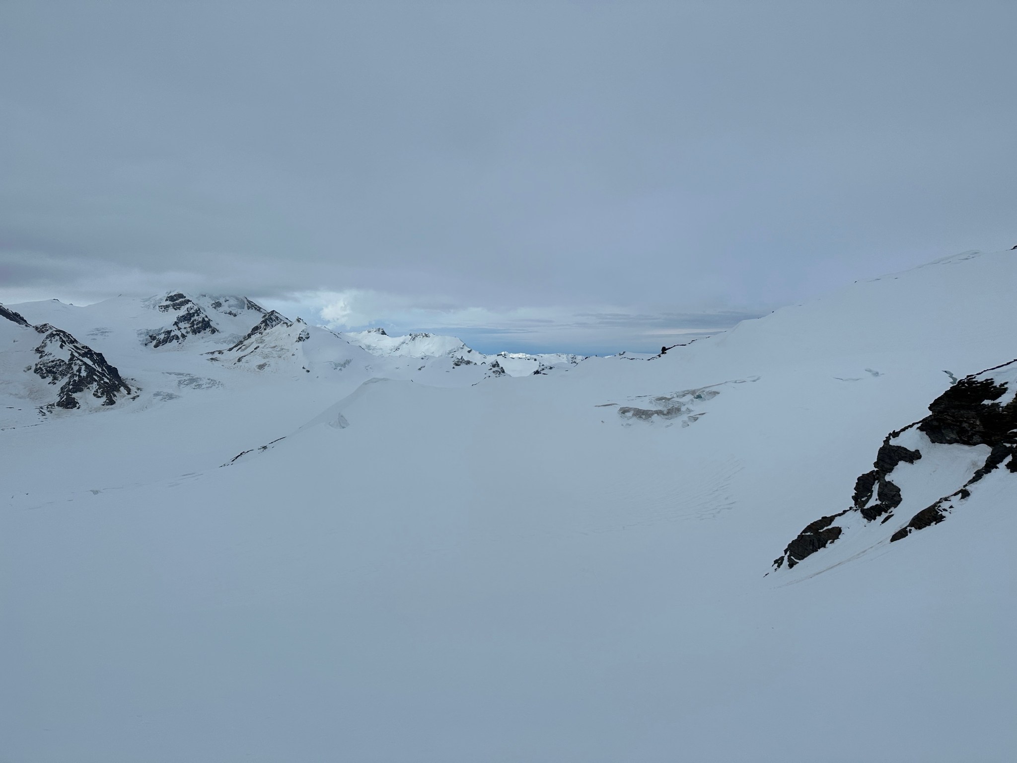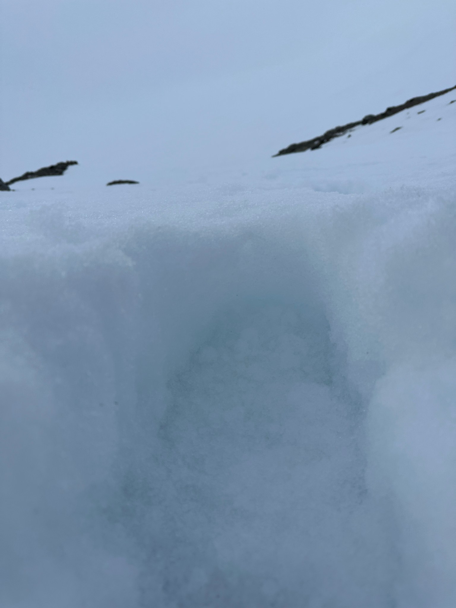 Thinking fast, I planted a wand right below the pass, then backtracked and grabbed many rocks as I could carry and began to toss them off the top of the pass down towards where I assumed there would be a valley. Sure enough, the rocks landed on a surface that suddenly seemed much less-steep than in the dim flat light. I skied to my rocks, picked up most of them, and restarted the rock-throwing process. We were able to continue in this manner all the way across the glacier until we found the next snow incline to climb. I left my rocks behind in case we needed them on the way back.