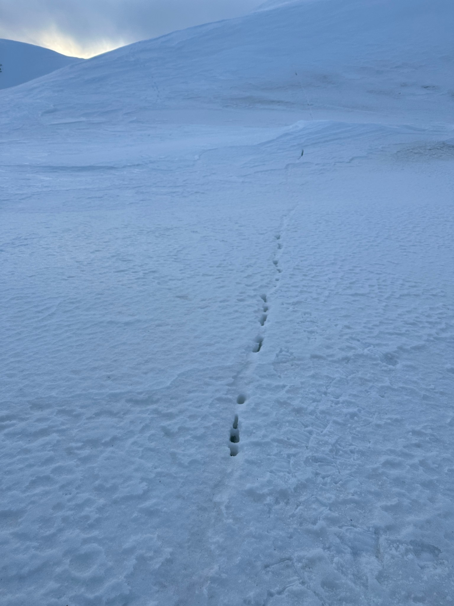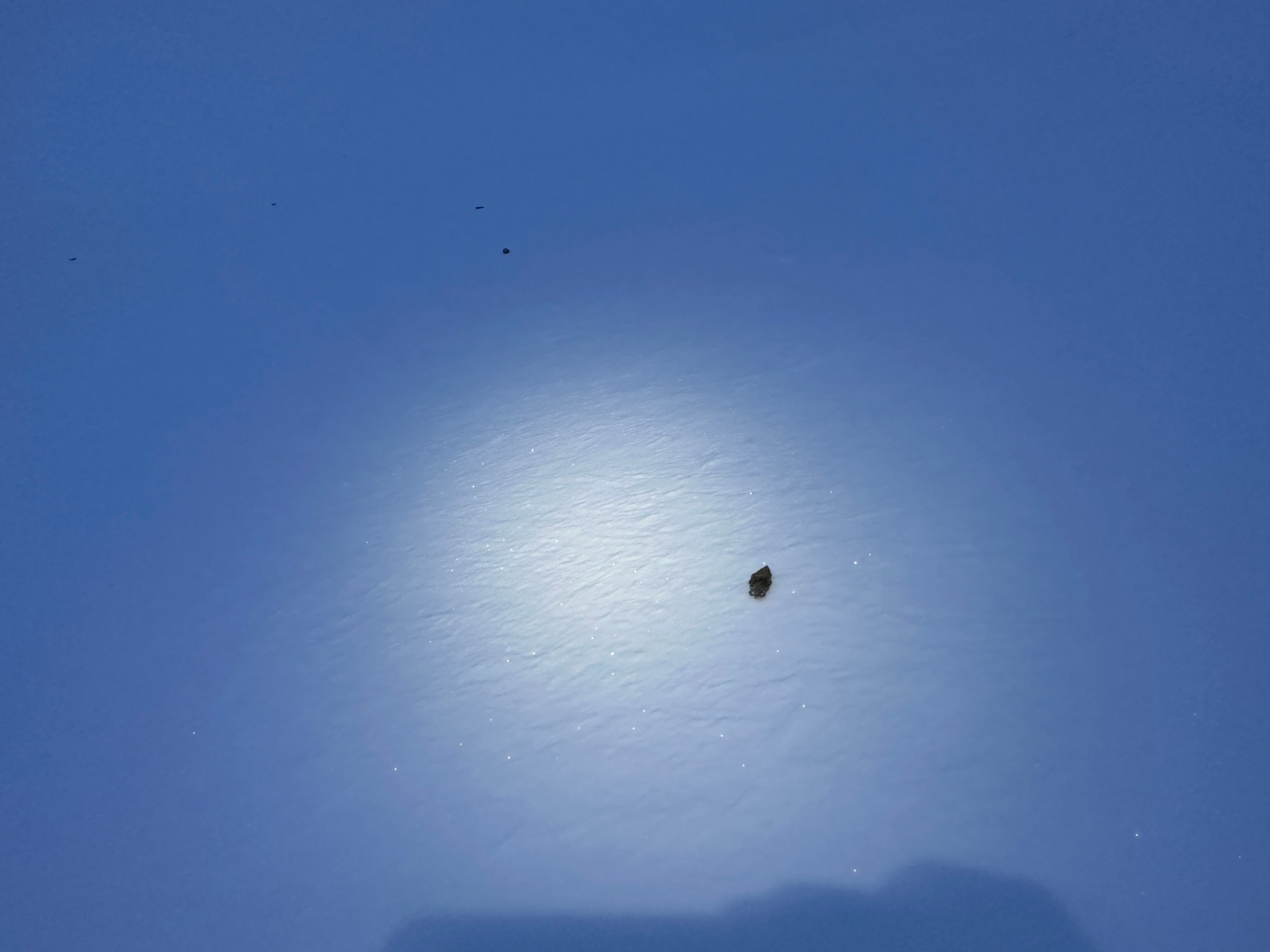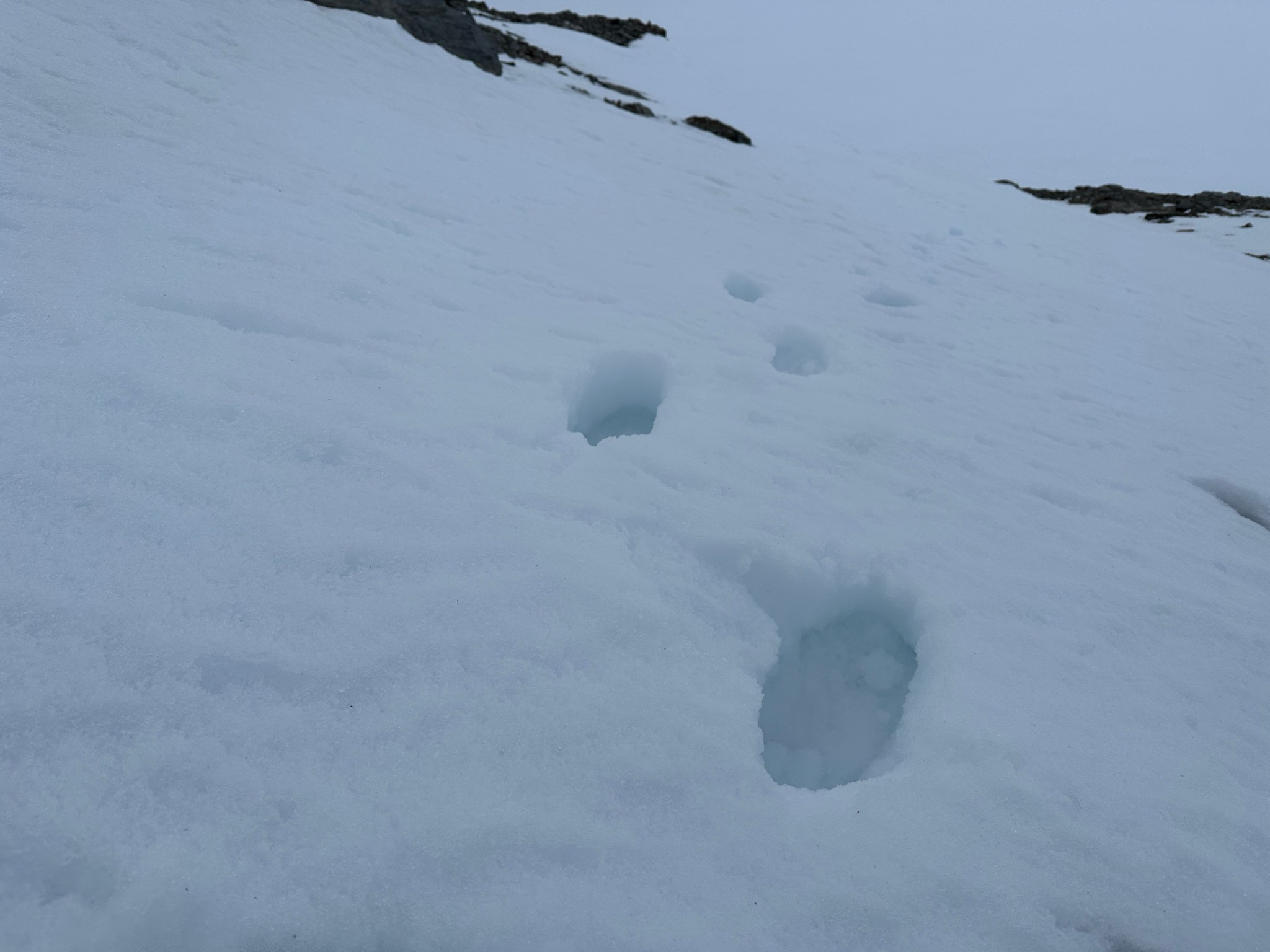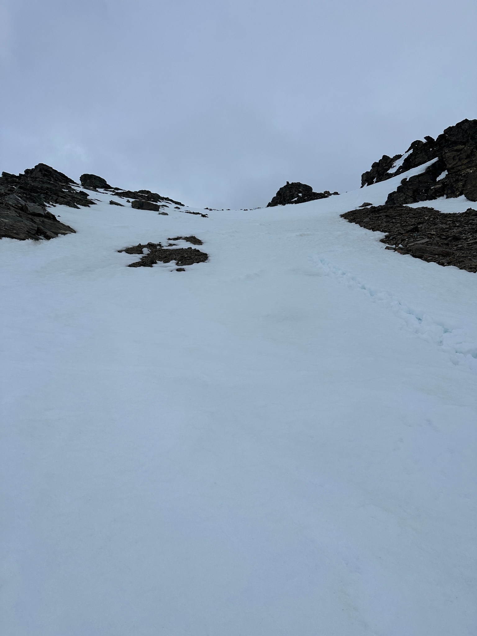Thinking fast, I planted a wand right below the pass, then backtracked and grabbed many rocks as I could carry and began to toss them off the top of the pass down towards where I assumed there would be a valley. Sure enough, the rocks landed on a surface that suddenly seemed much less-steep than in the dim flat light. I skied to my rocks, picked up most of them, and restarted the rock-throwing process. We were able to continue in this manner all the way across the glacier until we found the next snow incline to climb. I left my rocks behind in case we needed them on the way back.