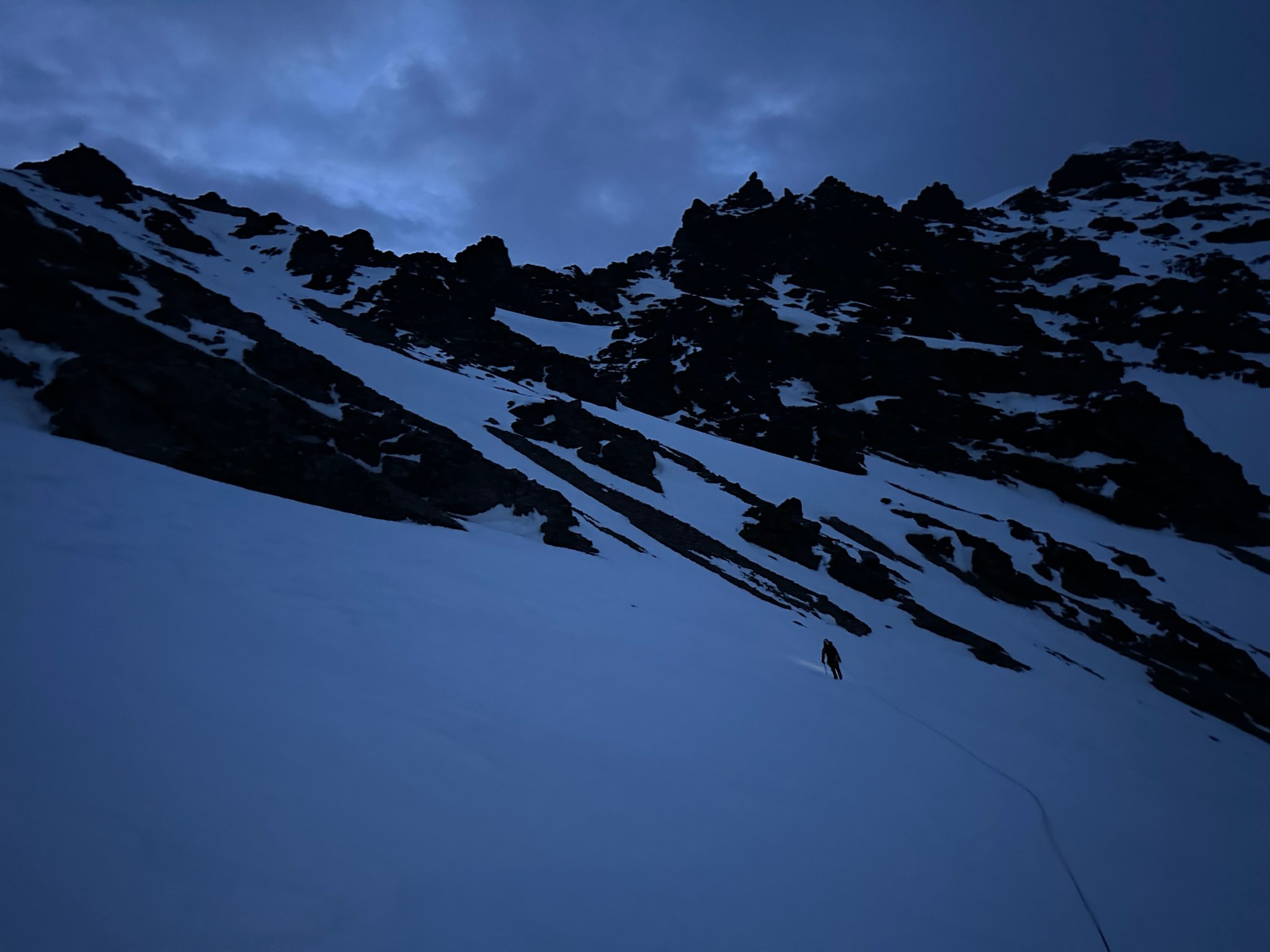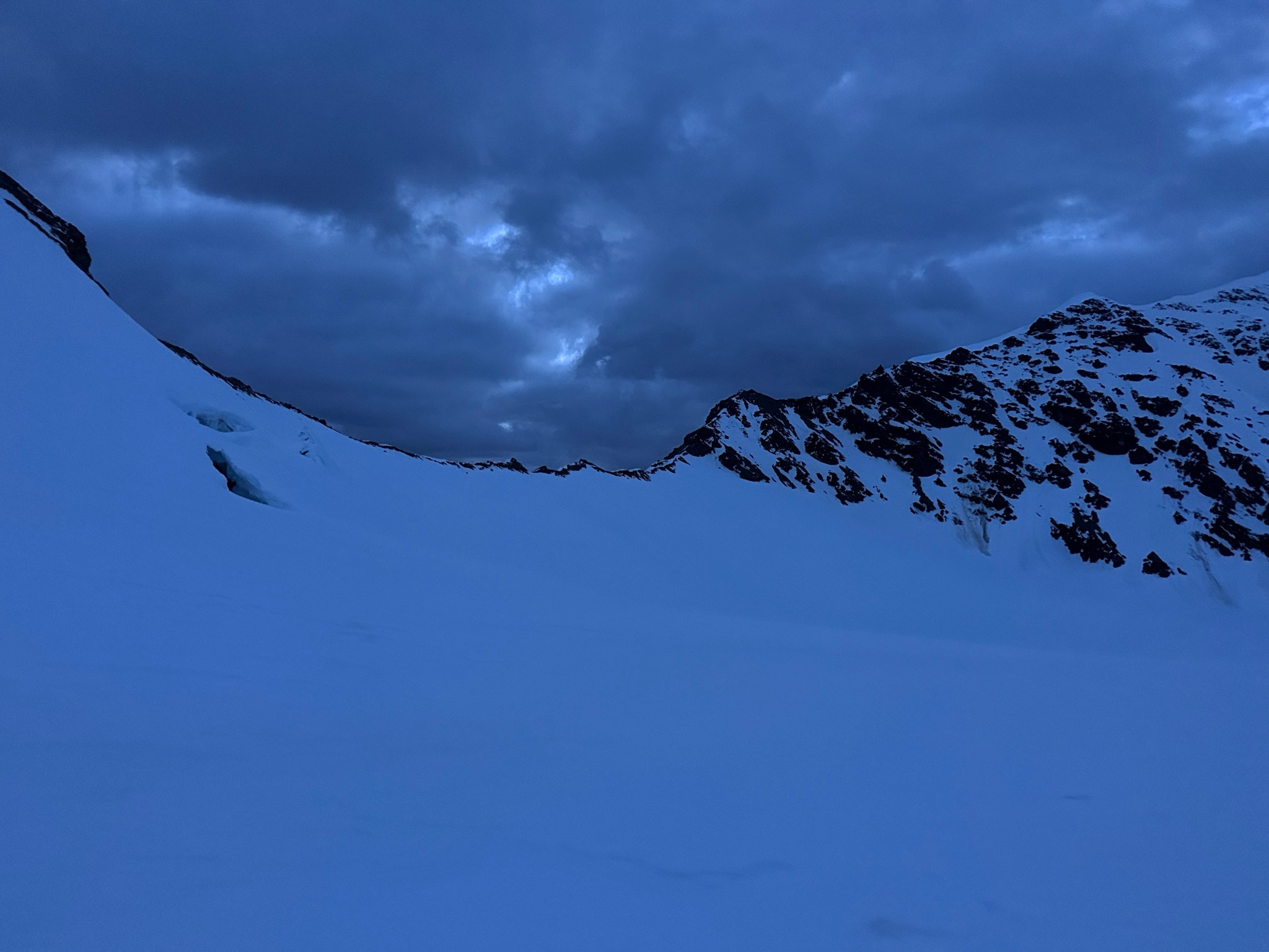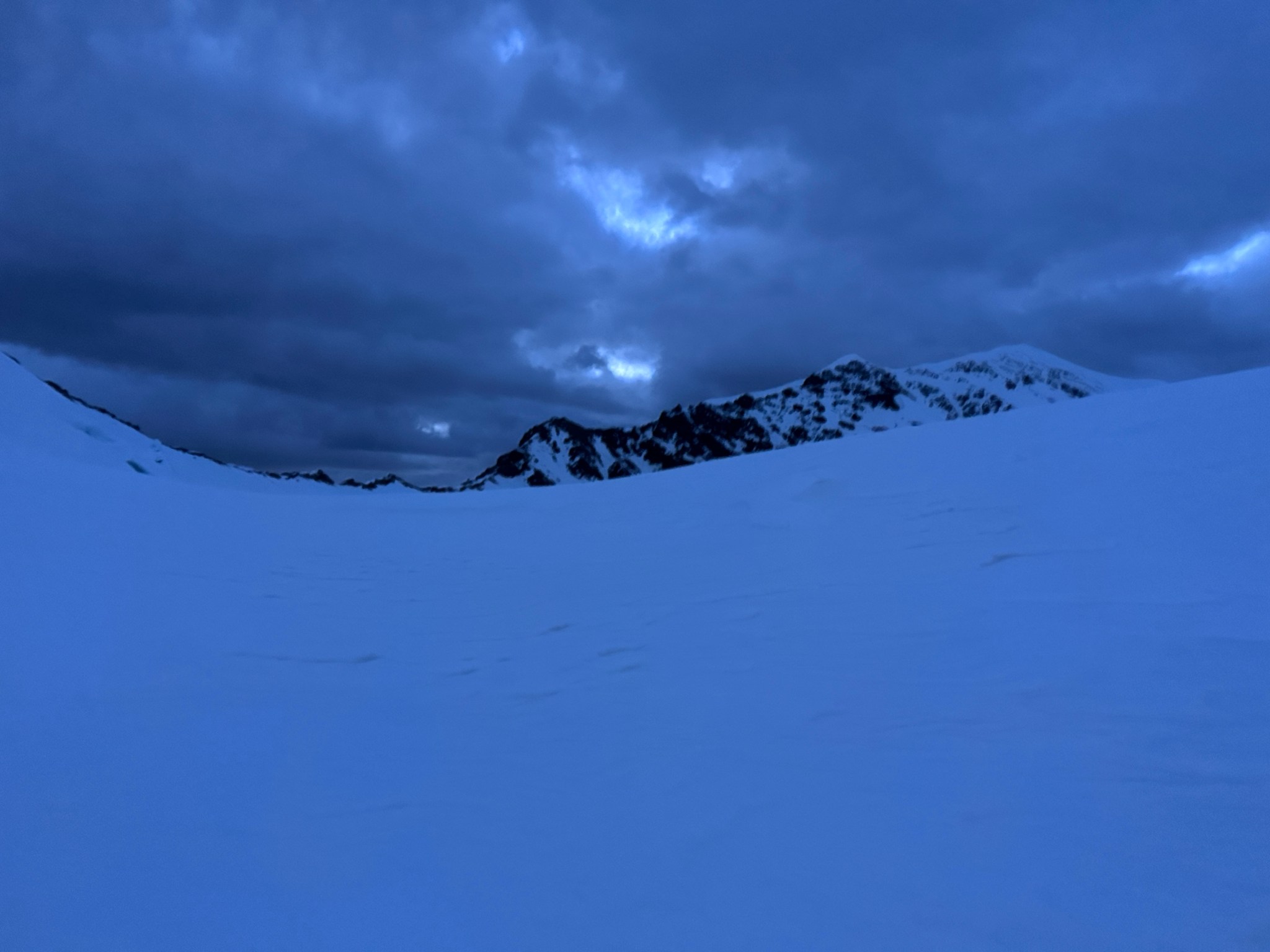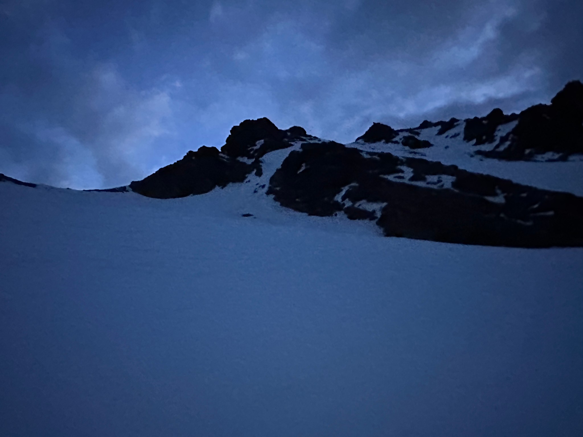 Despite the sun setting, we made good time in the shade and arrived at the ramp to the first col at 10:45PM and climbed to the first col without incident, initially on skis but switching to crampons when the snow steepened and hardened. We emerged on top with next to zero visibility in terms of the route down, as well as a large, mostly-covered crevasse/bergshrund right next to us. Great.