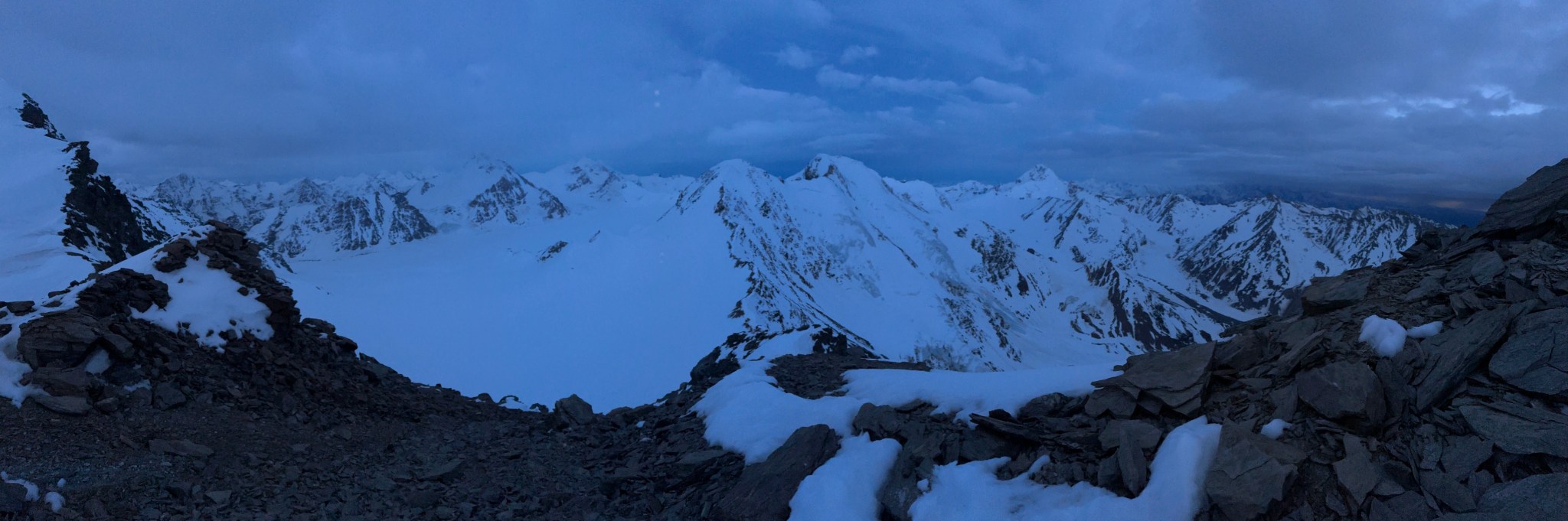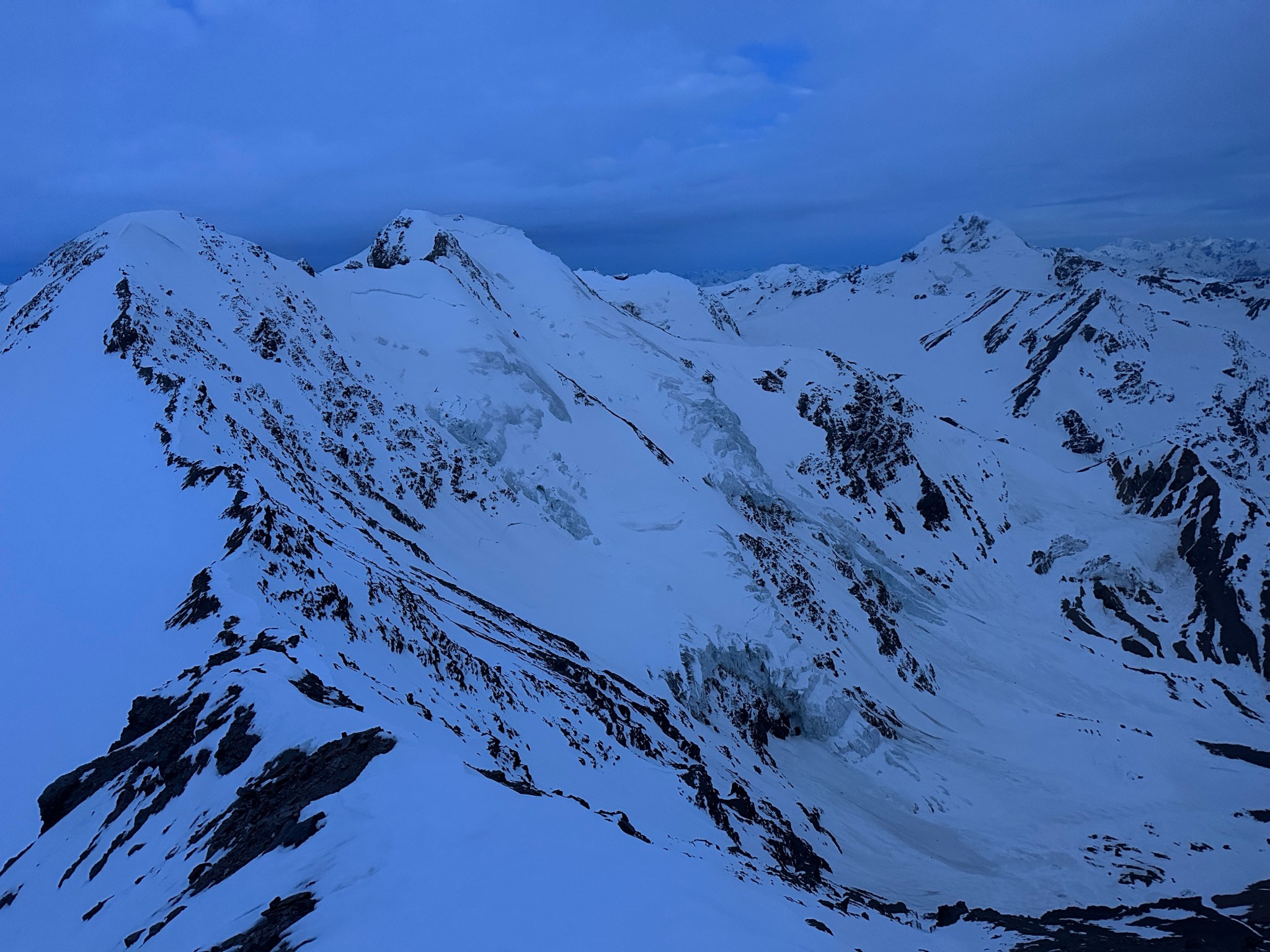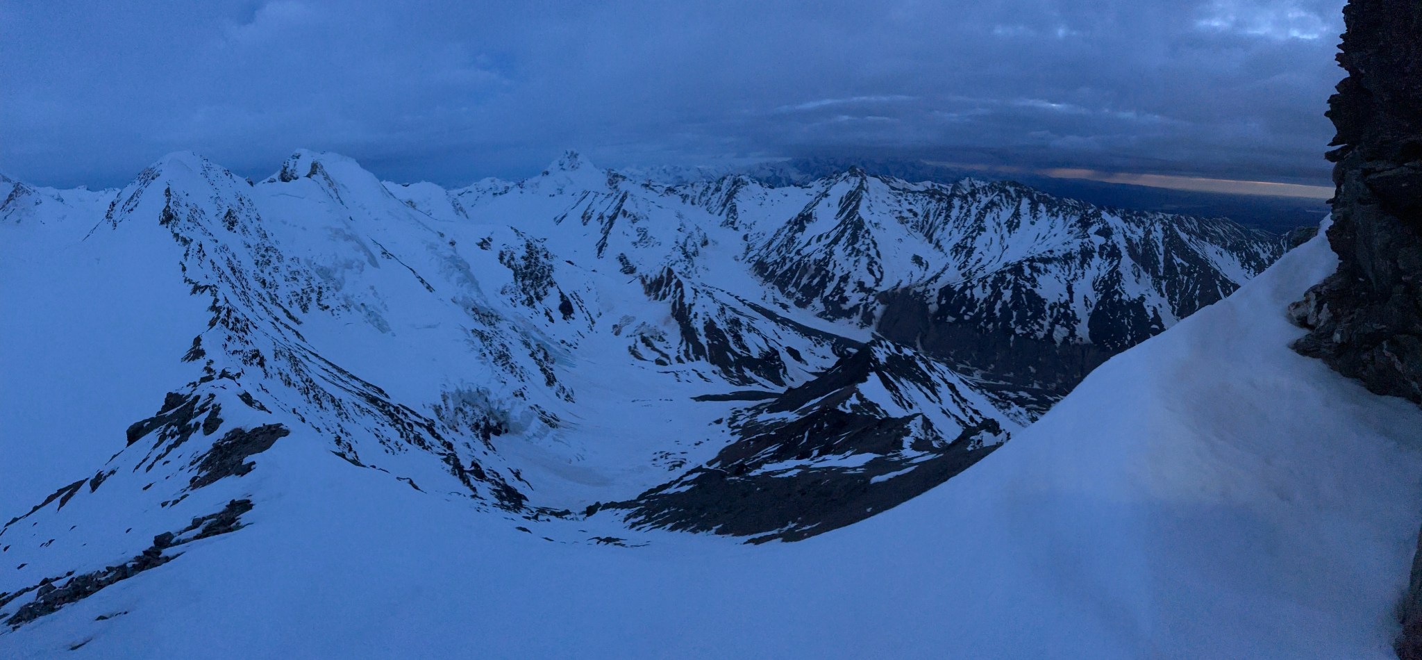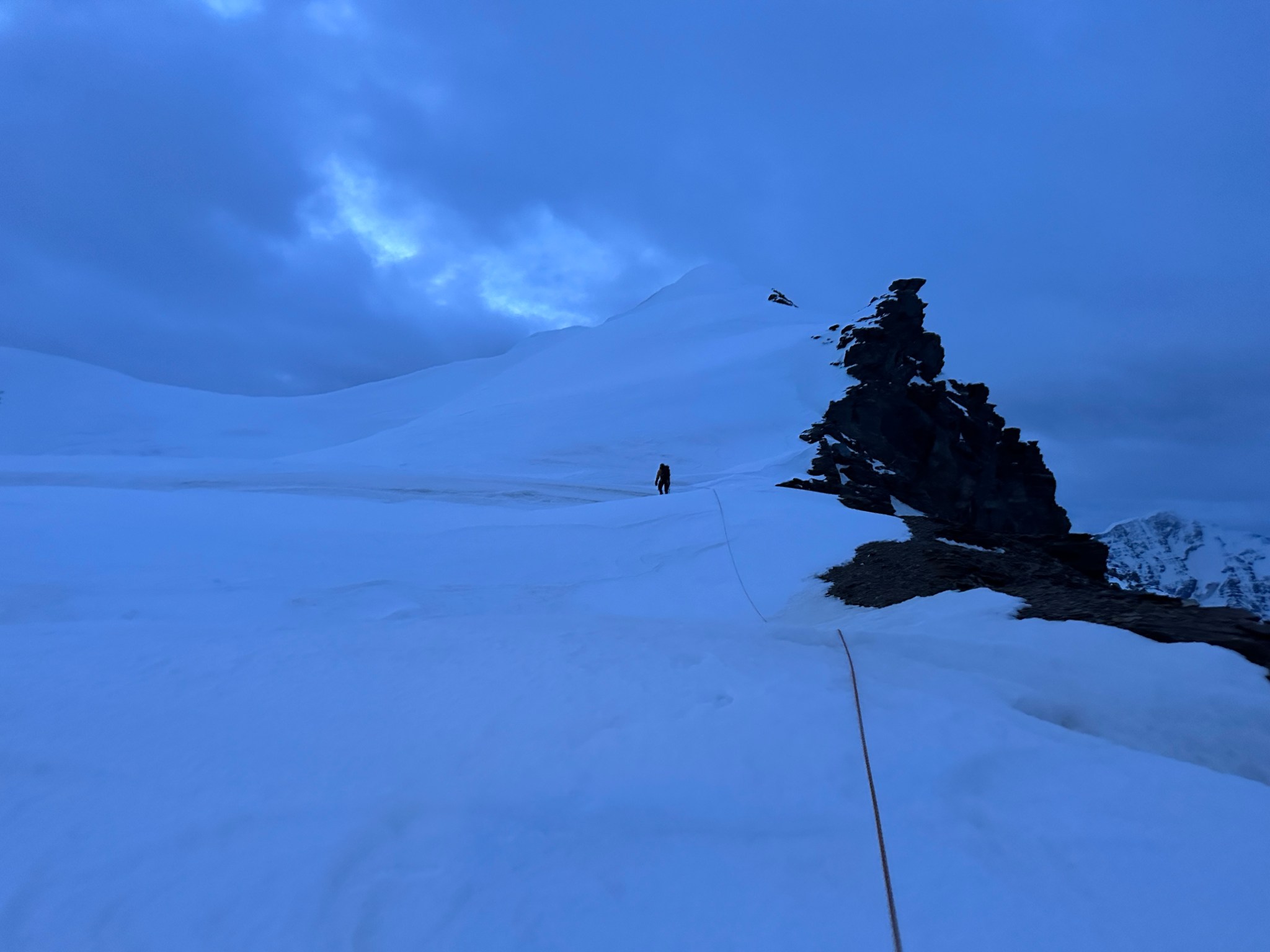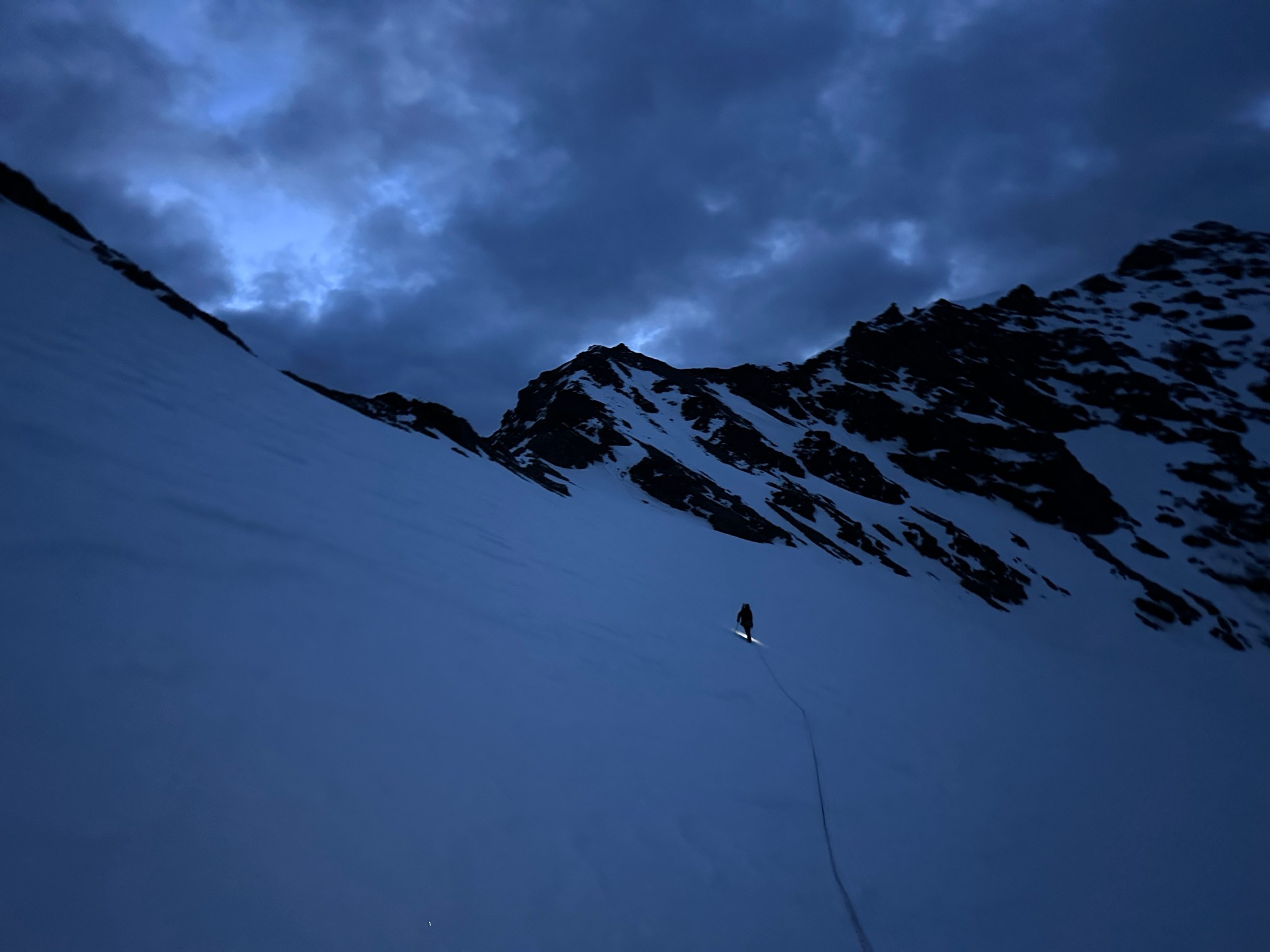 Despite the sun setting, we made good time in the shade and arrived at the ramp to the first col at 10:45PM and climbed to the first col without incident, initially on skis but switching to crampons when the snow steepened and hardened. We emerged on top with next to zero visibility in terms of the route down, as well as a large, mostly-covered crevasse/bergshrund right next to us. Great.