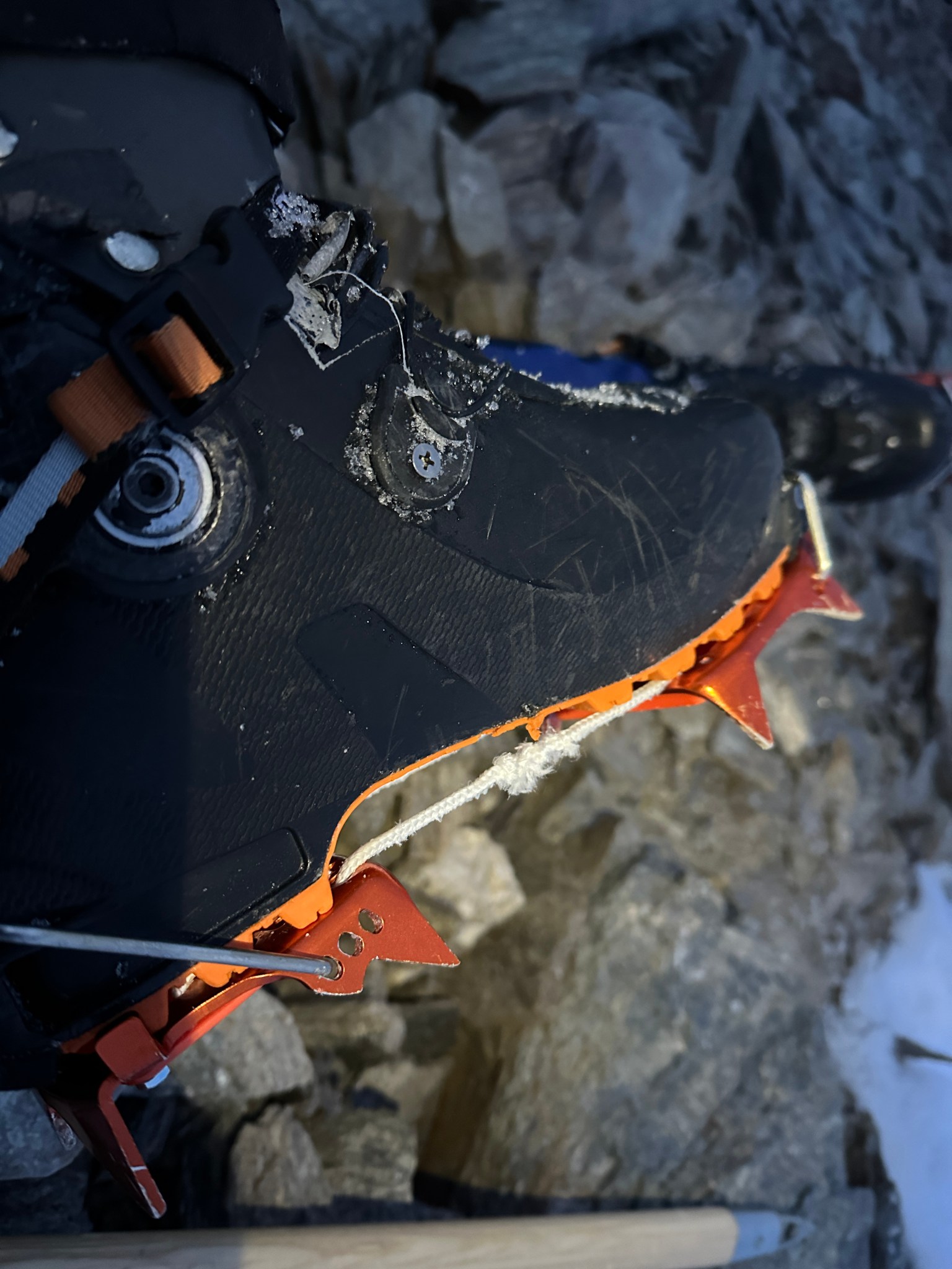 This portion of the ridge topped out and became glacierscape, as fantastic as it was confusing to comprehend. It seemed as though ages, wind caused snow to accumulate in teardrop-shaped piles on the west side of this ridge, forming into glaciers. But the piles are pulled in multiple directions, causing small cracks to form that start as horizontal cracks down and across the ridge that slowly bend downward. Similar to Institute Peak’s swoops, there were sections that continued to steepen until they plateaued. However, unlike Institute these were formed of glacier ice and various cracks ranged across the snow-covered ice. Most of the visible cracks were pencil-thin to foot-width. My crampon fell off as I was descending, the first high point on the ridge, though not due to a crack. Inspecting my new-fangled lightweight crampon, I discovered the cord that connects the toepiece to the heel piece had been mostly-severed by the shale….great. Now another anxious thought to bounce around my mind. Good footing is important on a climb called Double Exposure. I fitted the crampon back on, hoping it would stay on. It fell off again about 20 minutes later.