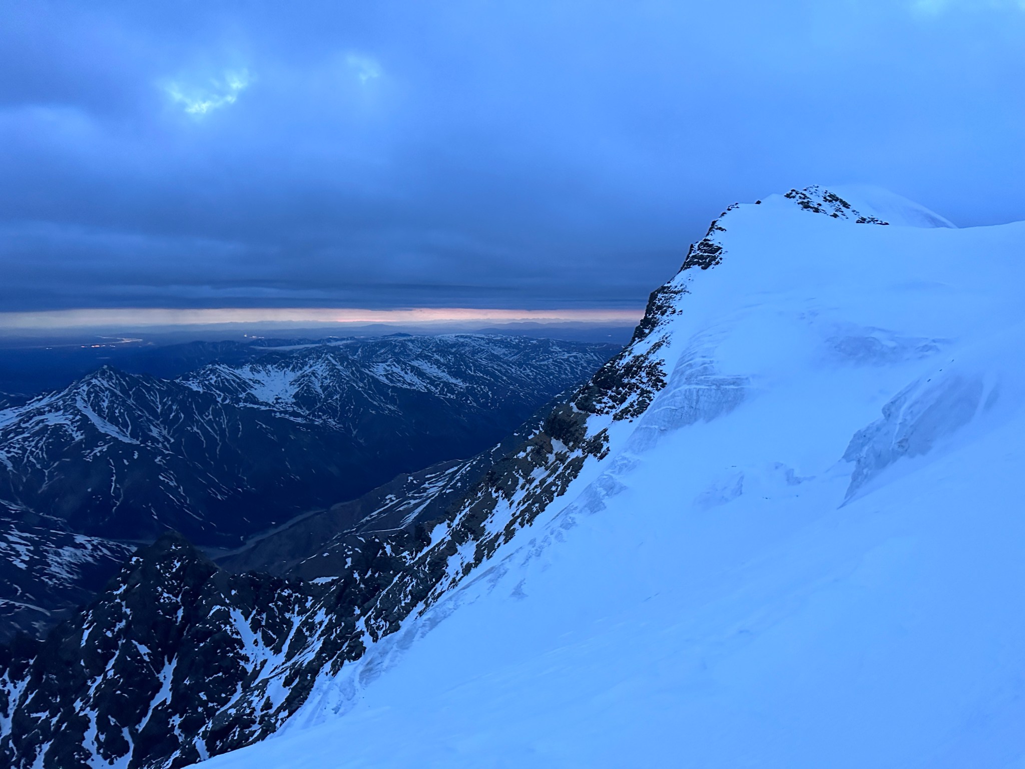 As it was, I was okay not climbing the remaining 300’ of elevation and half mile to the tightrope on top in a cloud, okay with the photos I had taken in my ignorant excitement (though I do wish the weather had been better and I had used my nice camera). I could see Donnaly Dome dimly from afar. Delta Junction’s and Fort Greely’s lights were visible before dawn. I’m fairly certain I saw Denali with pink alpenglow through a gap in the Hayes Range, and it sure seemed like I could see hills as far north as Fairbanks. They seemed to go on forever. I’ve never climbed so far north in the range, it really did feel like being on a precipice as there was simply nothing bigger further north.