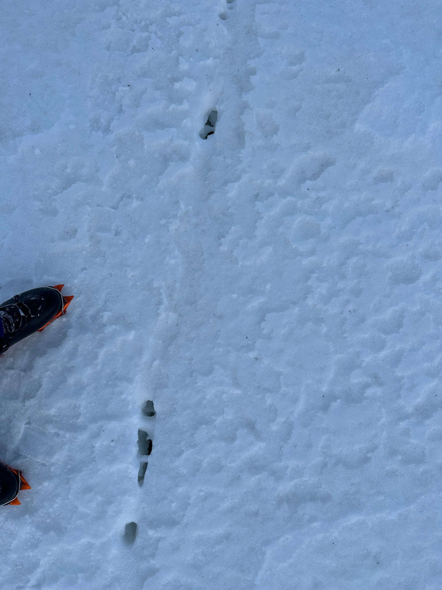 As I followed Quinn up the ridge, I noticed how truly chill the travel was. No wonder route information was scant, there’s not much to climbing once on the ridge. Having passed the rock section, I was feeling light and excited at how quickly we were advancing up despite my lacking the desire to climb higher. The curiosity battled the pain in my gut. Only 8 other people (and one dog) have been on this ridge, as far as I knew. I opened my mind to the possibility we could actually reach the ulu blade of the summit, something I had refused to consider in order to avoid forming expectations and potentially experiencing disappointment. As we neared the first steep snow obstacle, a false summit bump on the ridgeline, I was walking around sideways to consider how to climb it when my crampon fell off. This crampon problem was getting about as annoying as the gas in my belly.