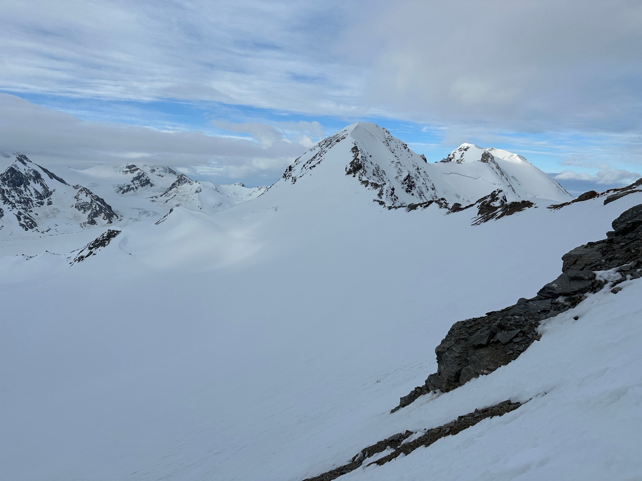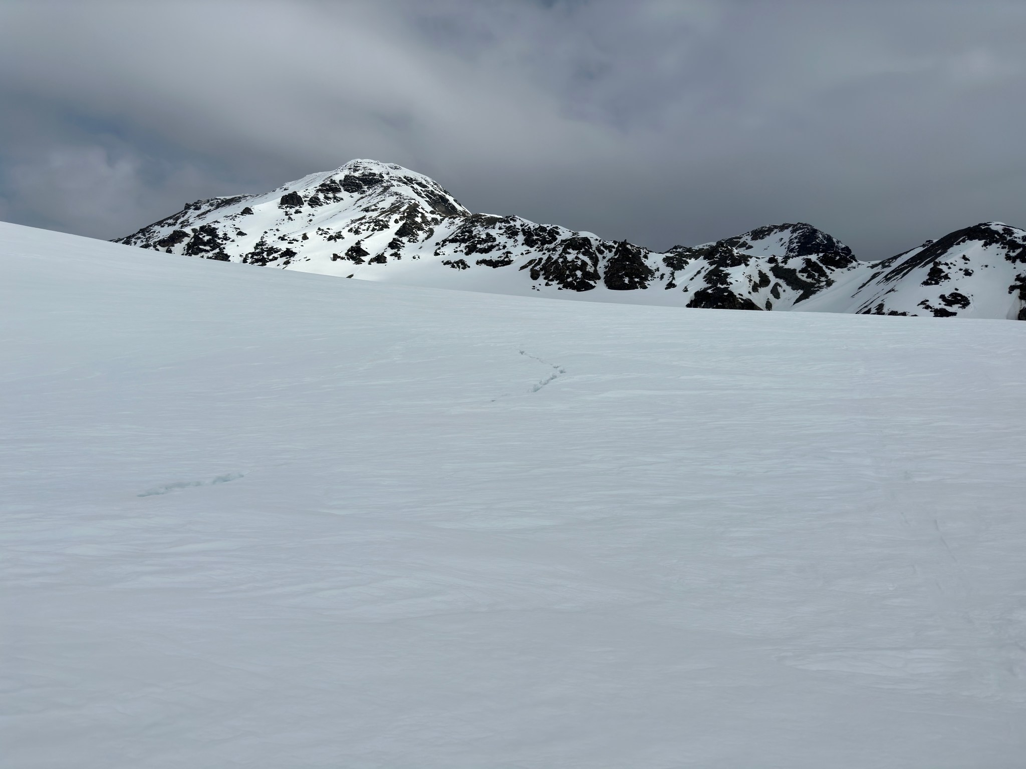 We traversed the mellow knife edge which lead to a small summit we didn’t climb; with the way snow had filled in the crevasses there was no need to climb that particular low summit; instead we traversed the glacier that clung desperately to it’s west face, a bowl with large crevasses crossing lengthwise. I’m unsure if all 6 known others who previously climbed this ridge traversed the bowl, but walking on the ice between crevasses just made sense to us with all the extra snow. Plus, we later found out the ridge after the false summit was broken by a crevasse. Into the bowl we went, one of the most beautiful and mildly terrifying traverses I’ve walked. The fear was all mental due to knowing the risks and hazards (4000′ drop); the walking was easy.