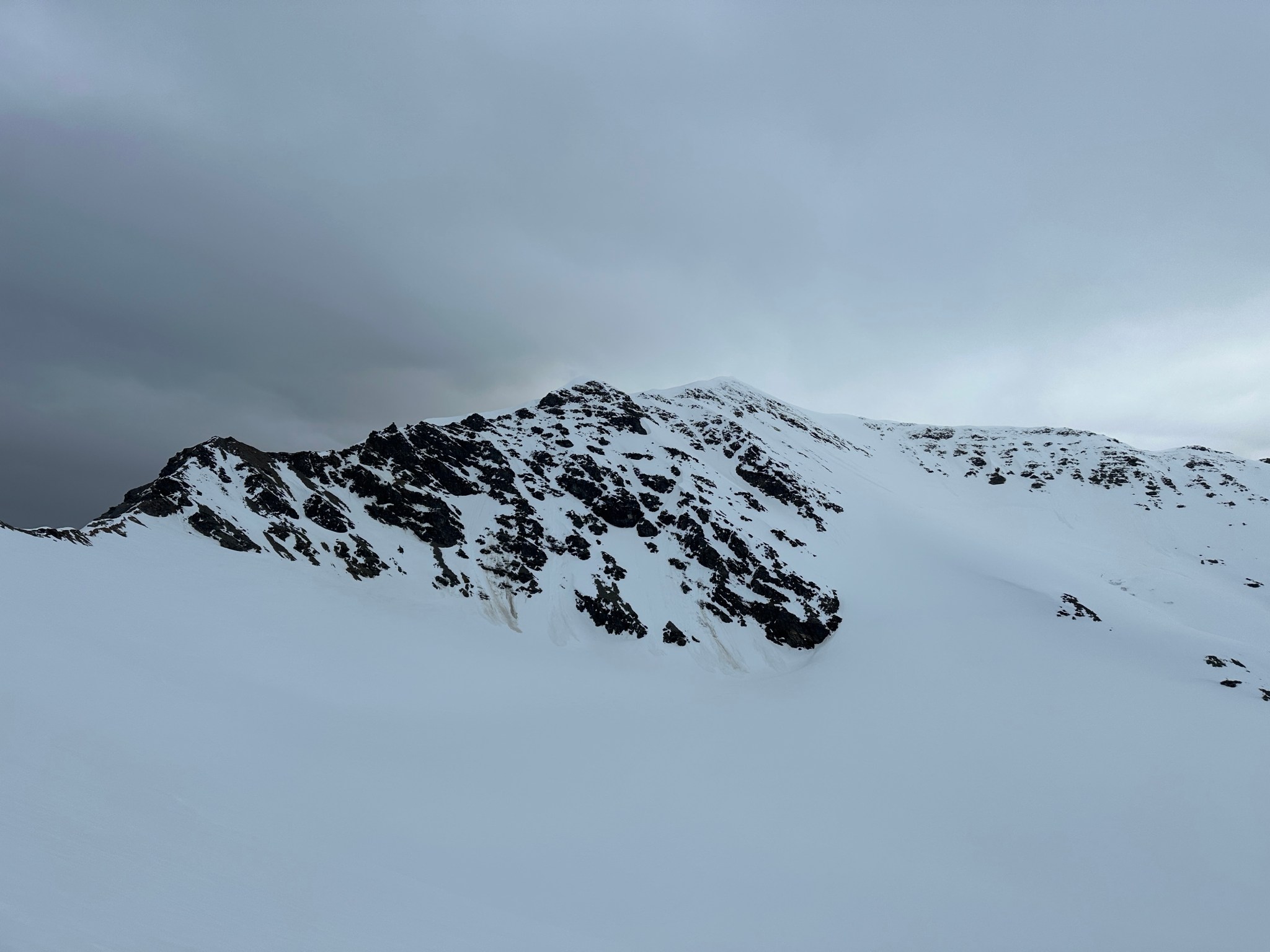 Between us and the ulu blade of a summit ridge, Quinn pointed out the exposed rock moves one would have to make to continue climbing the ridge; I was barely ever a rock climber, but I can judge it was at least a 5.7X ladder with a knife edge approach, with 2000′ and 4000′ feet of exposure to the east and west, respectively. I laughed at the absurdity of the idea of continuing. That amount of exposure was a bit more danger than I was prepared for, Jalen had said it was a few moves at most. The mountain is aptly-named.