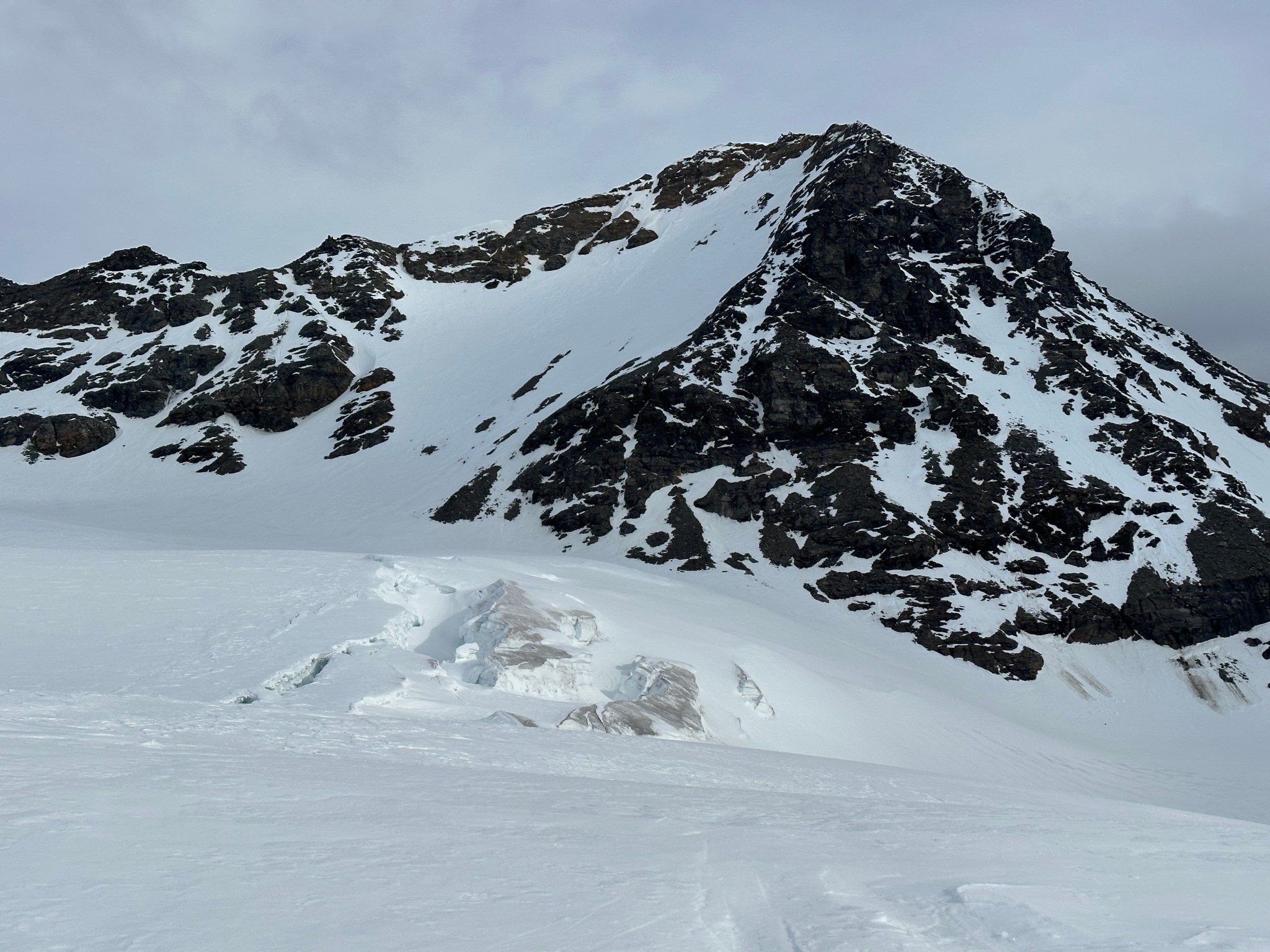 I had been mistaken in believing the earlier shale section was the crux, though the ease of the shale climb should have made my mistaken assumption obvious. The knife edge below the rock move looked as though it would be a lot more reasonable in March or April before the snow started to melt, climbing rotten/refrozen sugar snow on loose rock did not look like a good time. It seemed possible one could sacrifice some elevation and avoid the gendarme by traversing below, but this would involve obvious crevasse danger and would be pointless with the summit in a cloud. So we decided to turn around.