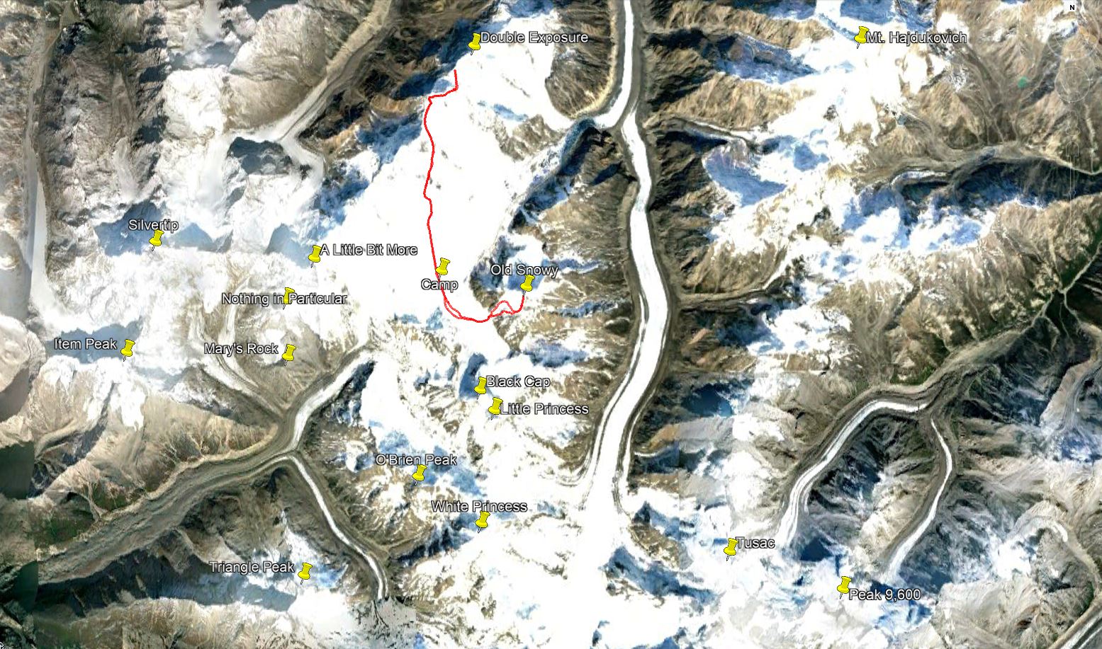 We waited until the moon came up, and started stumbling down the ridge. We tried the west side of the ridge, but it dropped into a hanging glacier that was all mixed up. So, we had to ascend back up the ridge and go further north east. We stumbled into camp about 6 in the morning after 22 hours of climbing. Sputnik had chewed Jim’s pad into about a thousand pieces.