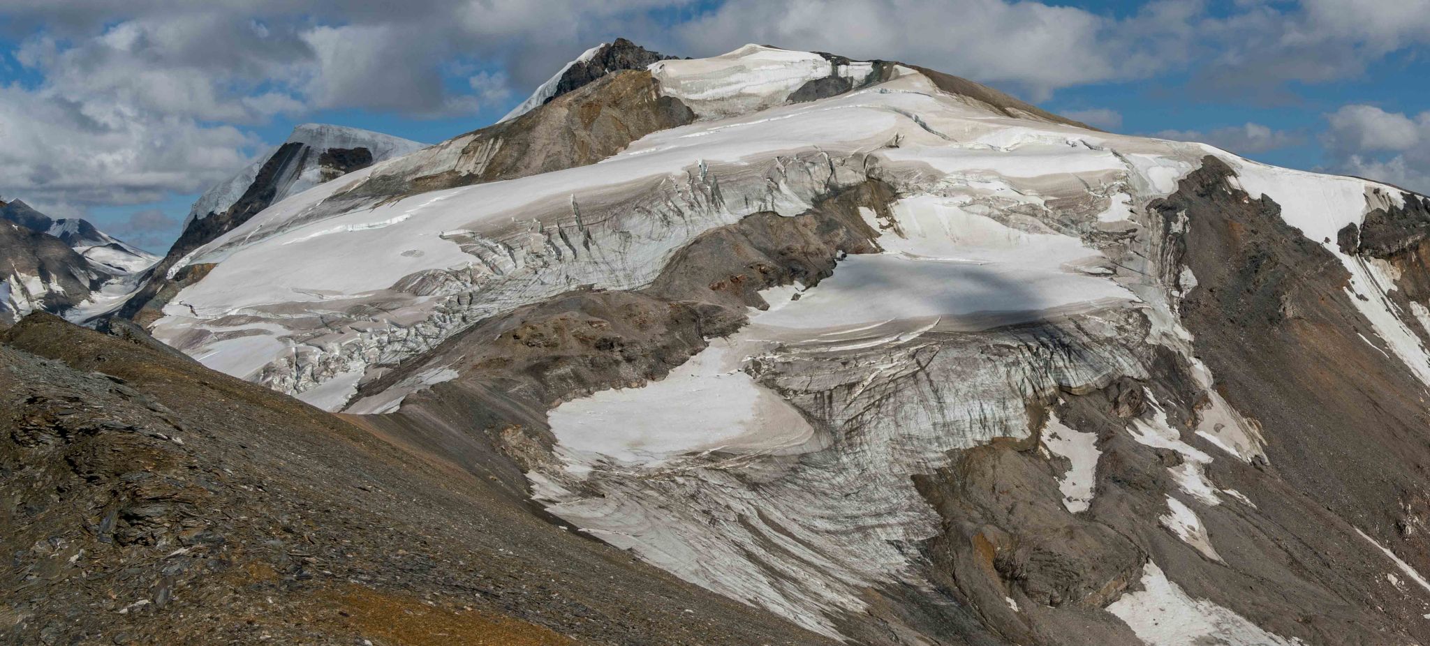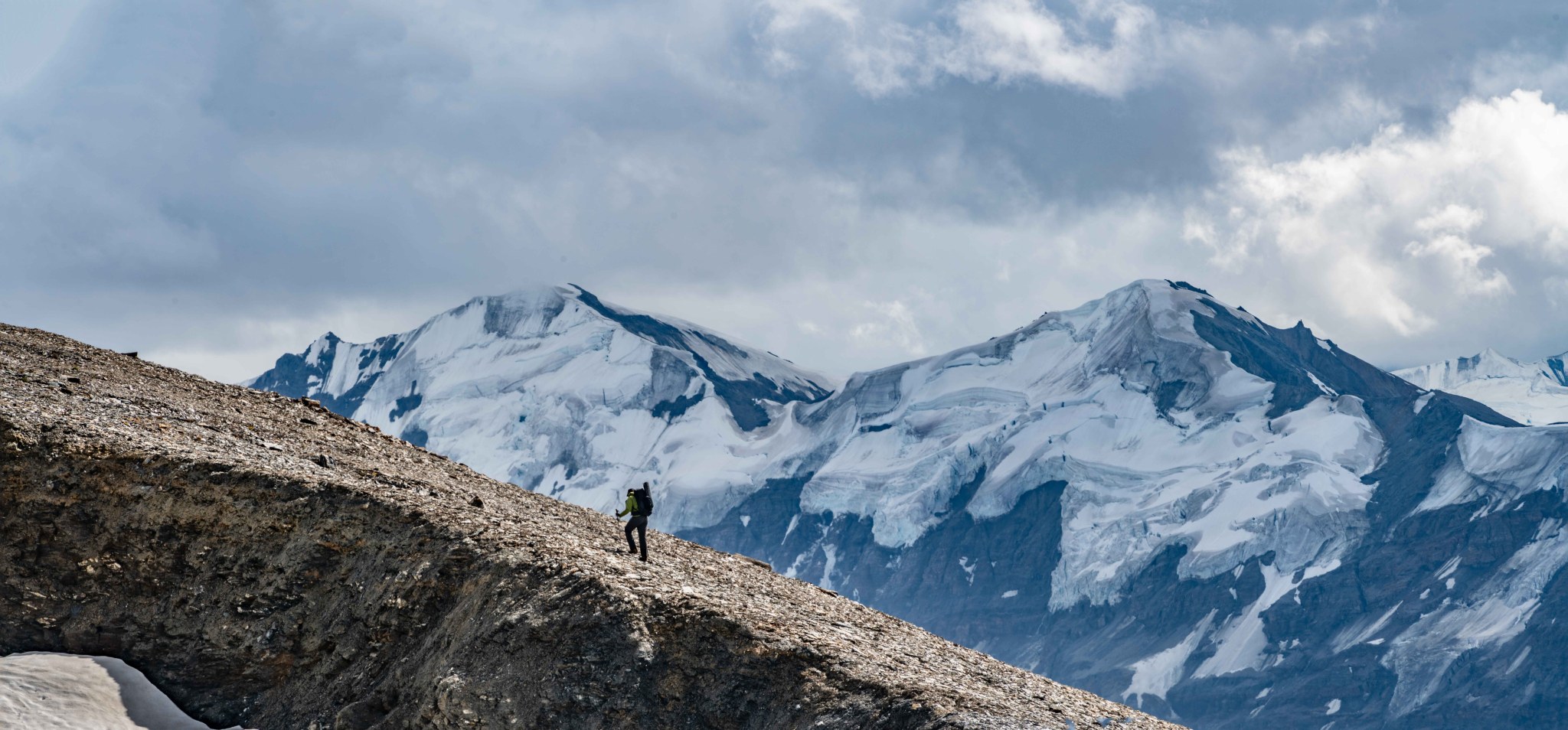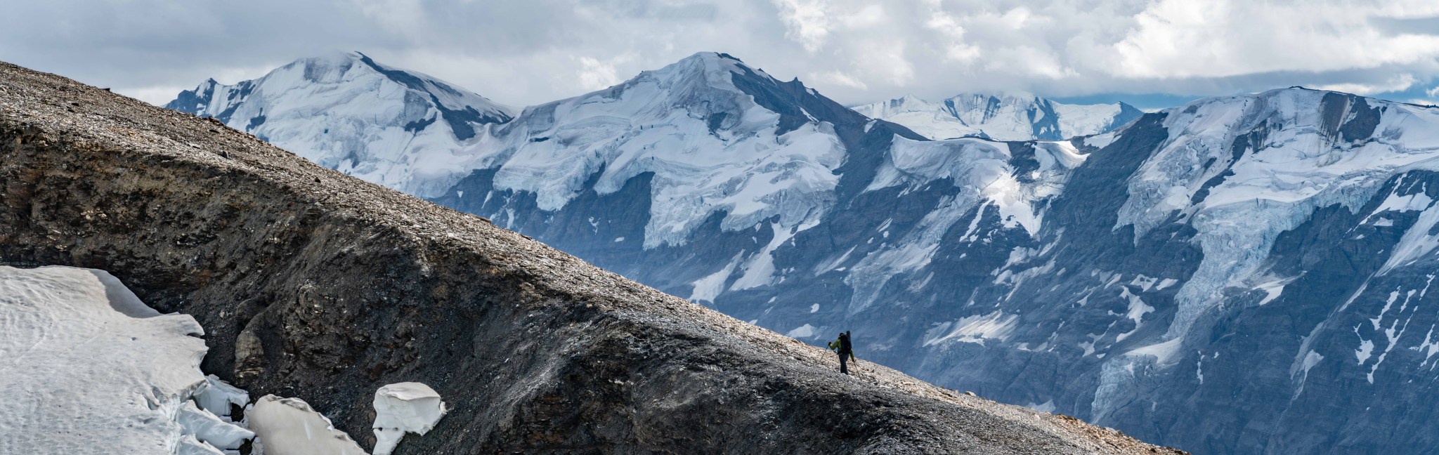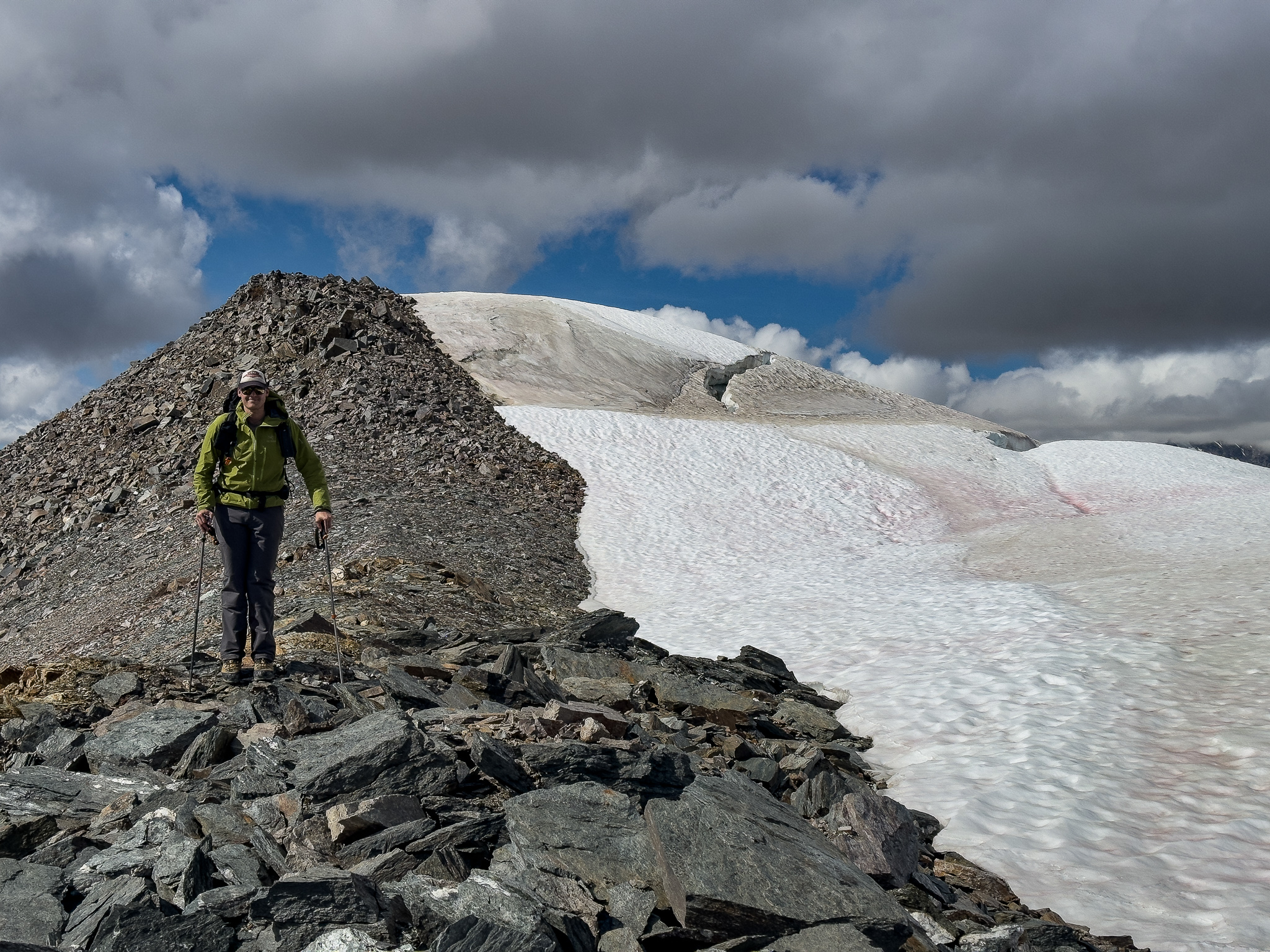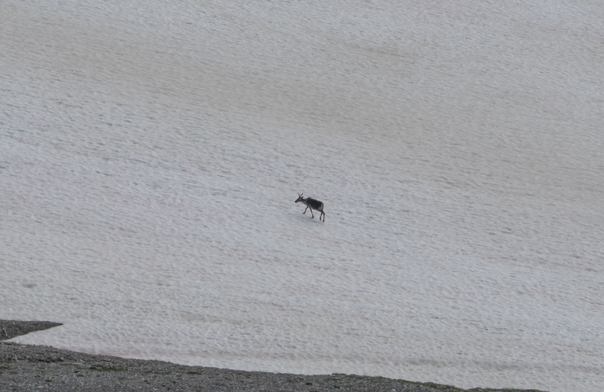 Once on the far side of this perpendicular ridge, the nature of the Divide changed. We began to hike alongside the massive cornices that feed the Broken Glacier to the west and could see T2’s lower remnant glacier/snowfield to the east. We also spied a lone caribou making its way up the snow. Separated from it’s herd, it won’t last the winter.