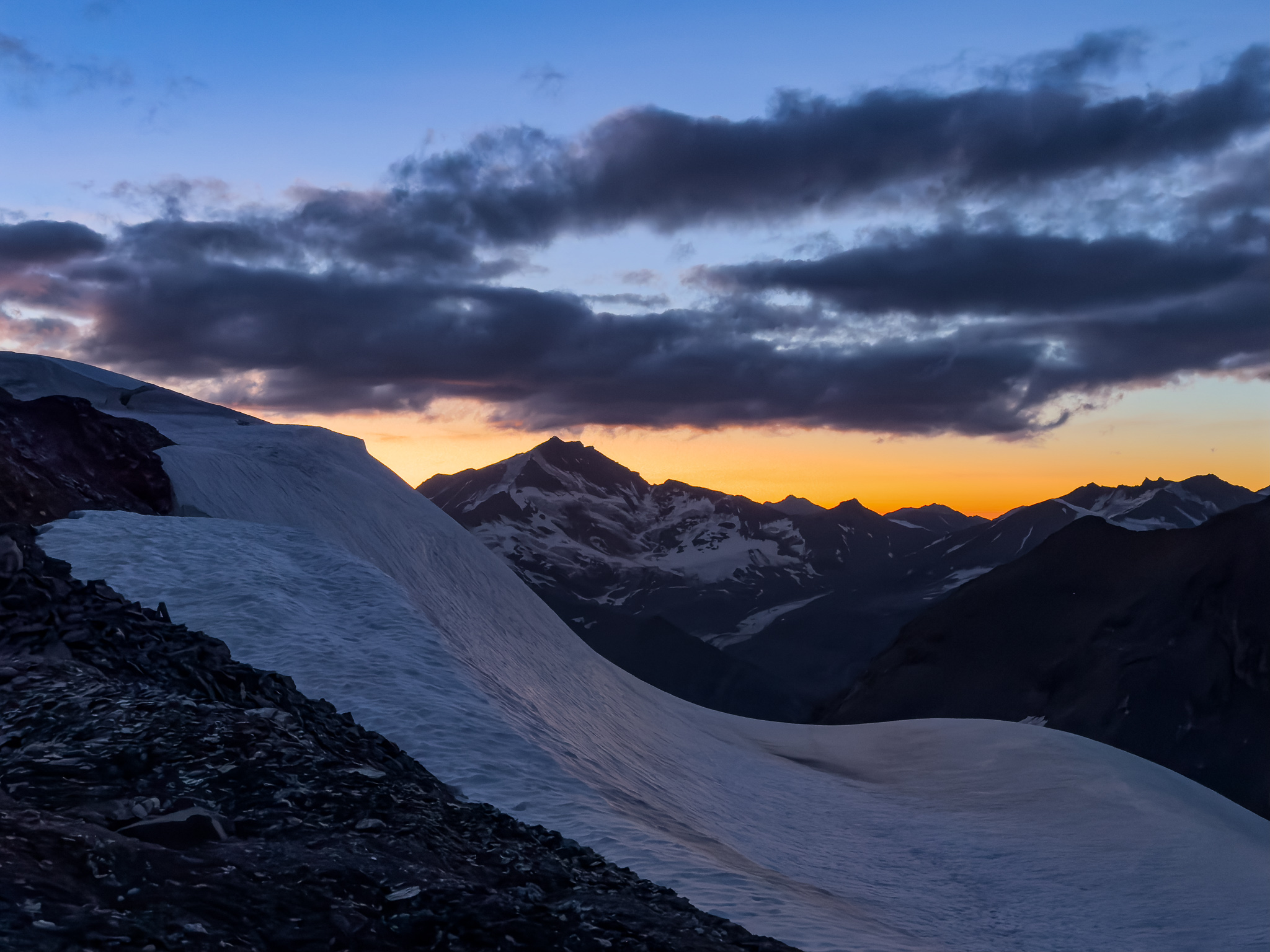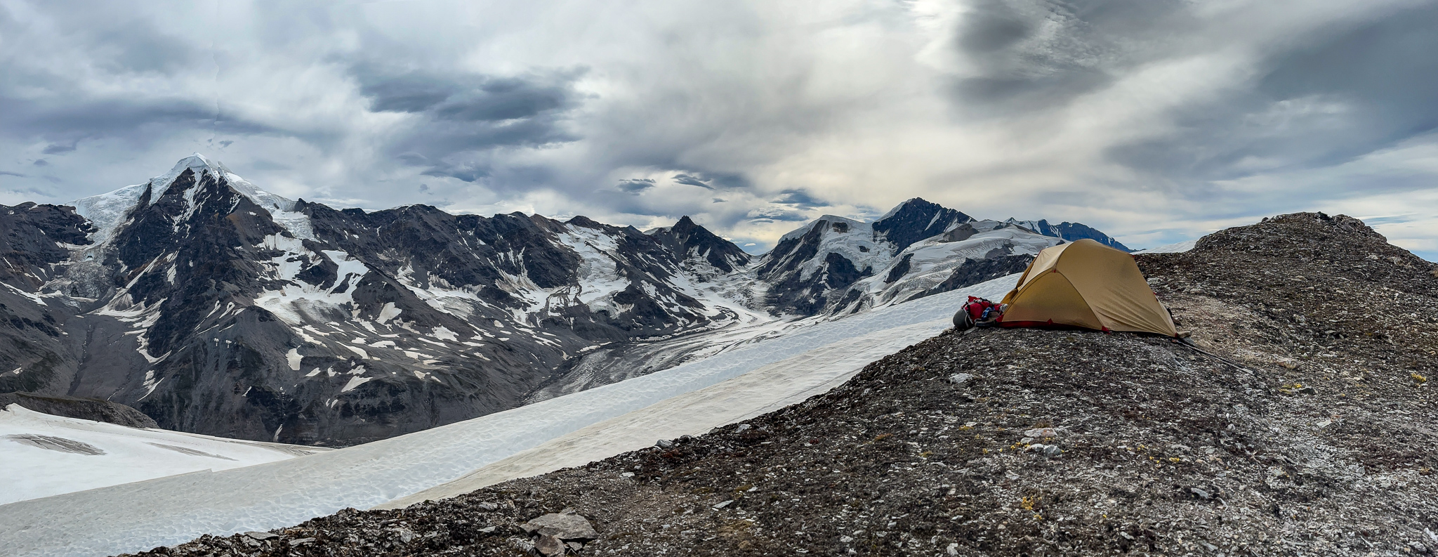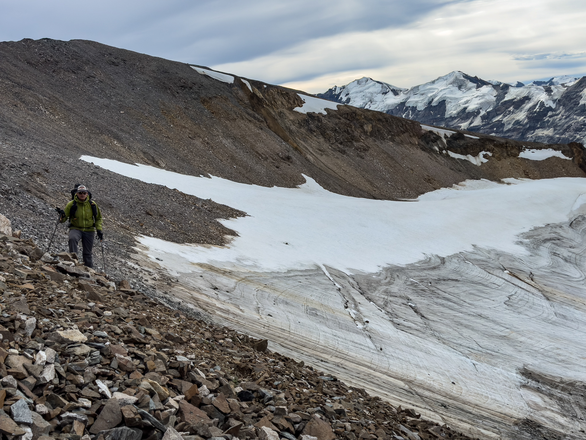 Although I wanted to camp further down the ridge, I offered a few options. After scouting a few hundred feet down the ridge, it was clear there was no camping spot in that range and we’d have to hike at least a quarter mile or so further to find flat ground. We could construct a tent platform on the ridge just past T2, or we could make camp on the snowy edge of the glacier on the northeast side of the ridge. Although the snow was tempting as it would make a quick platform, we decided to stack rocks and construct a tent platform on the ridge. The dramatic campsite sported a thick, increasingly steep glacier a few dozen feet to the northeast, and long scree slopes directly southwest.