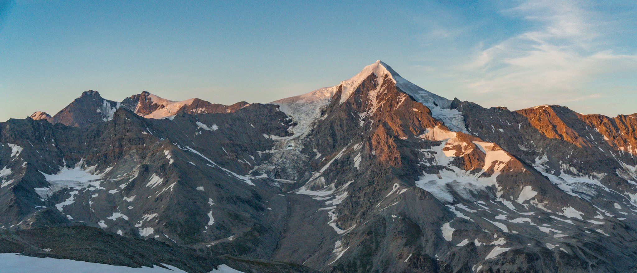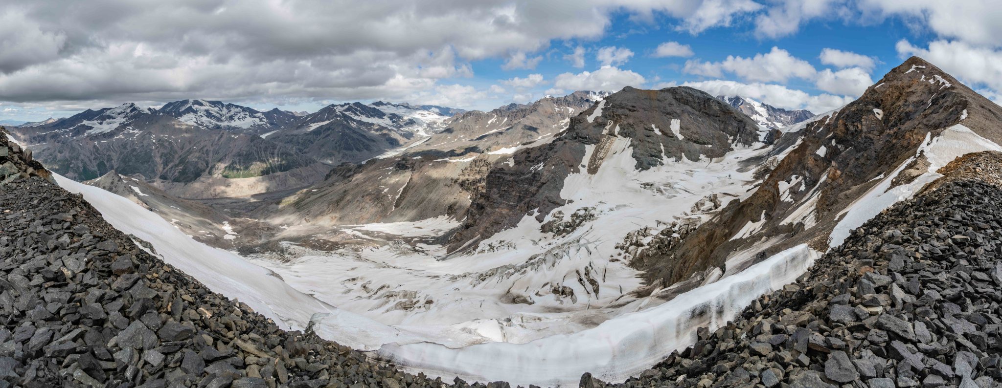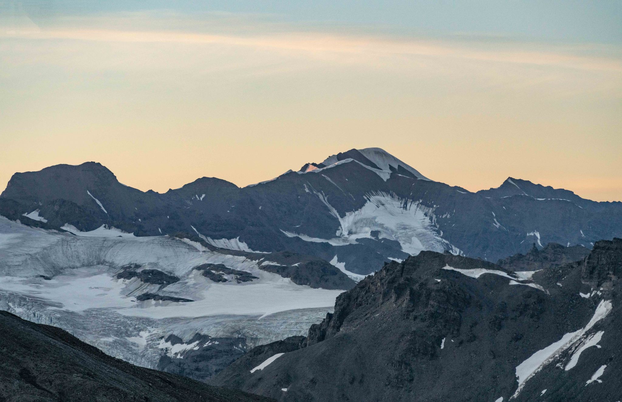Although I wanted to camp further down the ridge, I offered a few options. After scouting a few hundred feet down the ridge, it was clear there was no camping spot in that range and we’d have to hike at least a quarter mile or so further to find flat ground. We could construct a tent platform on the ridge just past T2, or we could make camp on the snowy edge of the glacier on the northeast side of the ridge. Although the snow was tempting as it would make a quick platform, we decided to stack rocks and construct a tent platform on the ridge. The dramatic campsite sported a thick, increasingly steep glacier a few dozen feet to the northeast, and long scree slopes directly southwest.