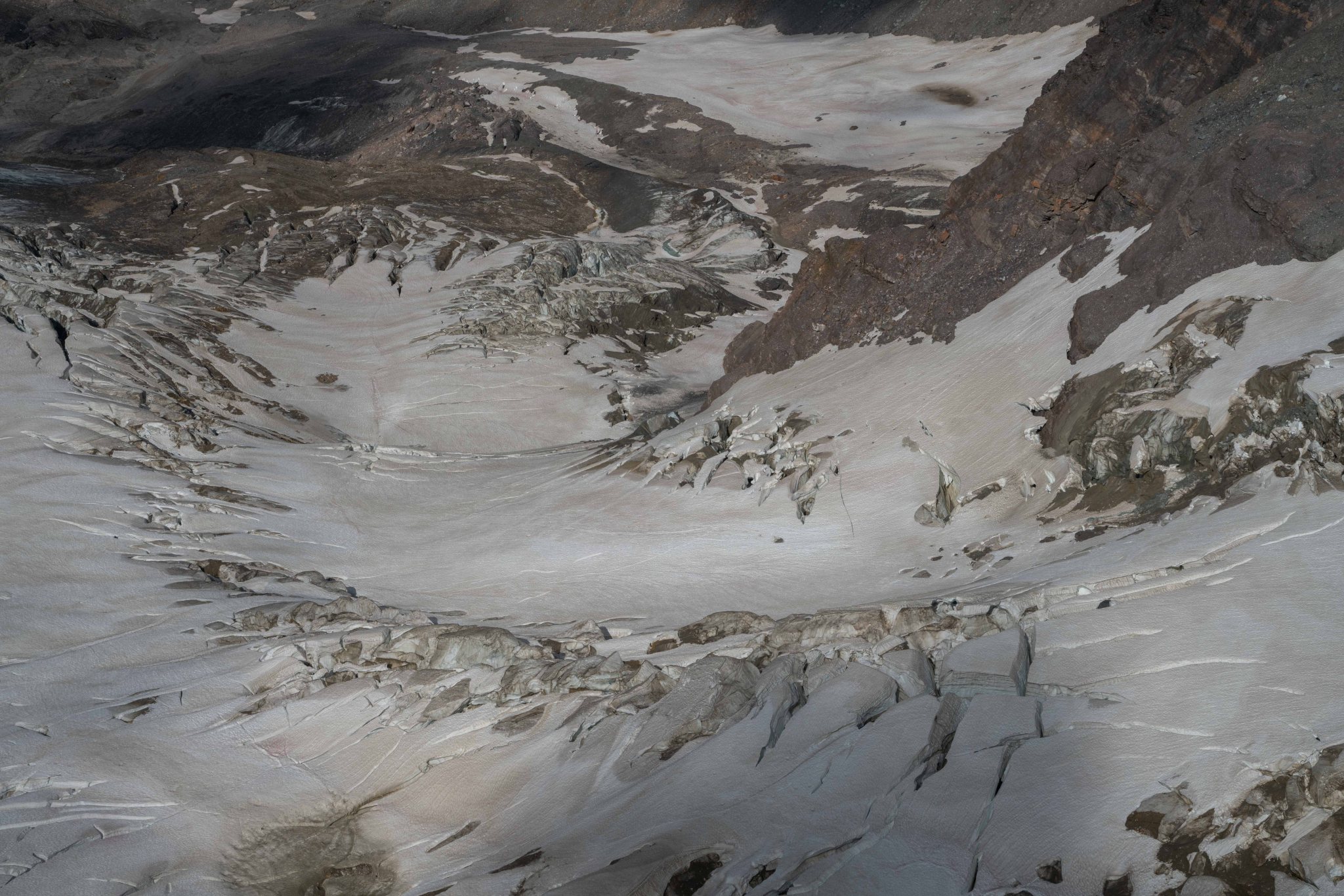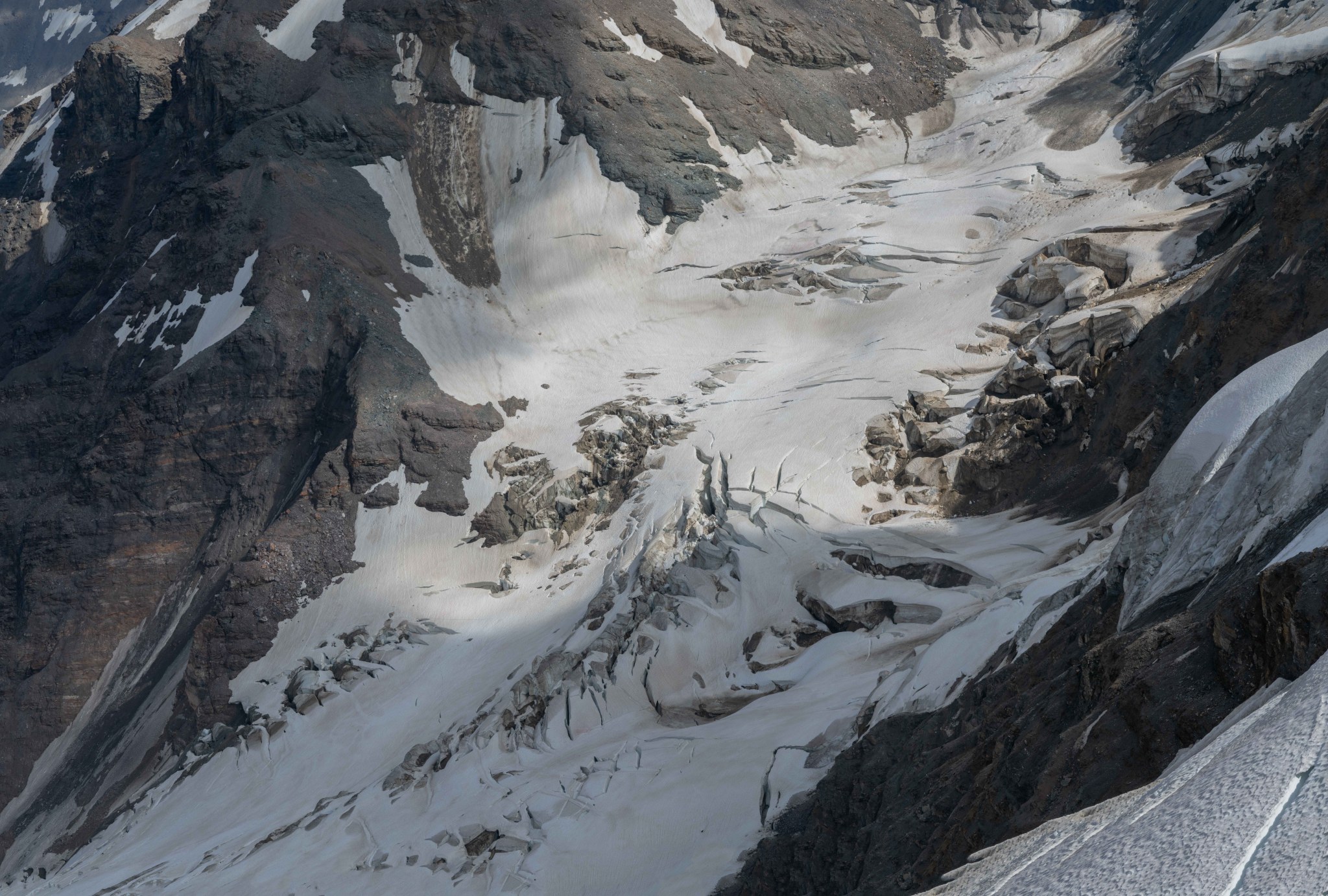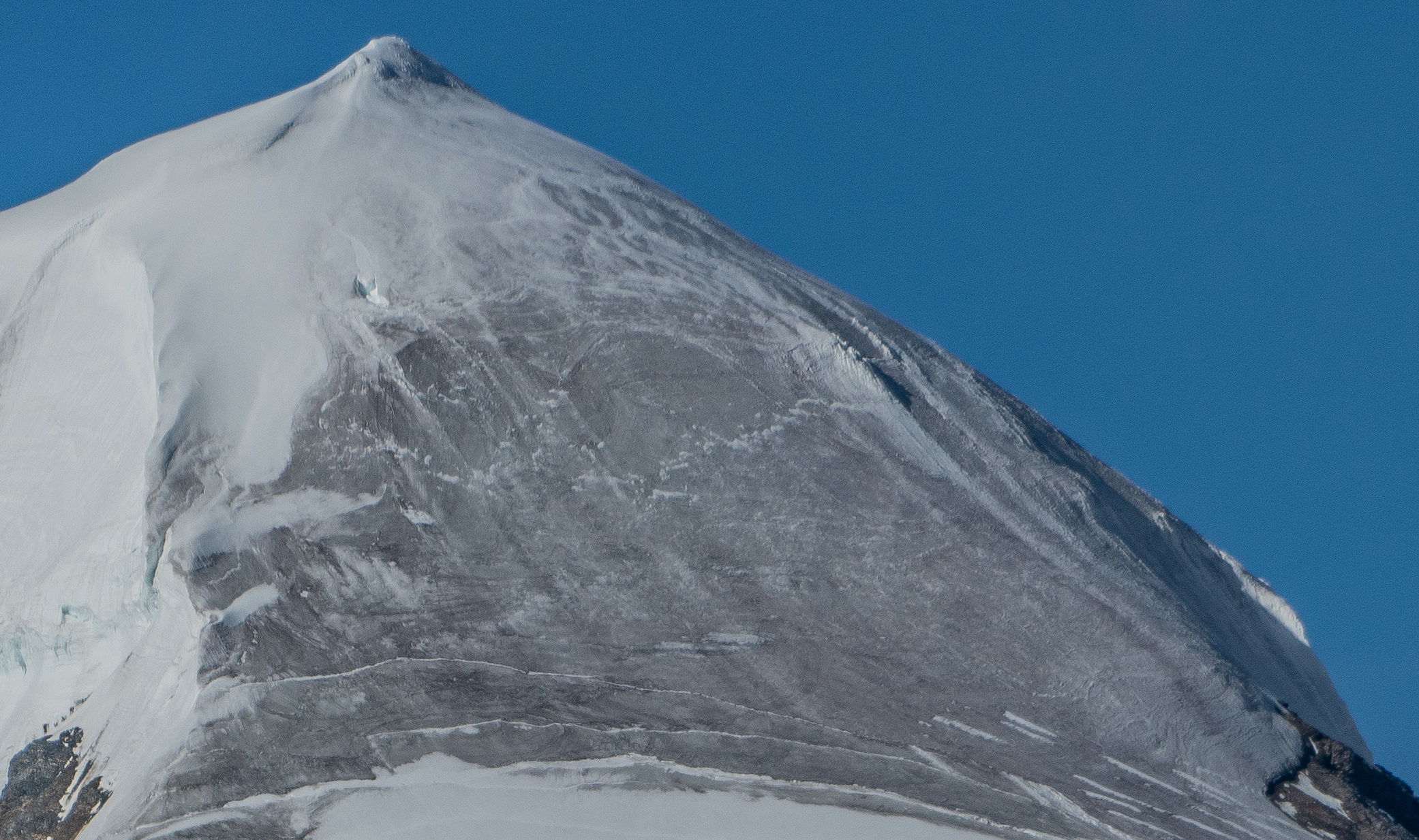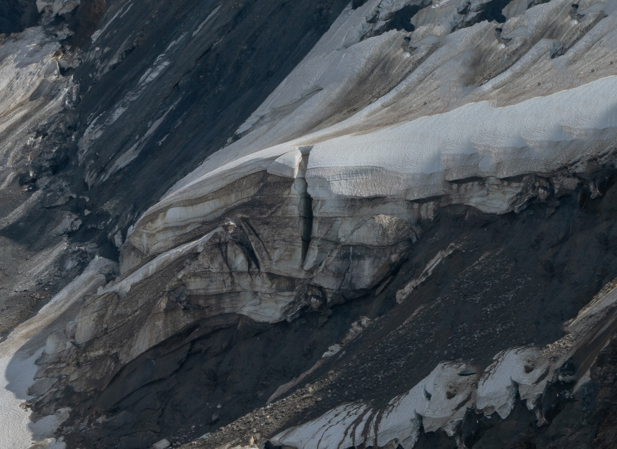 The part of the ridge past T3 was far more spectacular than the previous section: massive cornices transitioned seamlessly into hanging ice at the top of the Broken Glacier. From below, the Broken Glacier seems nearly extinct, but from above the ice is still quite crevassed and thick, despite decades of climate change accelerated thinning. I occasionally would carefully step out to the edge of the ridge and looked over, making sure I was on solid rock and not overhanging scree. Only once I saw fresh rocks falling below me and wisely step back a few paces, but for the most part the ridge was quite secure. The thick hanging ice below me was gobsmackingly beautiful and I could see various layers of snow.